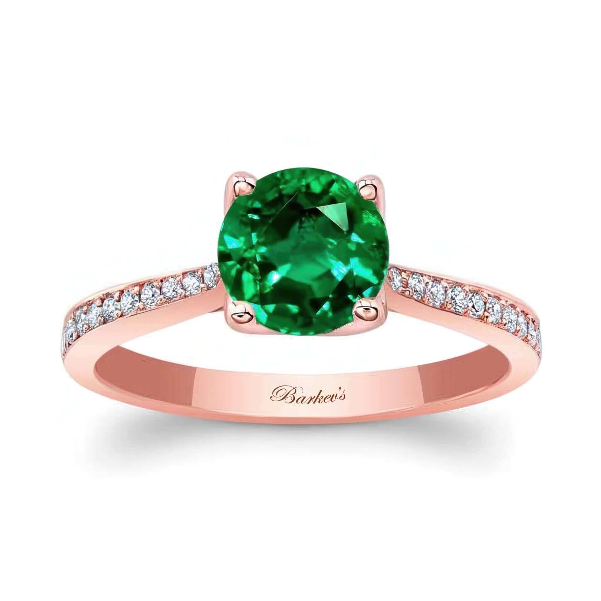 This classic emerald and diamond engagement ring is graced with a delicate shank that meets the prong set round center with glamorous pave set diamonds on the sides adding a final touch of brilliance.