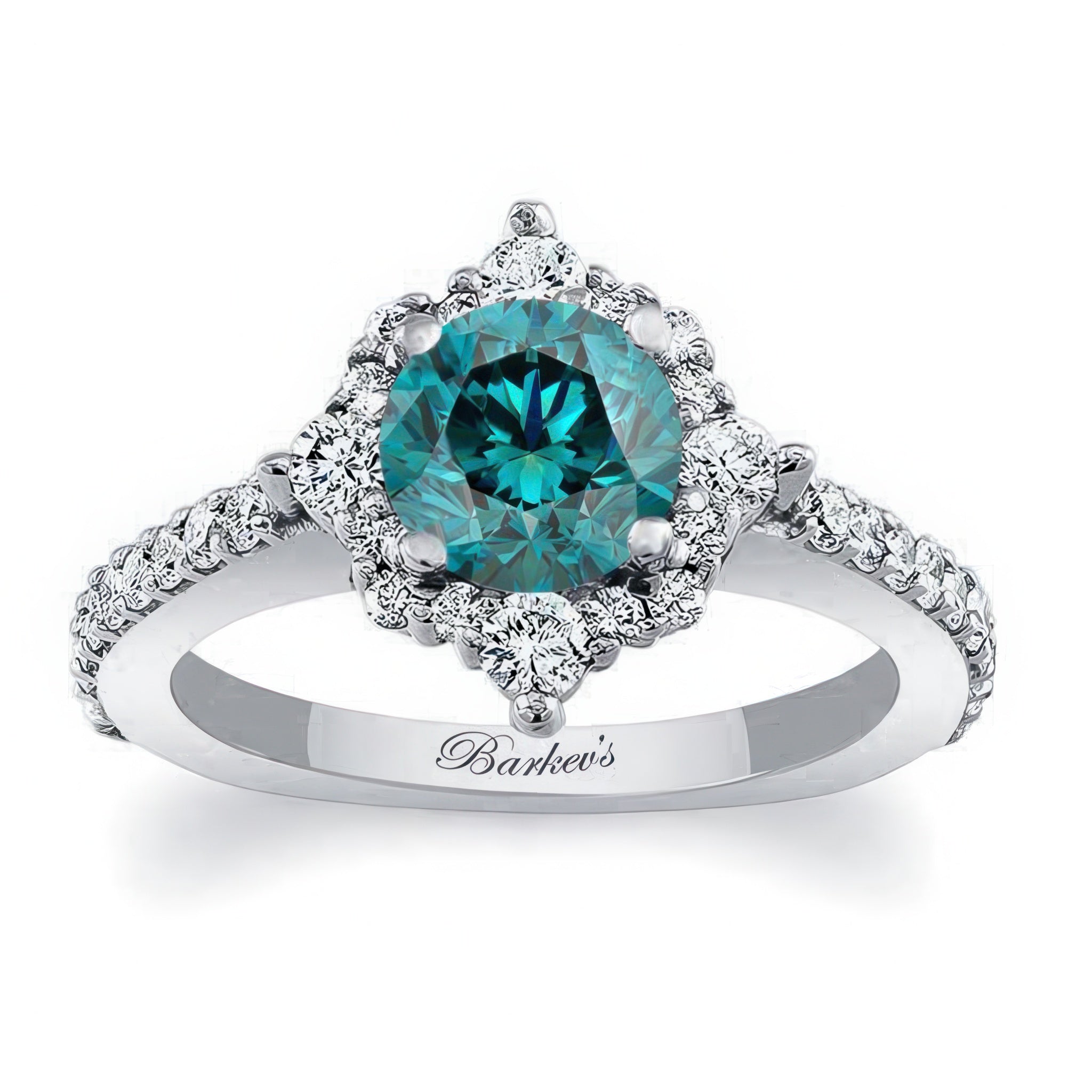This classic halo blue and white diamond engagement ring features a prong set round center artfully embellished with diamonds for a twist on the traditional halo ring. The narrow shank is set with shared prong set diamonds for an elegant finish.
