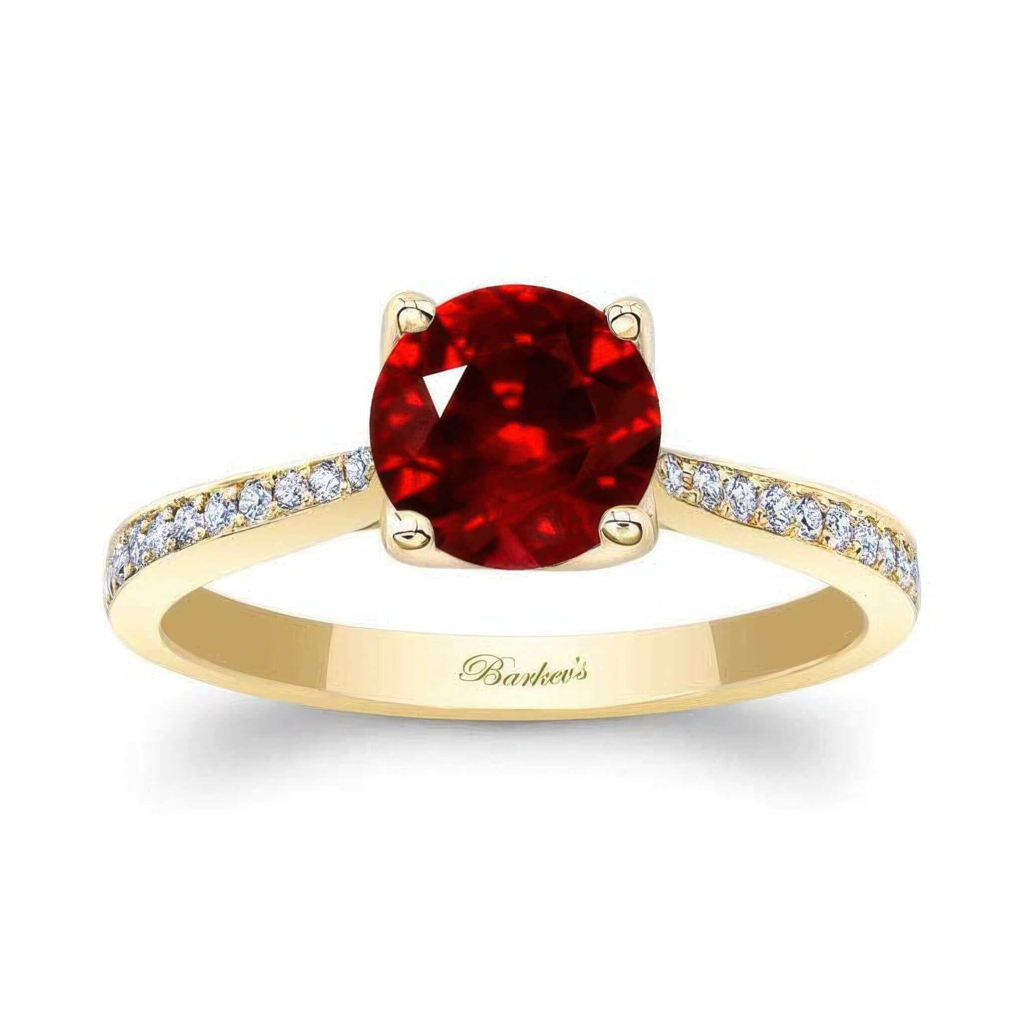 This classic lab grown ruby and diamond engagement ring is graced with a delicate shank that meets the prong set round center with glamorous pave set diamonds on the sides adding a final touch of brilliance.