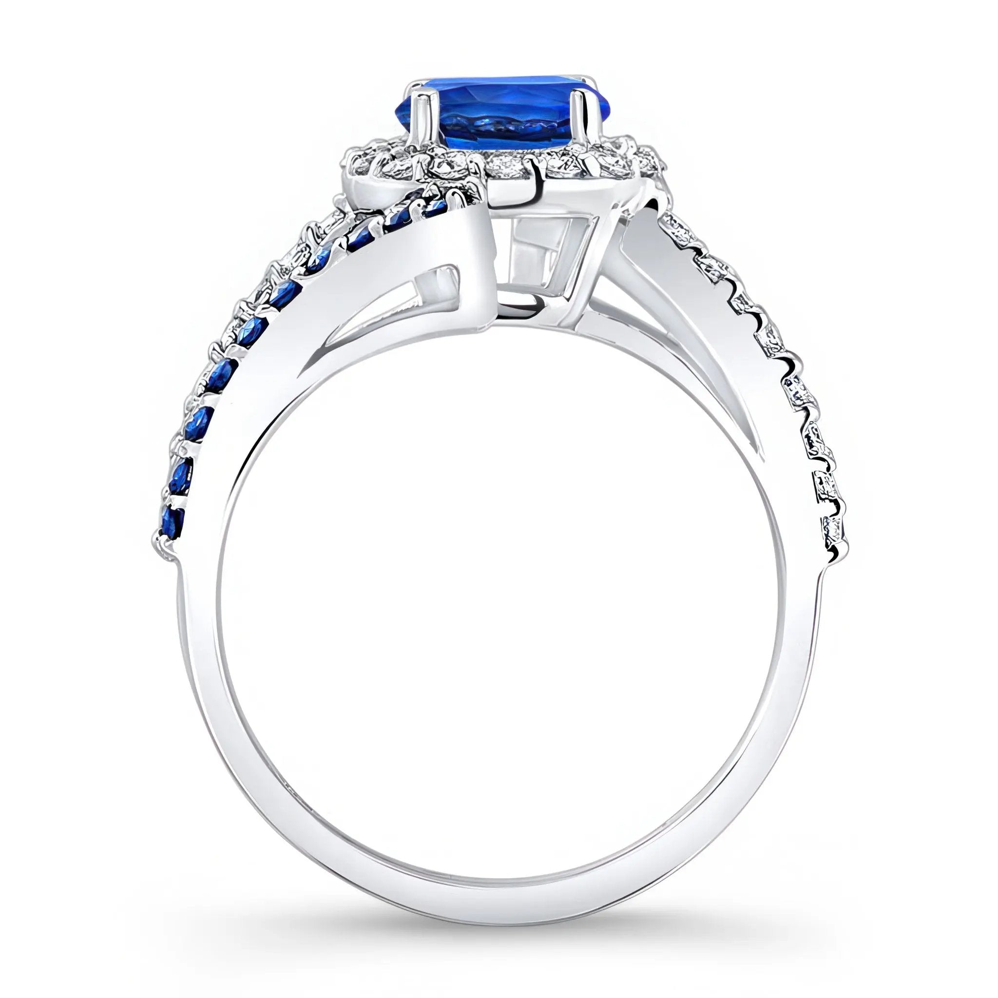 This contemporary blue sapphire engagement ring features a prong set round center encircled with a diamond halo and a split shank adorned with shared prong set blue sapphires and diamonds for an added touch of elegance.