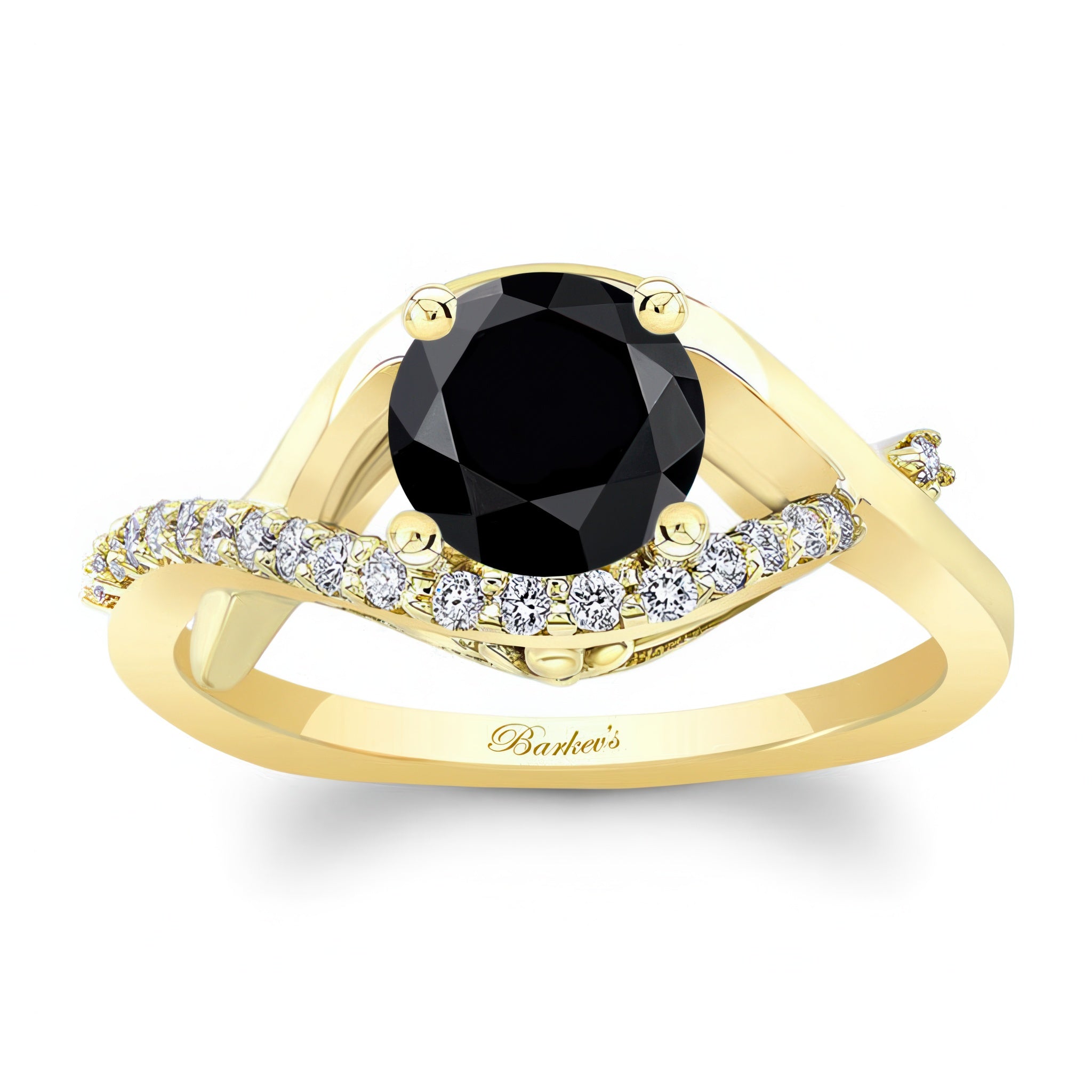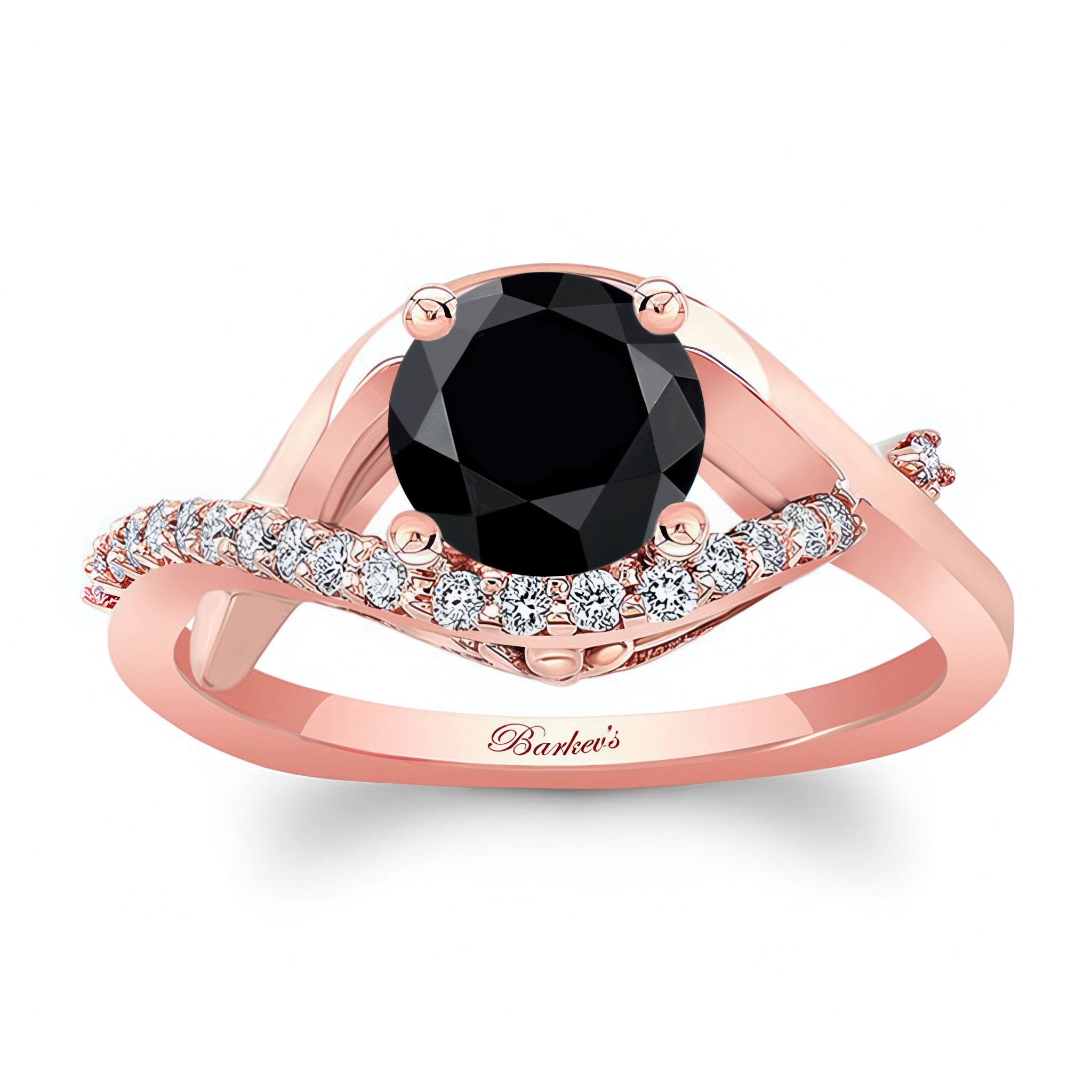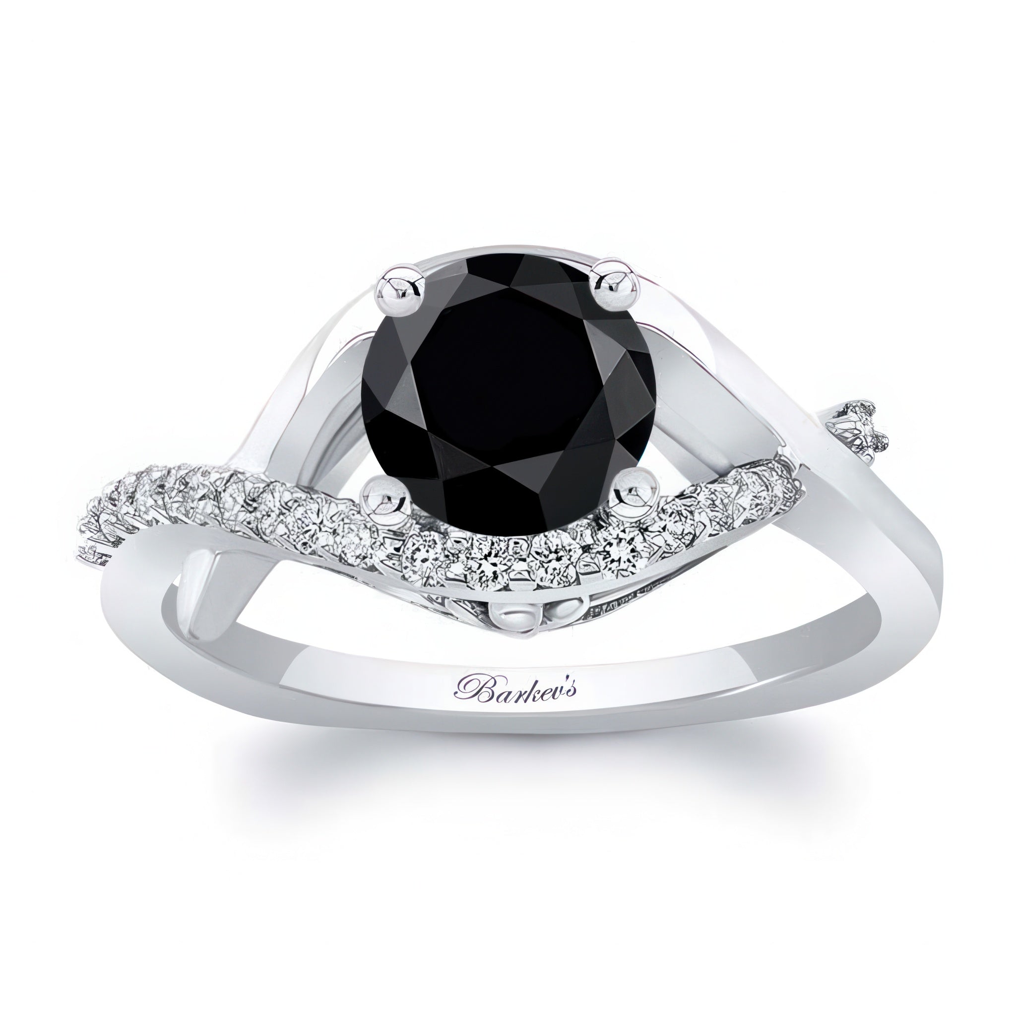 This criss cross black and white diamond engagement ring features a prong set round center that stands gracefully in the middle of the curving open frame with one of the curves adorned with shared prong set diamonds for a dazzling work of art.