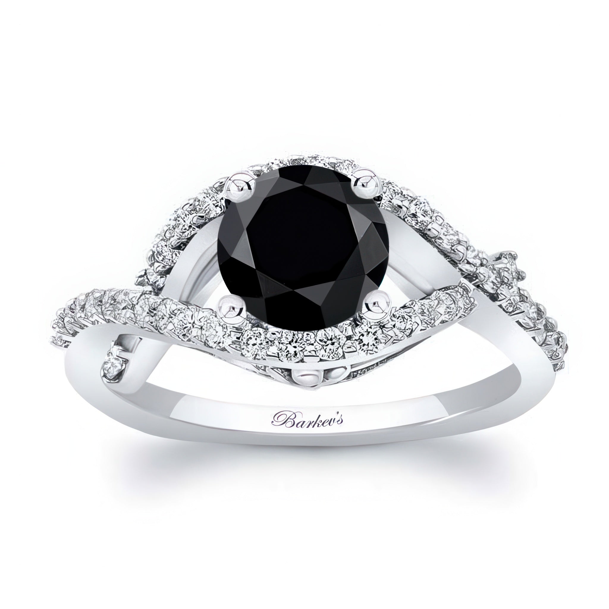 This criss cross black and white diamond ring features a prong set round center with an open curving frame that's adorned with shared prong set diamonds for a sparkling work of art.