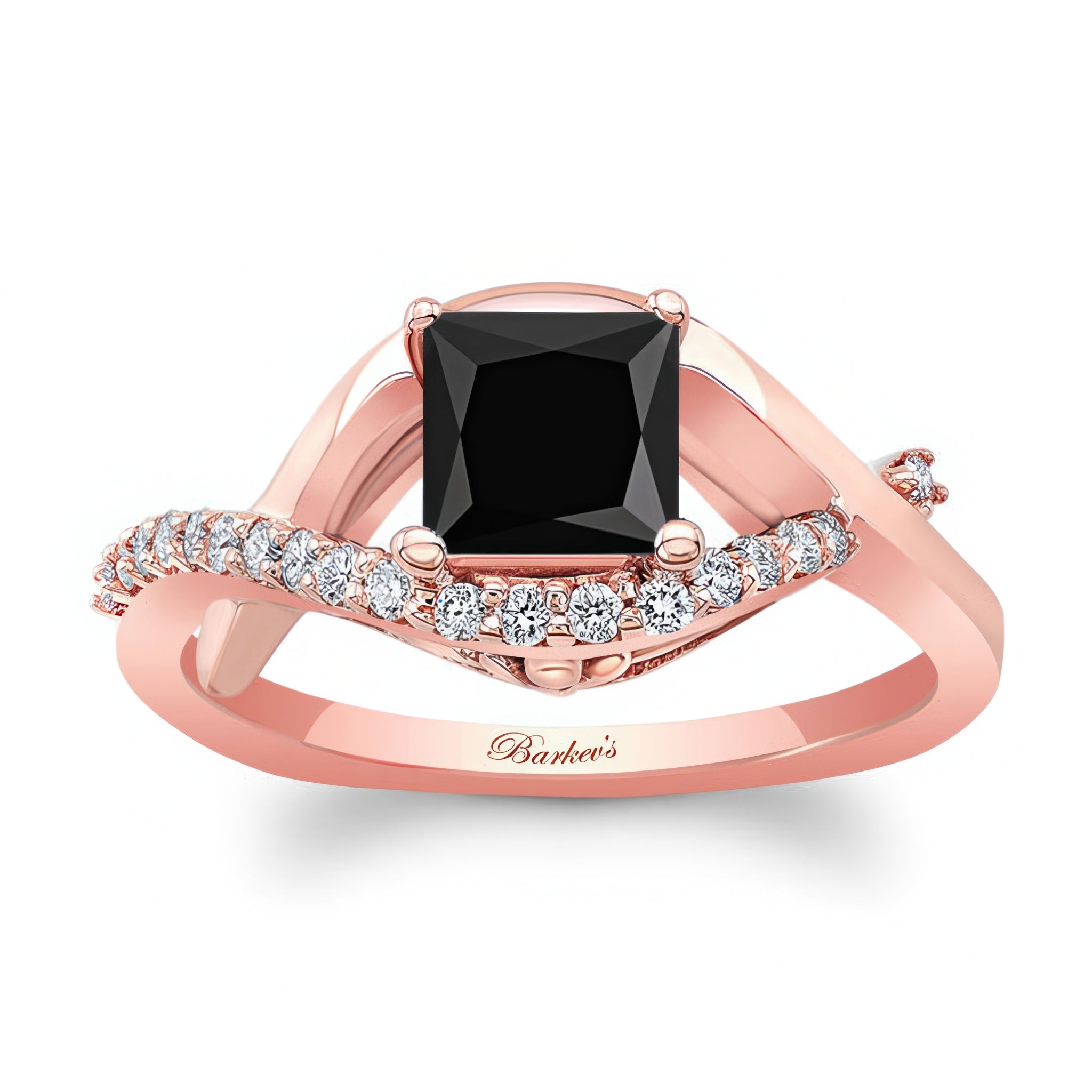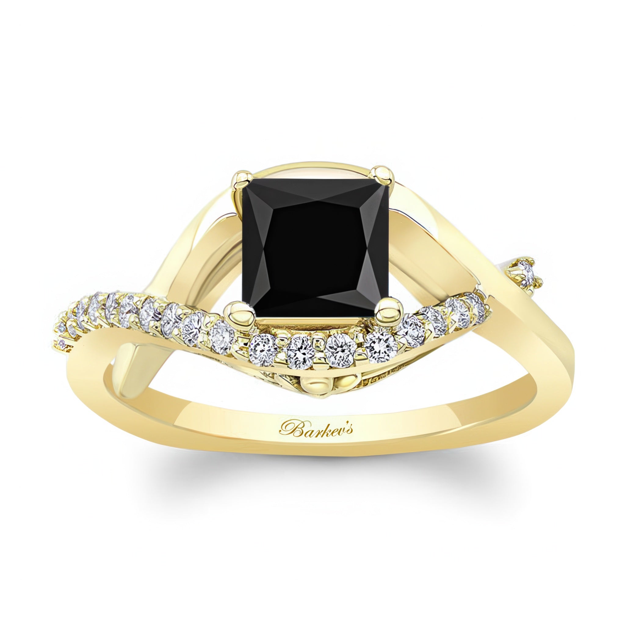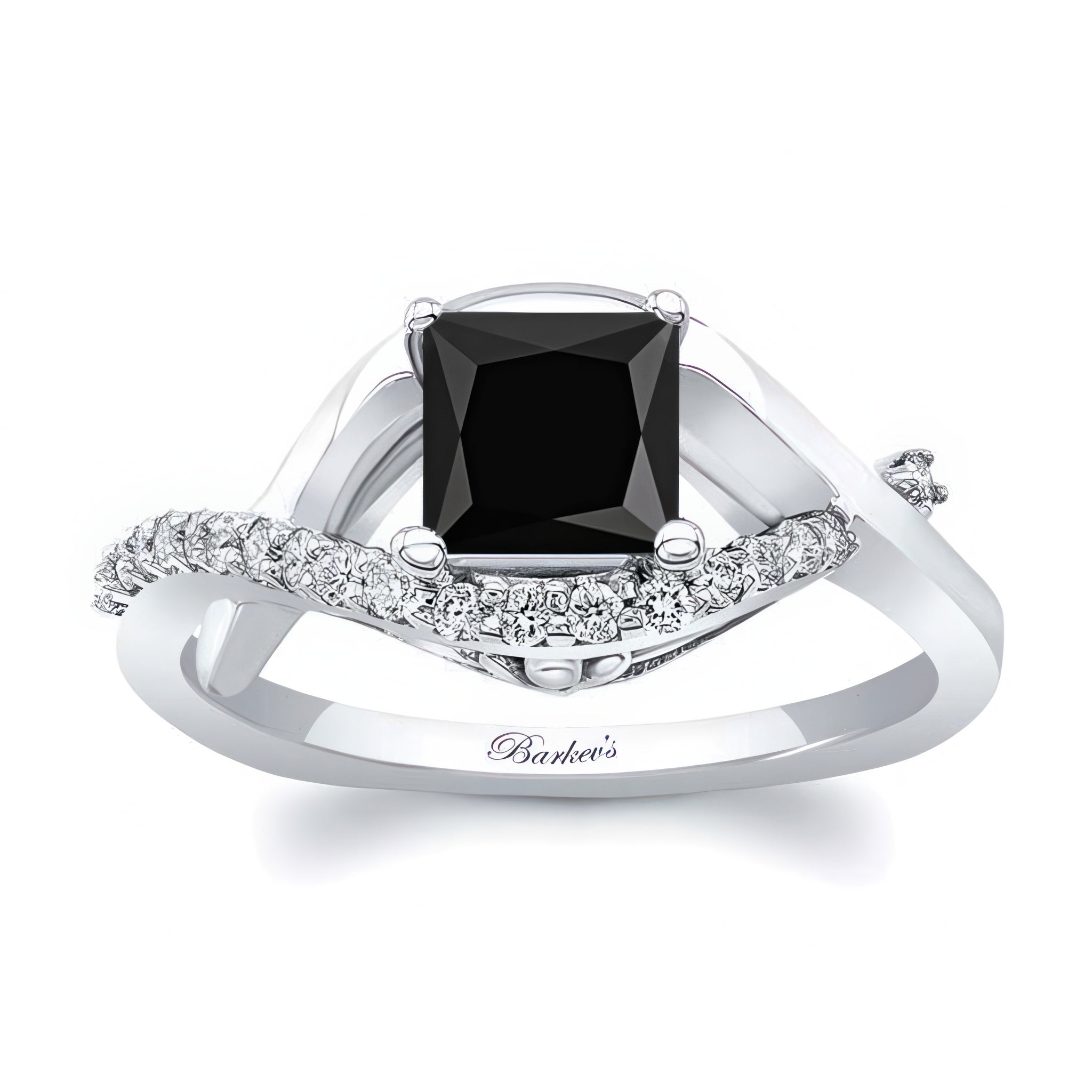 This criss cross princess cut black and white diamond engagement ring features a prong set center that stands gracefully in the middle of the curving open frame with one of the curves adorned with shared prong set diamonds for a dazzling work of art.