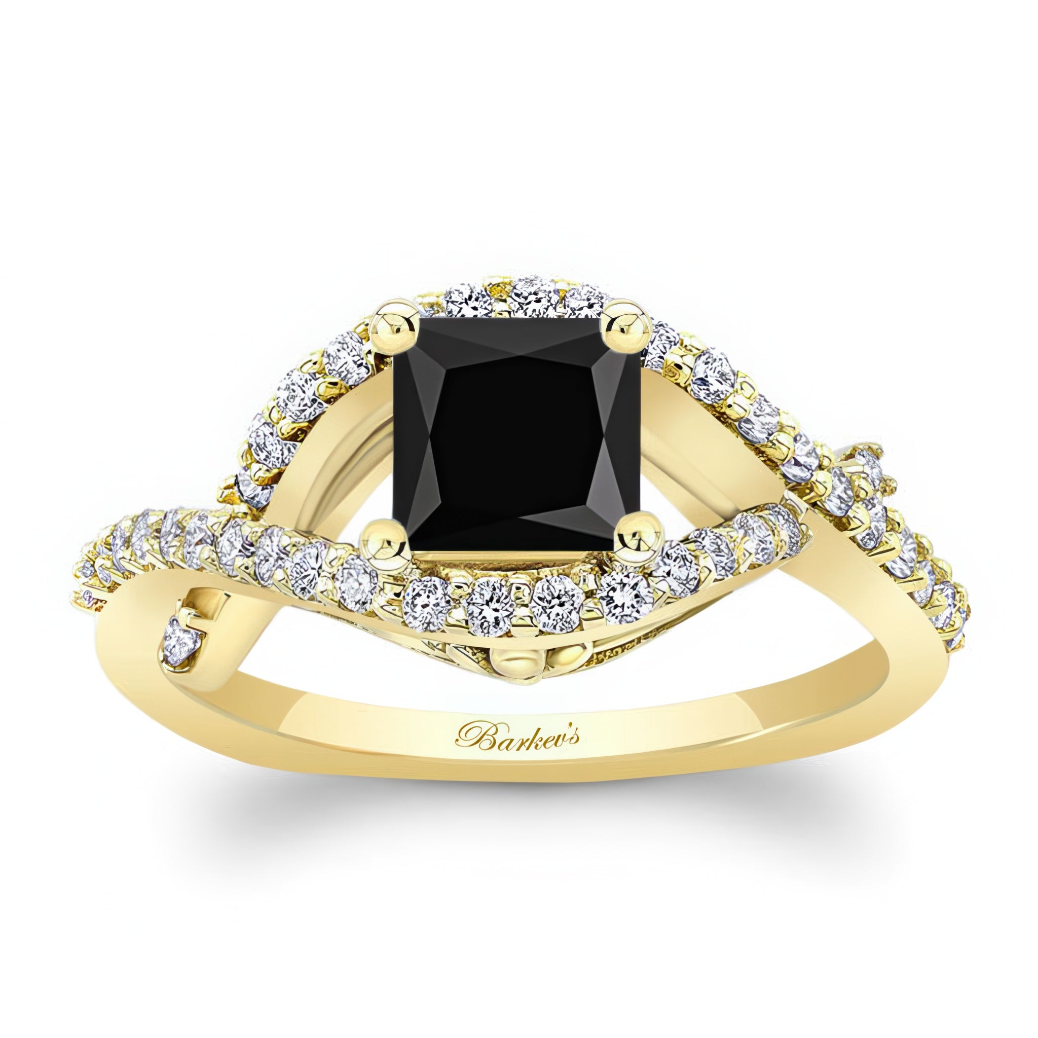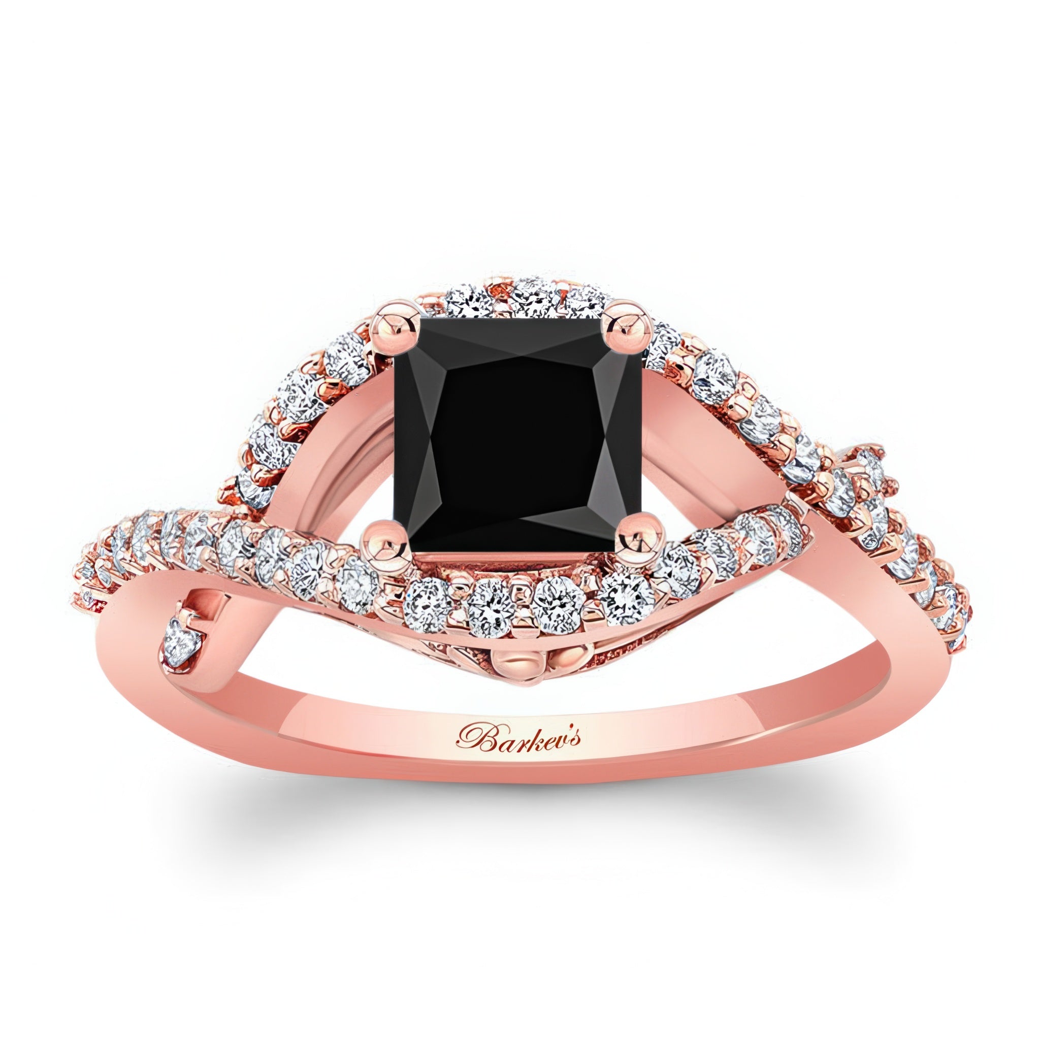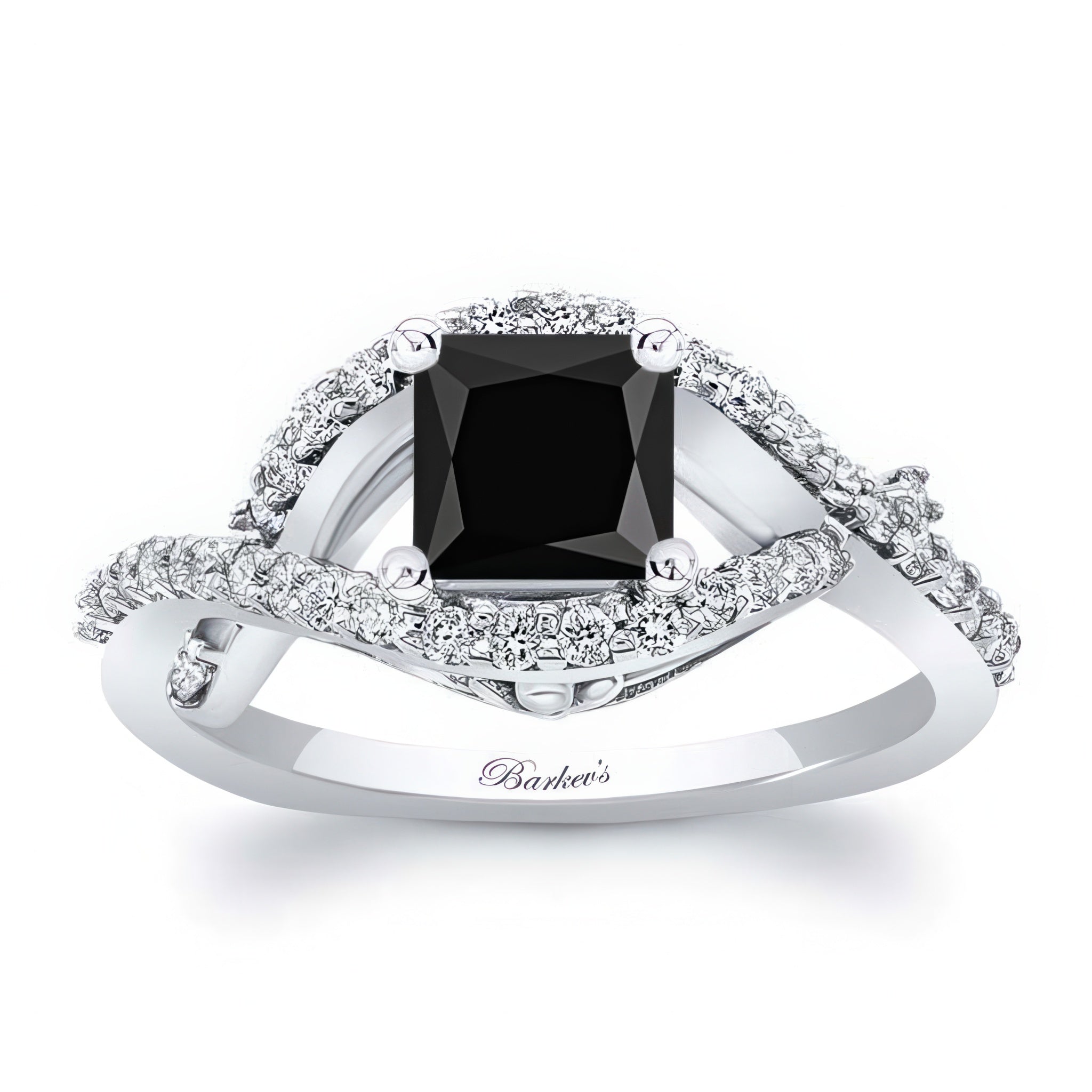 This criss cross princess cut black and white diamond ring features a prong set center with an open curving frame adorned with shared prong set diamonds for a sparkling work of art.