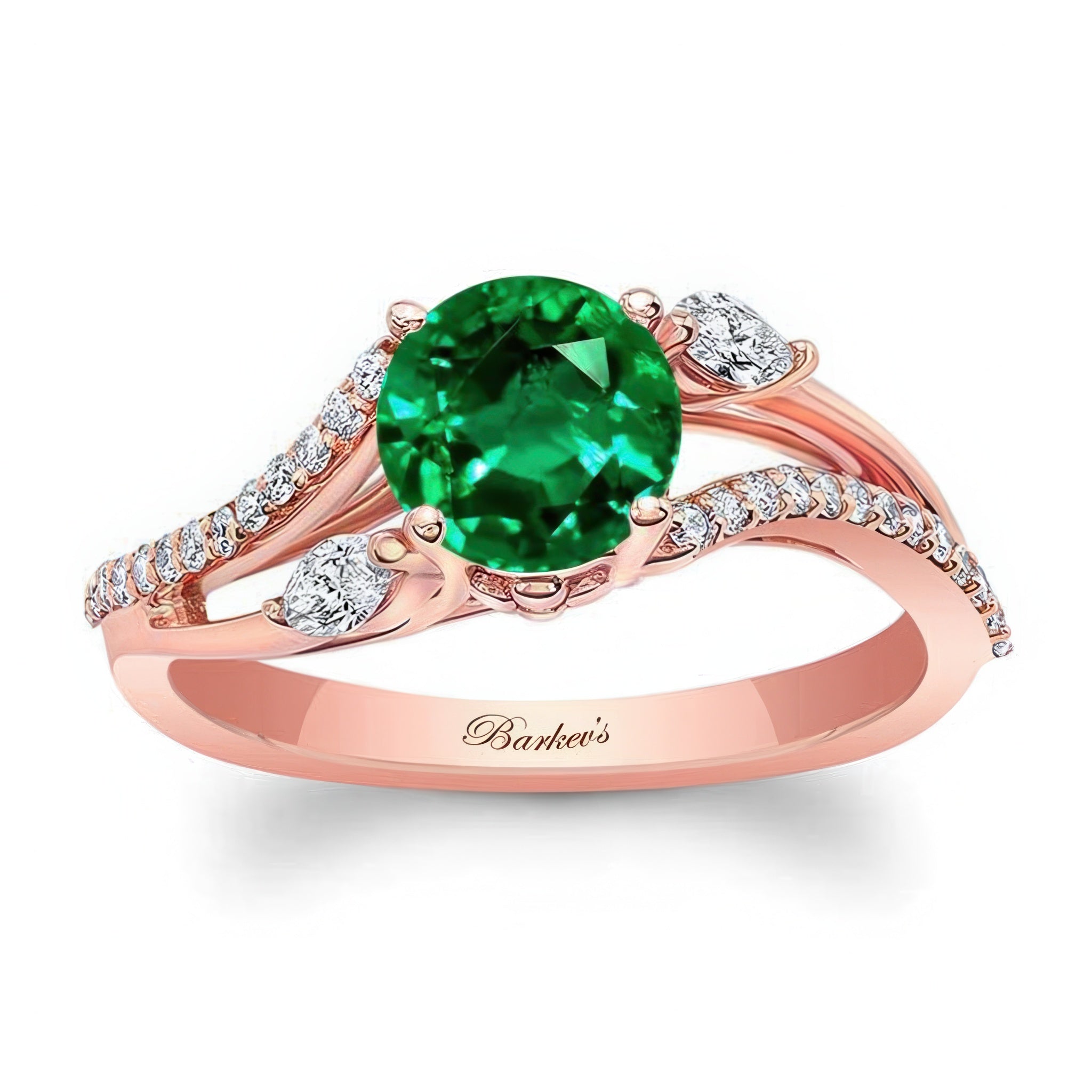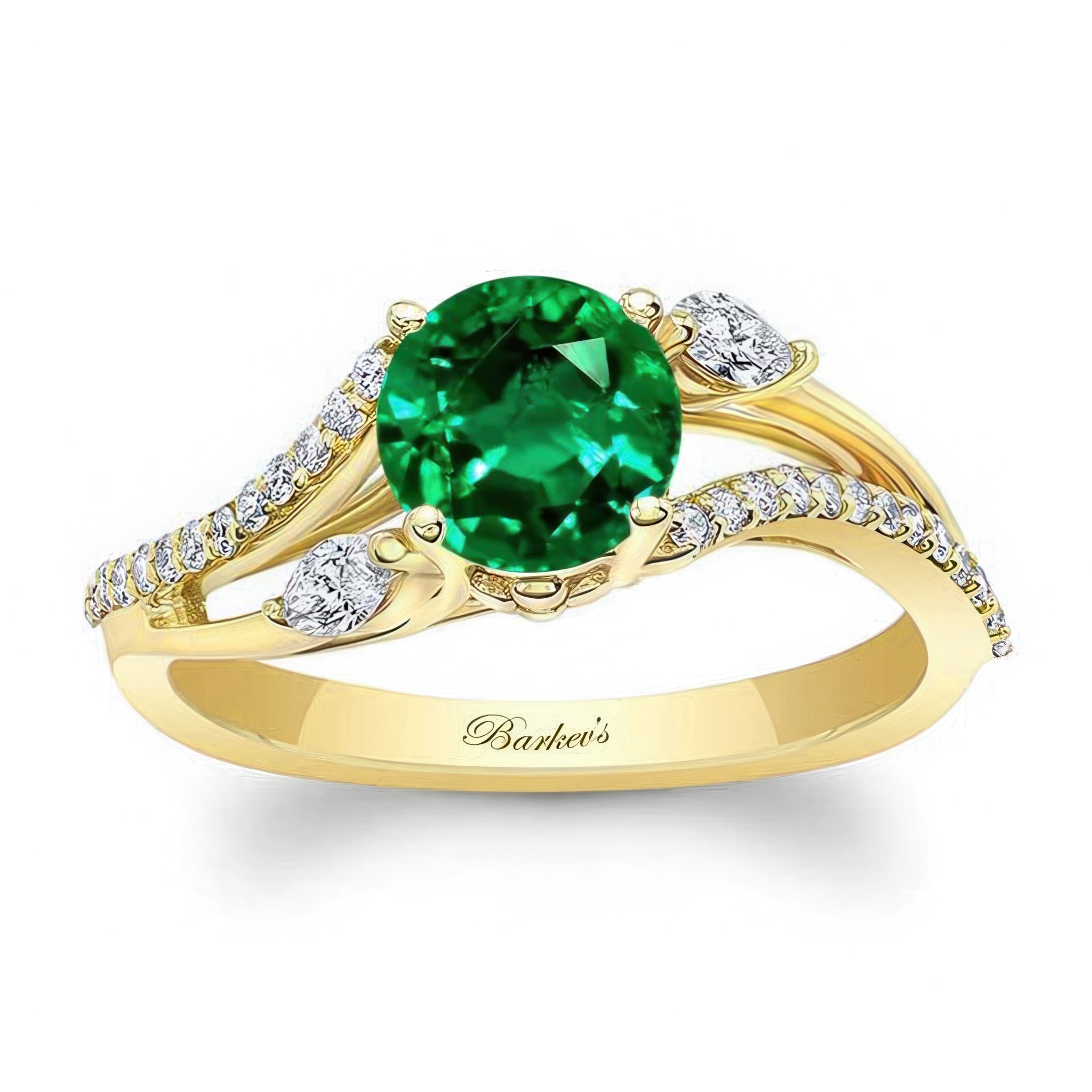 An impressive curved split shank emerald and diamond ring featuring a prong set round center accented with round and marquise cut diamonds flanking the shoulders for a unique flare.