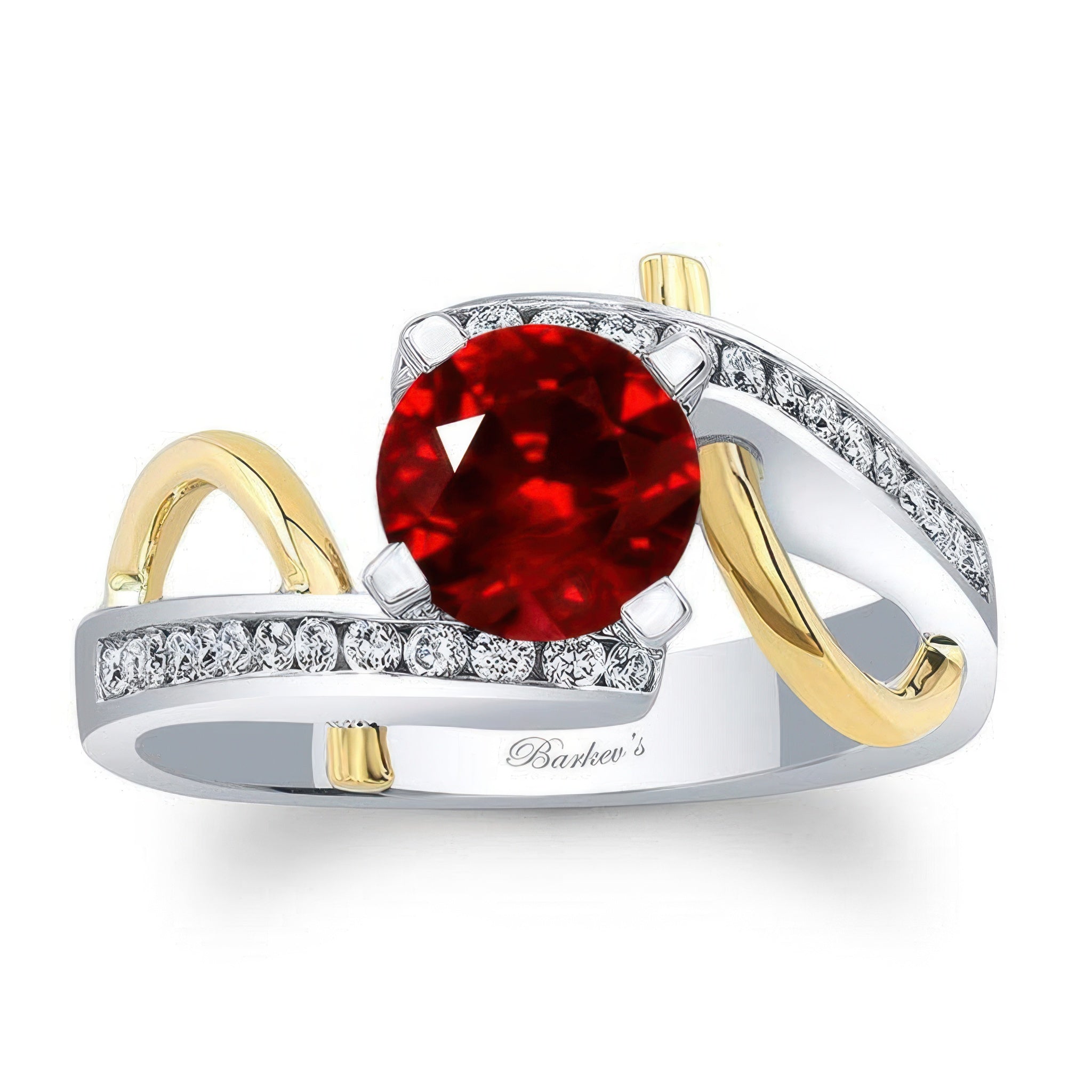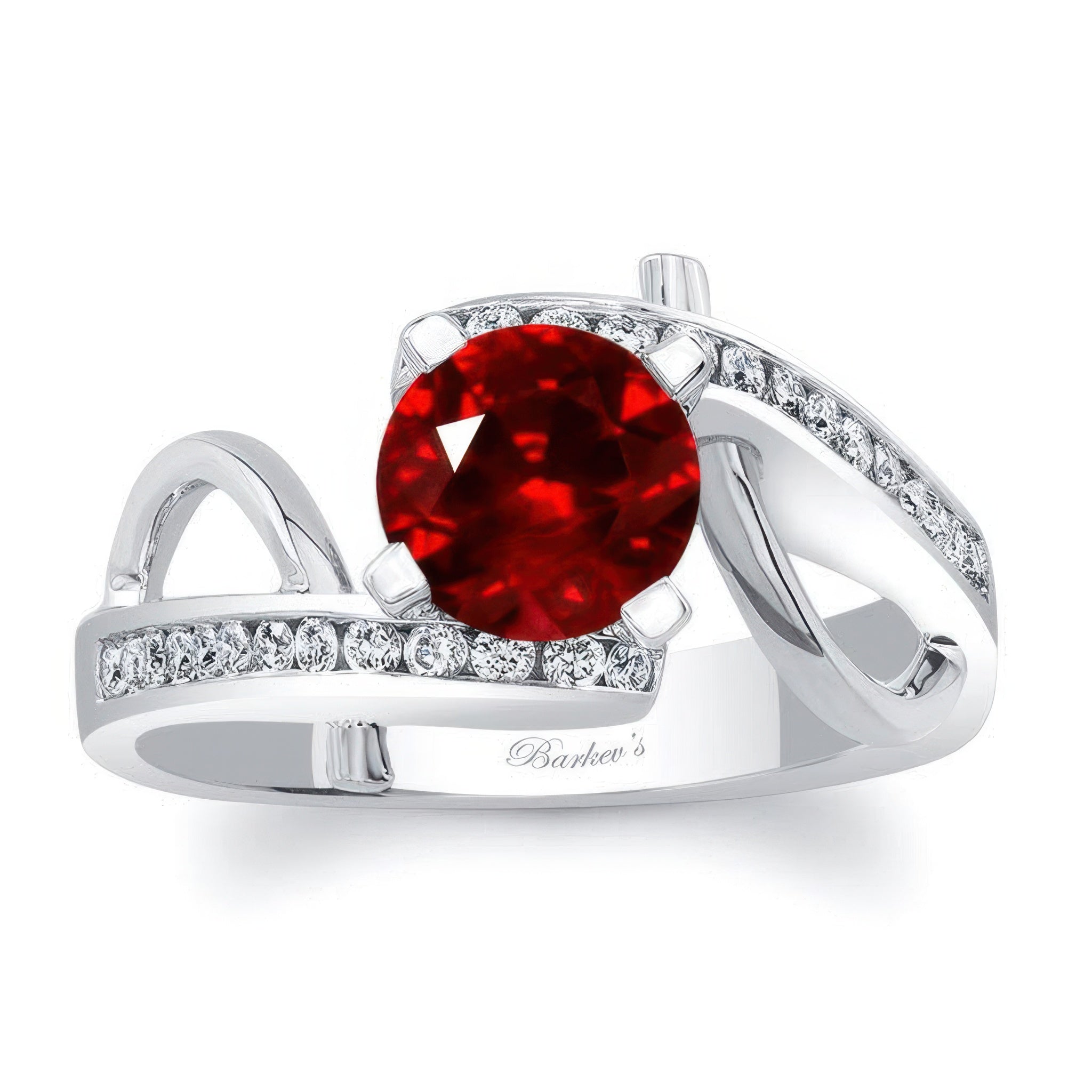 This curved trim lab ruby and diamond engagement ring features a prong set round center with channel set diamonds on the shoulders and a wire trim that curves into the shank on both sides for a dramatic artistic flare.