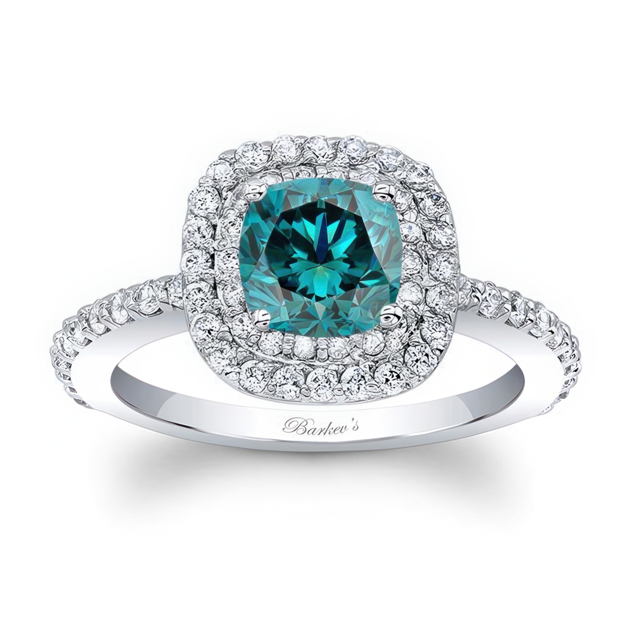Cushion Cut Blue And White Diamond Double Halo Engagement Ring