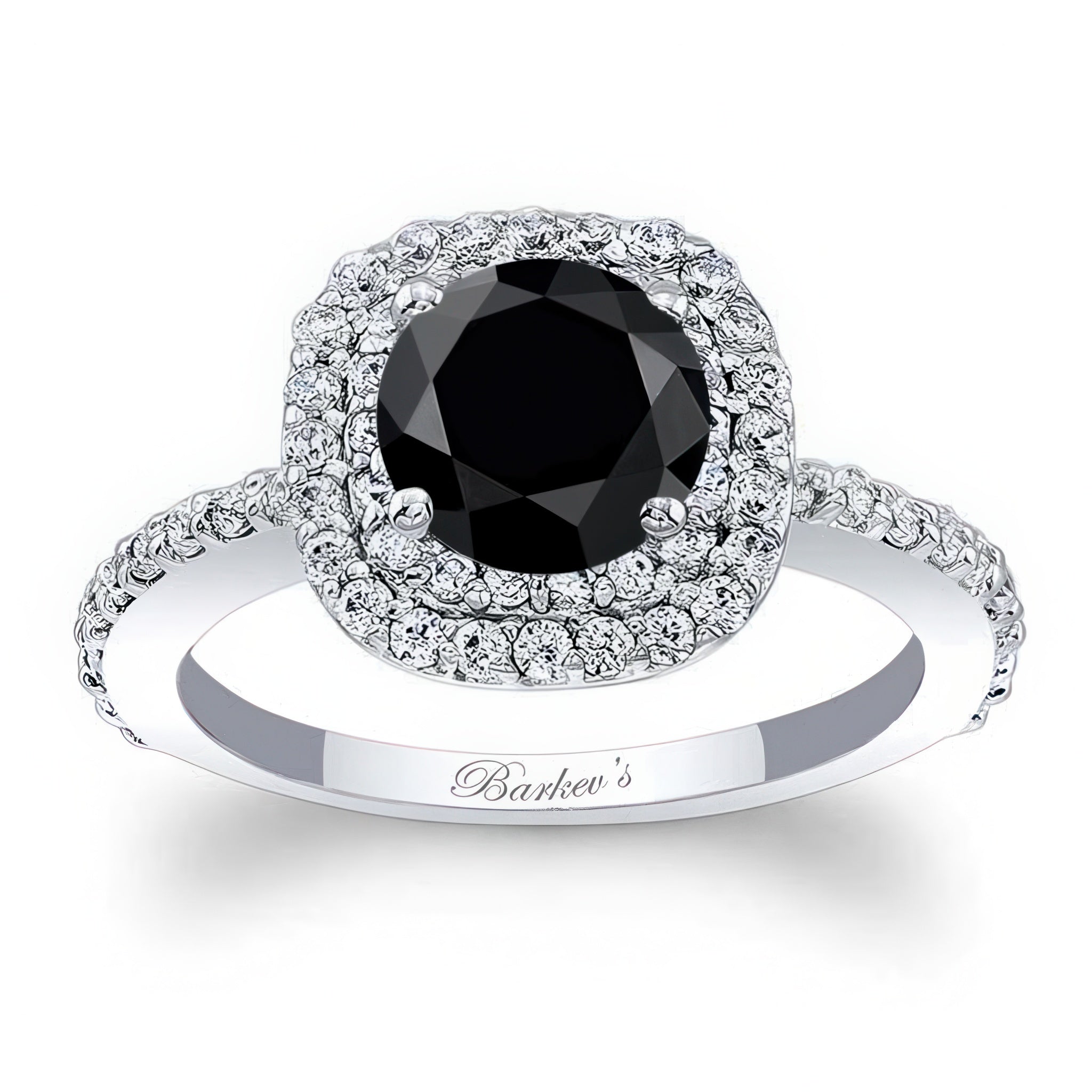 This double halo round black and white diamond engagement ring will capture the eye of many admirers. Featuring shared prong set diamonds adorning the low profile prong set center and continuing down the dainty shank.