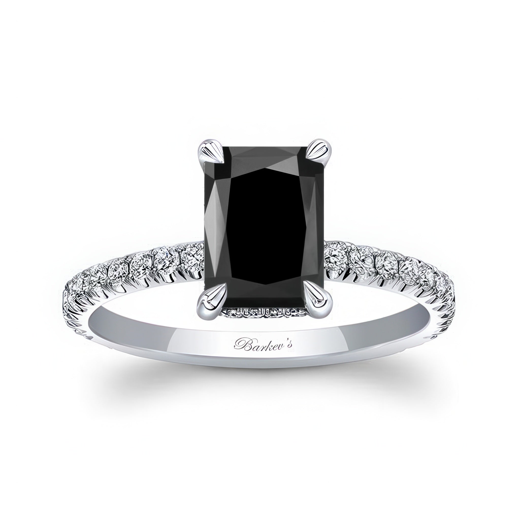 This extravagant radiant cut black and white diamond engagement ring will have people in awe. Underneath the center stone, lies a hidden halo, followed by beautiful, shared prong set diamonds flowing down the shank, exhibiting true elegance all around.