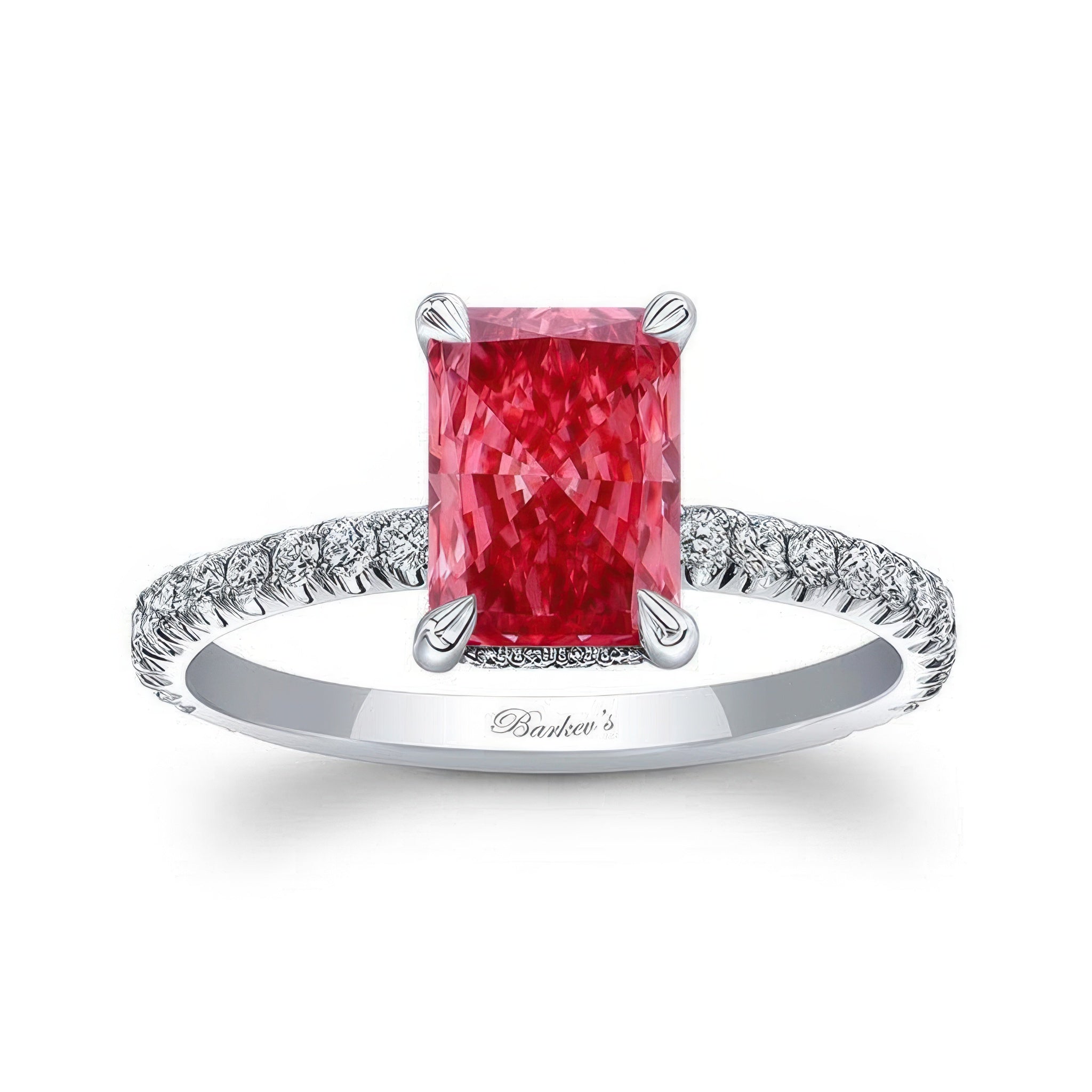 This extravagant radiant cut lab grown pink diamond engagement ring will have people in awe. Underneath the center stone, lies a hidden halo, followed by beautiful, shared prong set diamonds flowing down the shank, exhibiting true elegance all around.