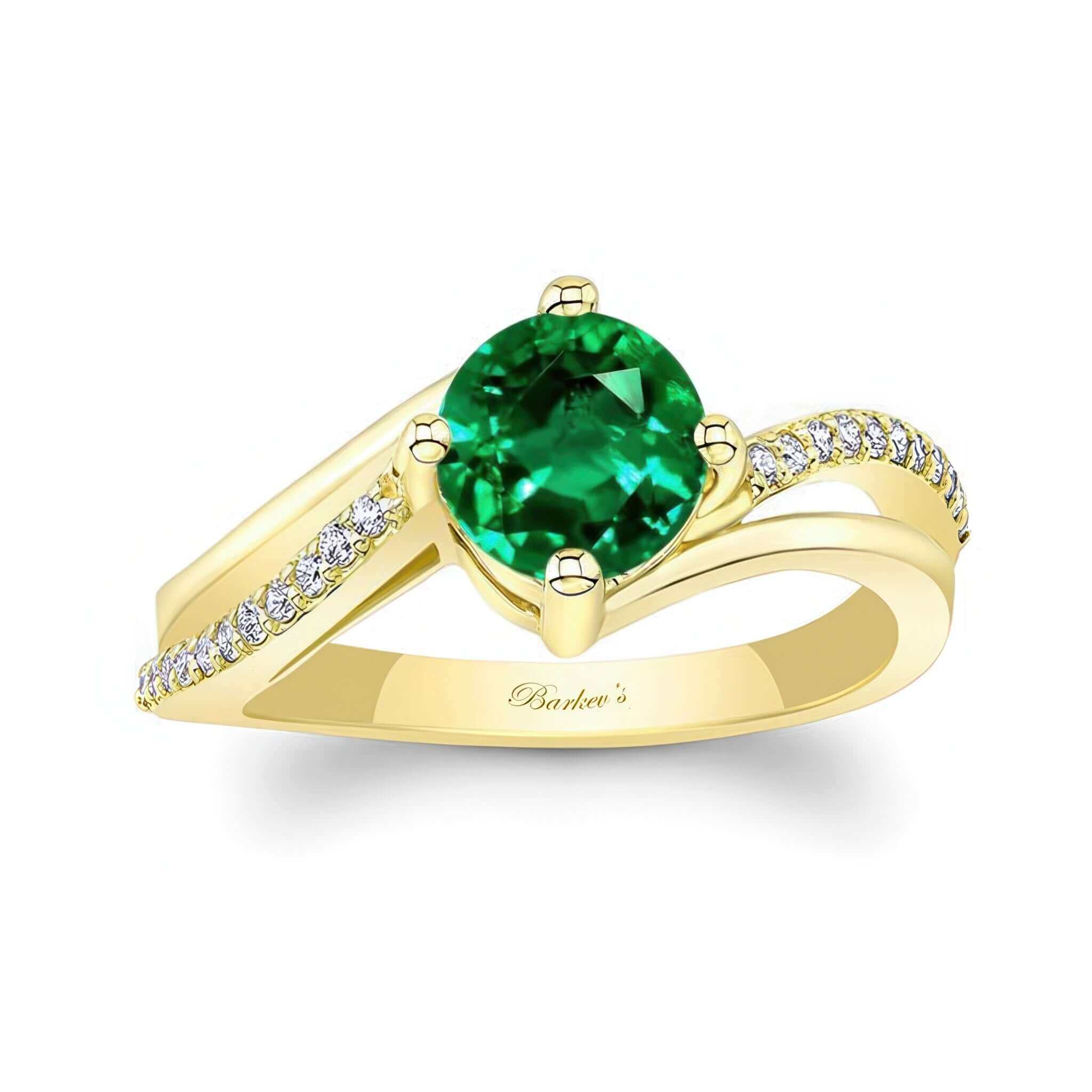 An emerald and diamond split shank engagement ring featuring a round center nestled between separated swirls adorned with diamonds for an extra touch of brilliance.