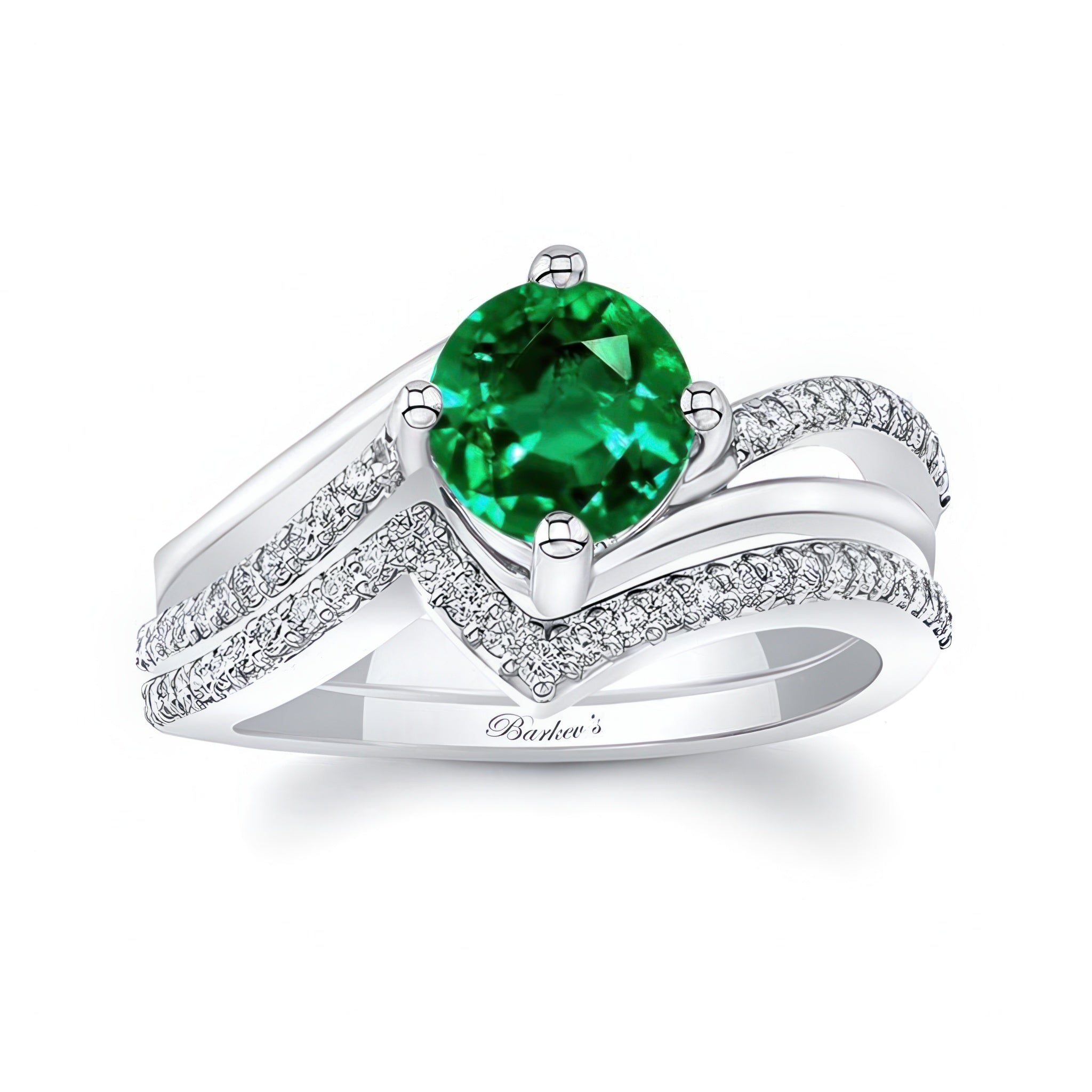 An emerald and diamond split shank wedding set featuring a round center nestled between separated swirls adorned with diamonds for an extra touch of brilliance. Comes with a matching wedding band.