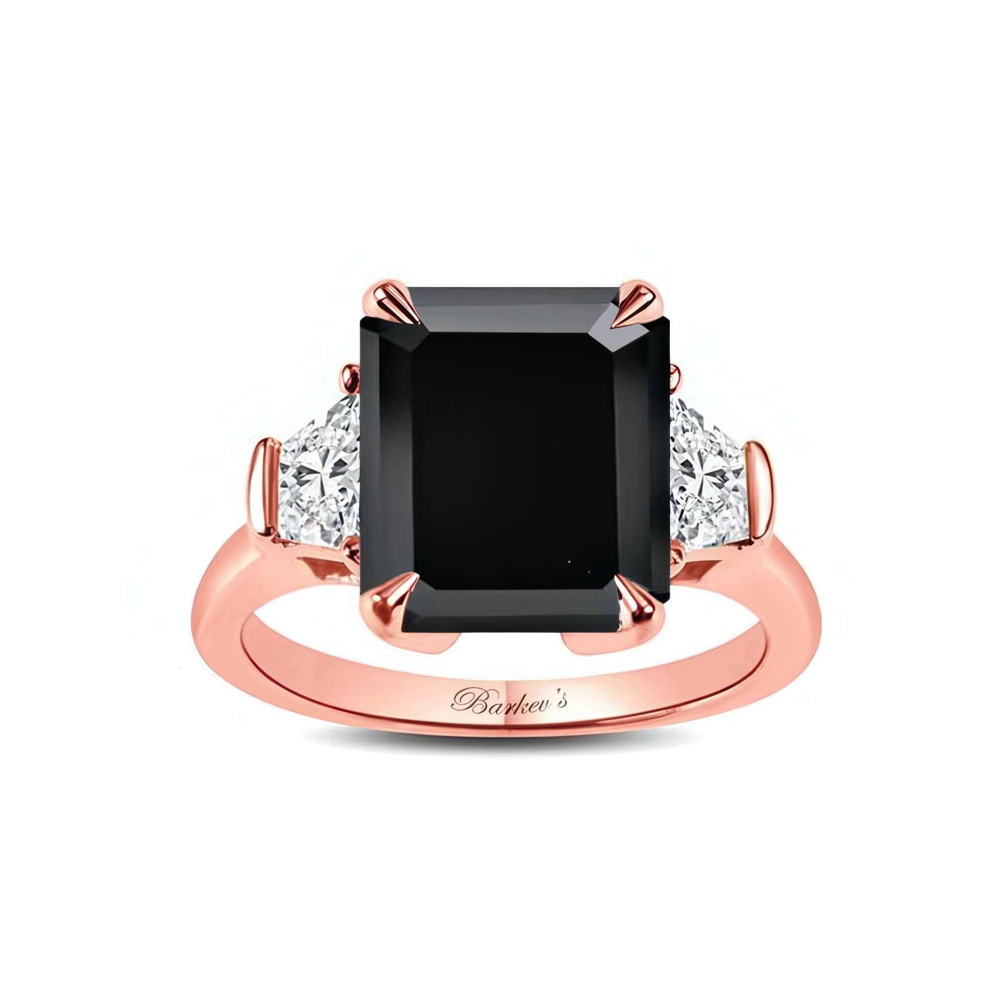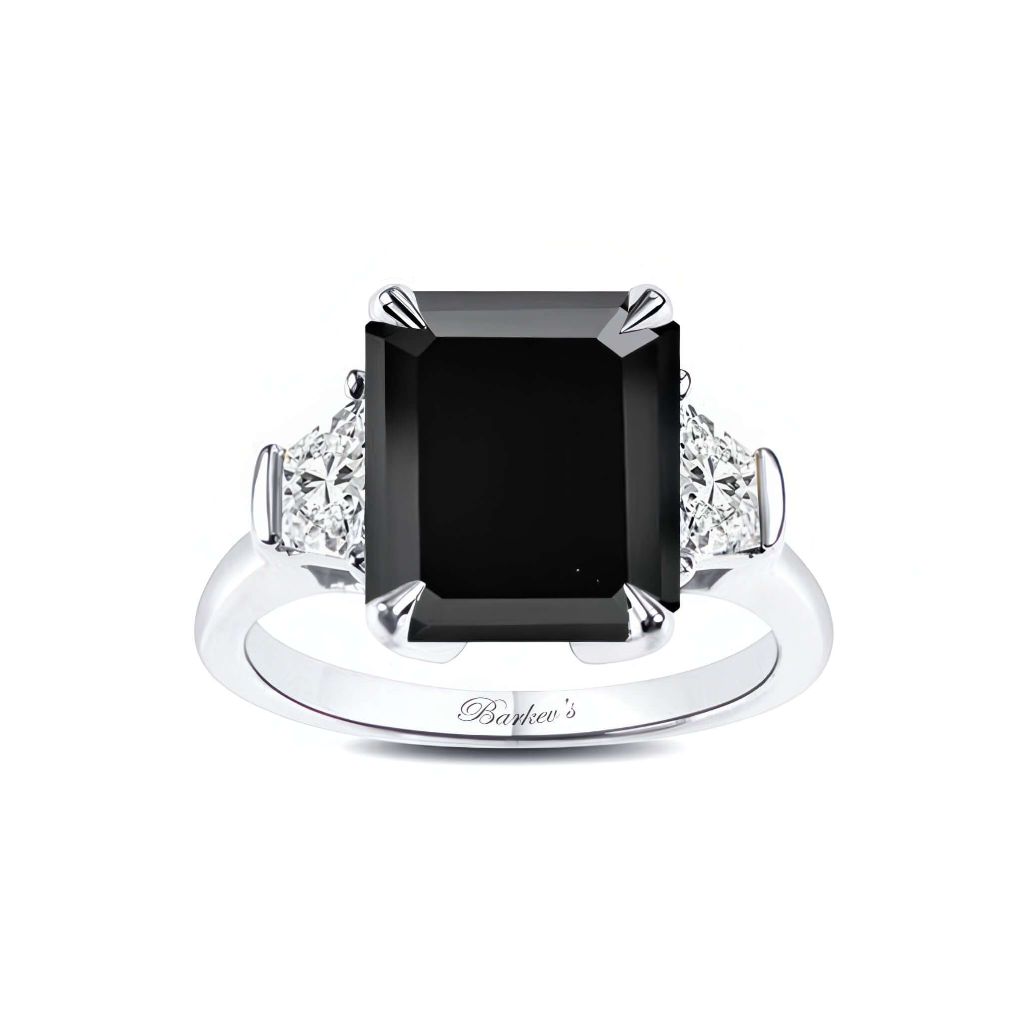 An incredible emerald cut 5 carat black diamond ring featuring a three stone design with an emerald cut center and trapezoid diamonds on each side for a unique look.