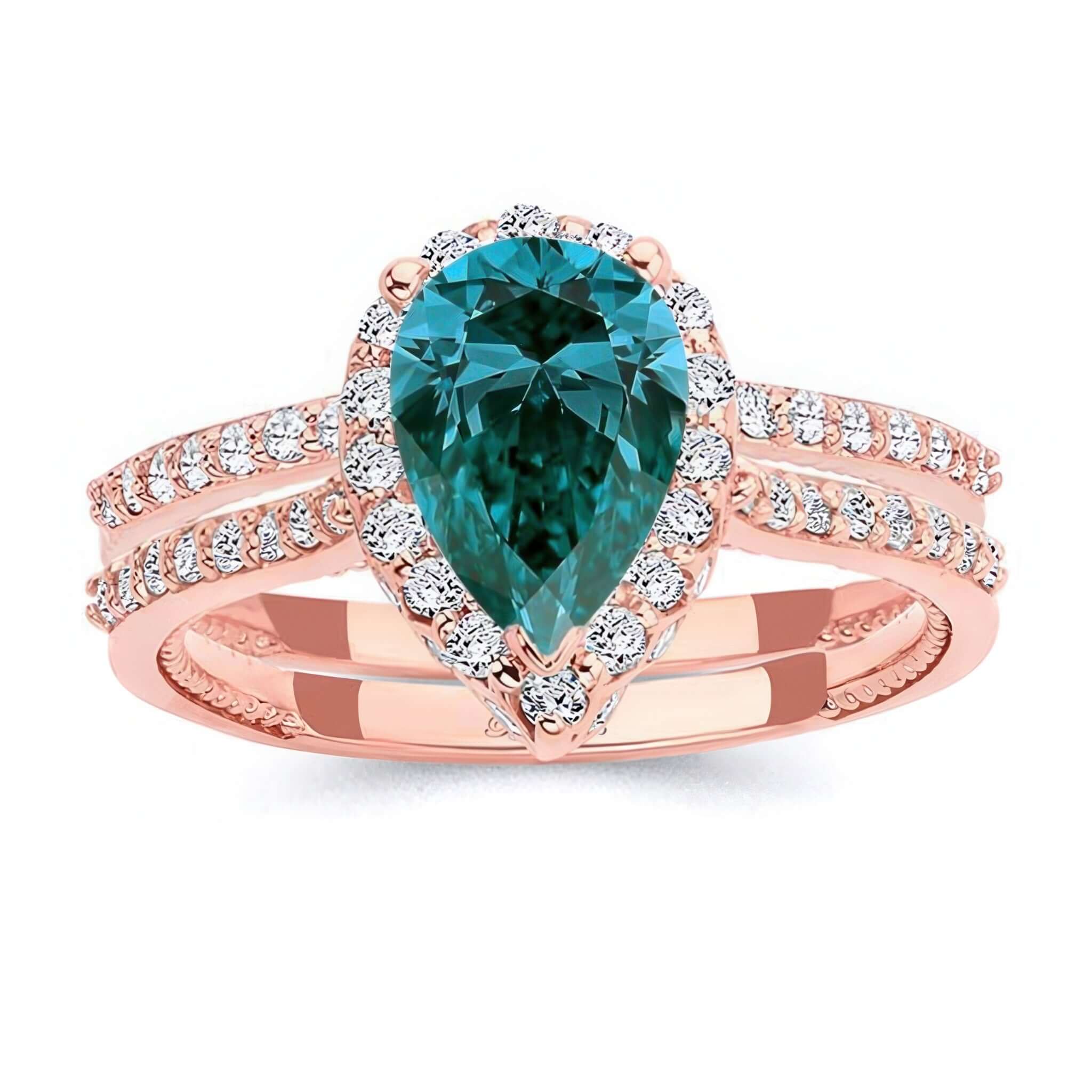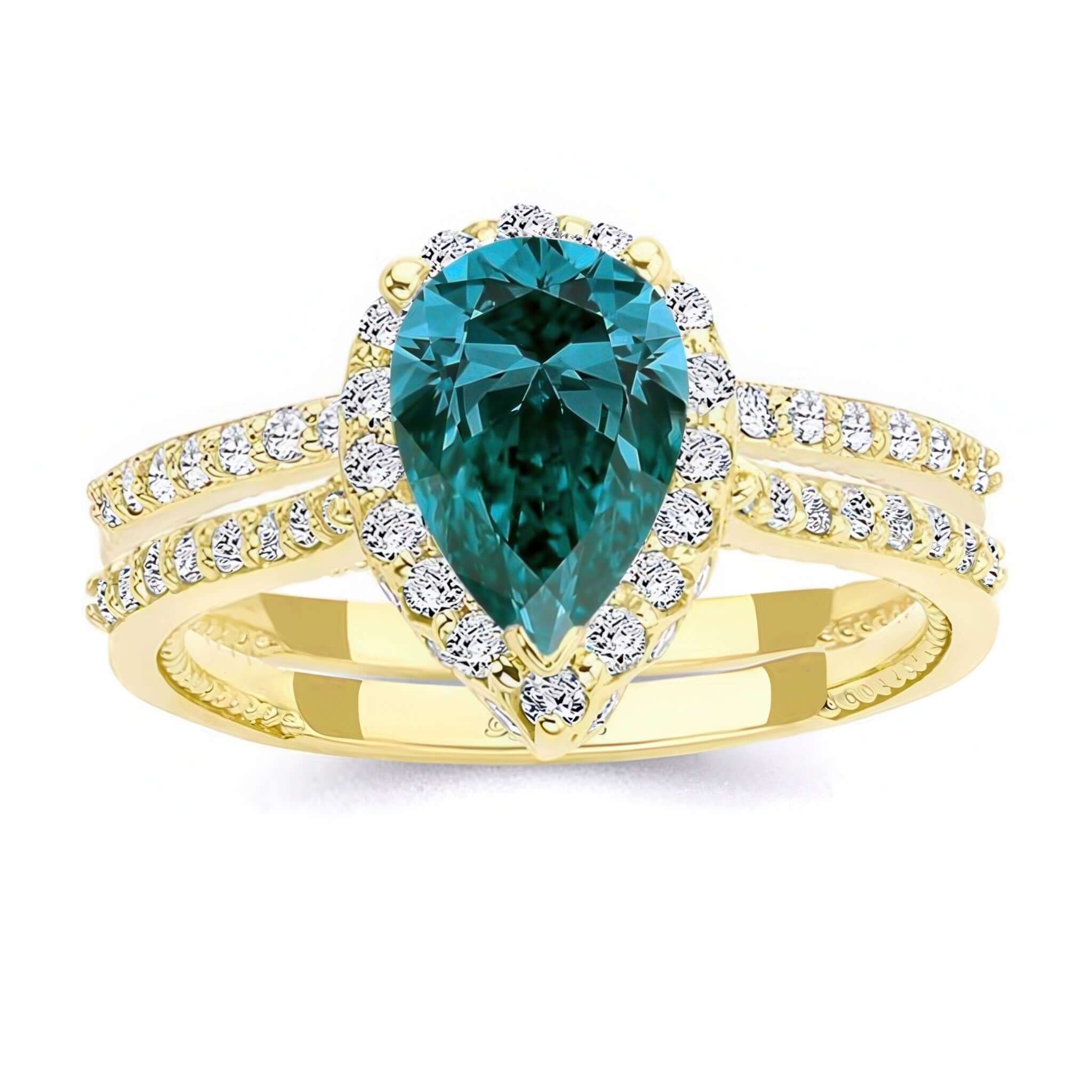 2 Carat Pear Shaped Blue And White Diamond Halo Ring Set