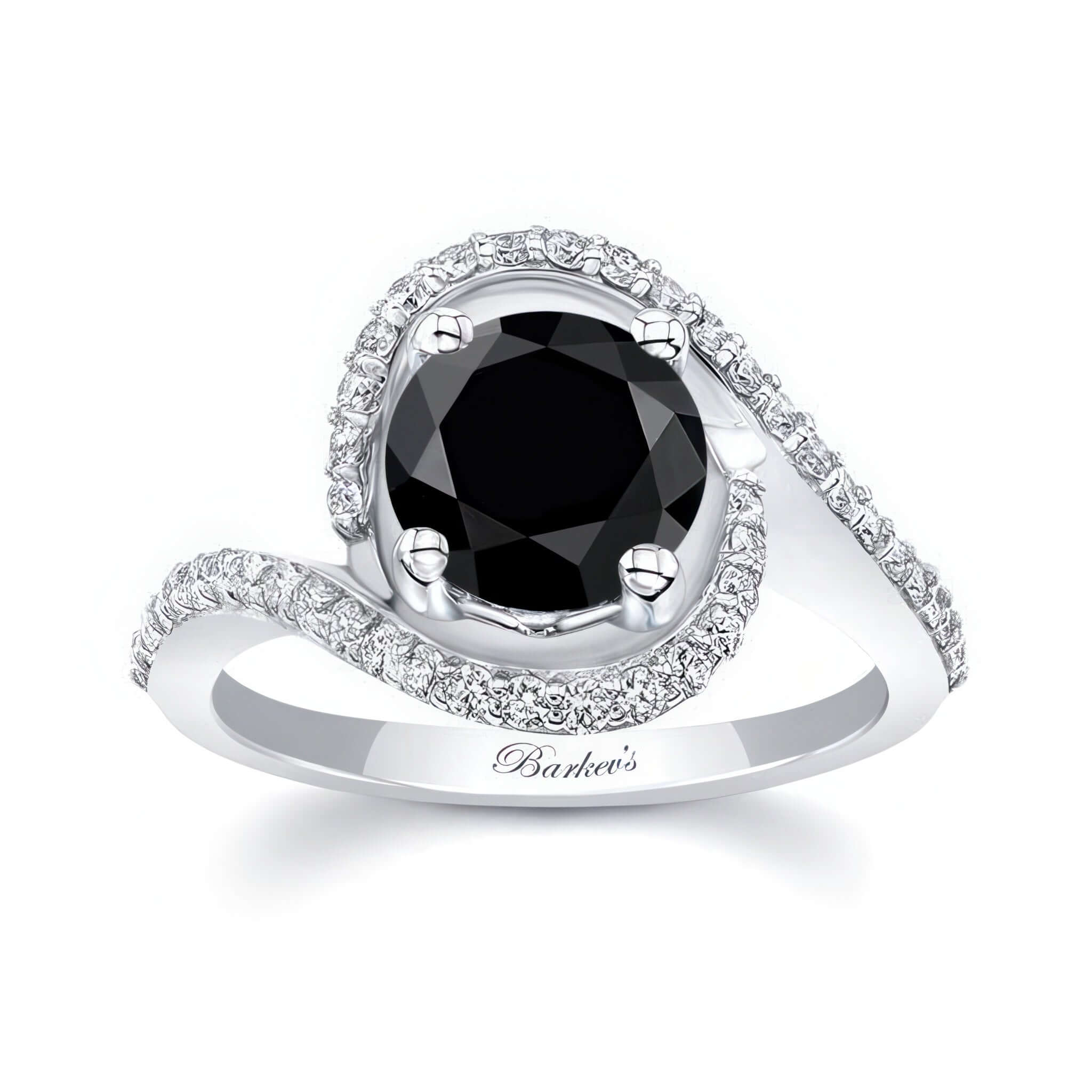 An elegant floating halo black and white diamond engagement ring with a round center and a split shank that wraps around the center adorned with micro pave diamonds for added sparkle.
