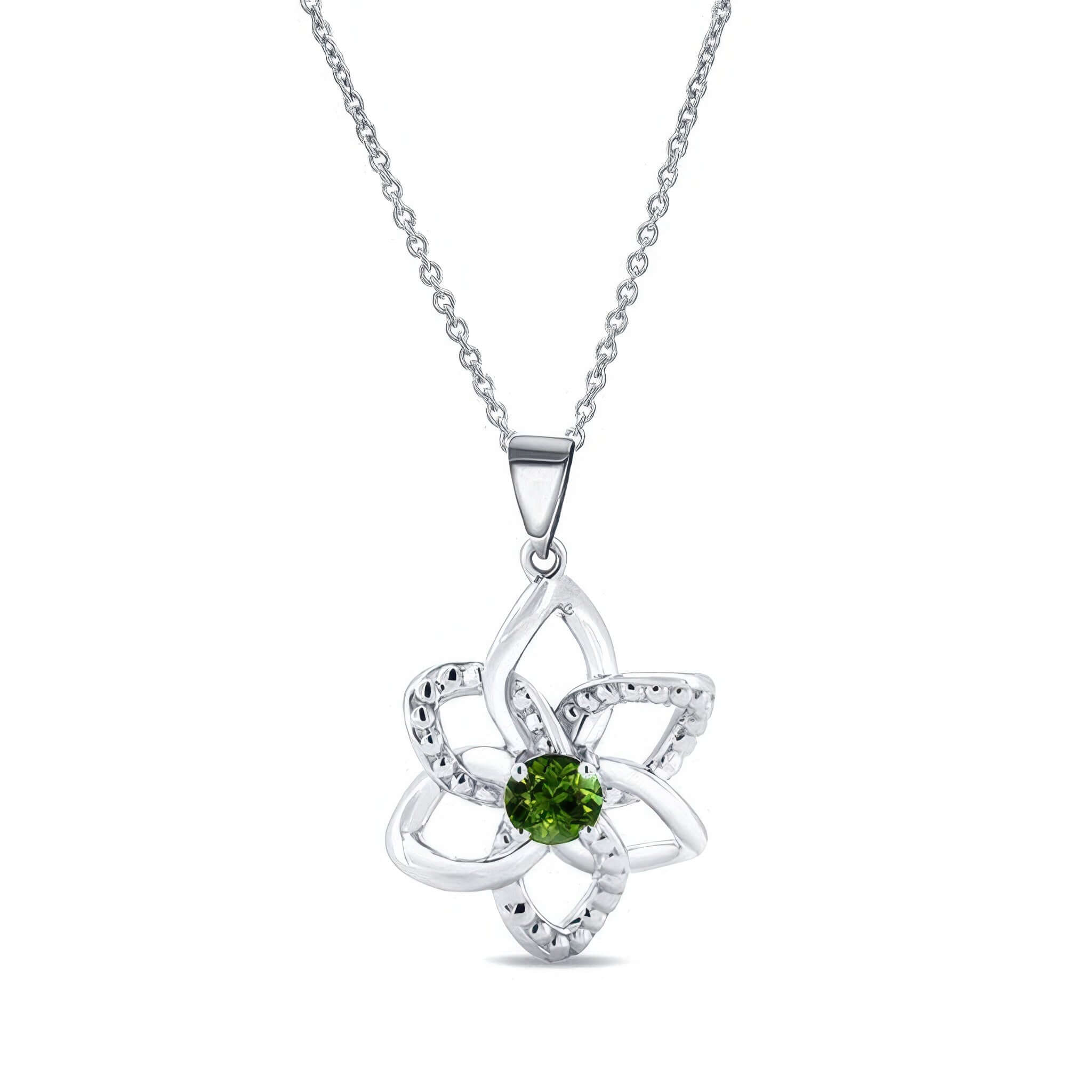 A beautiful green tourmaline silver flower necklace featuring intertwined leaf shapes and a half carat green tourmaline center.