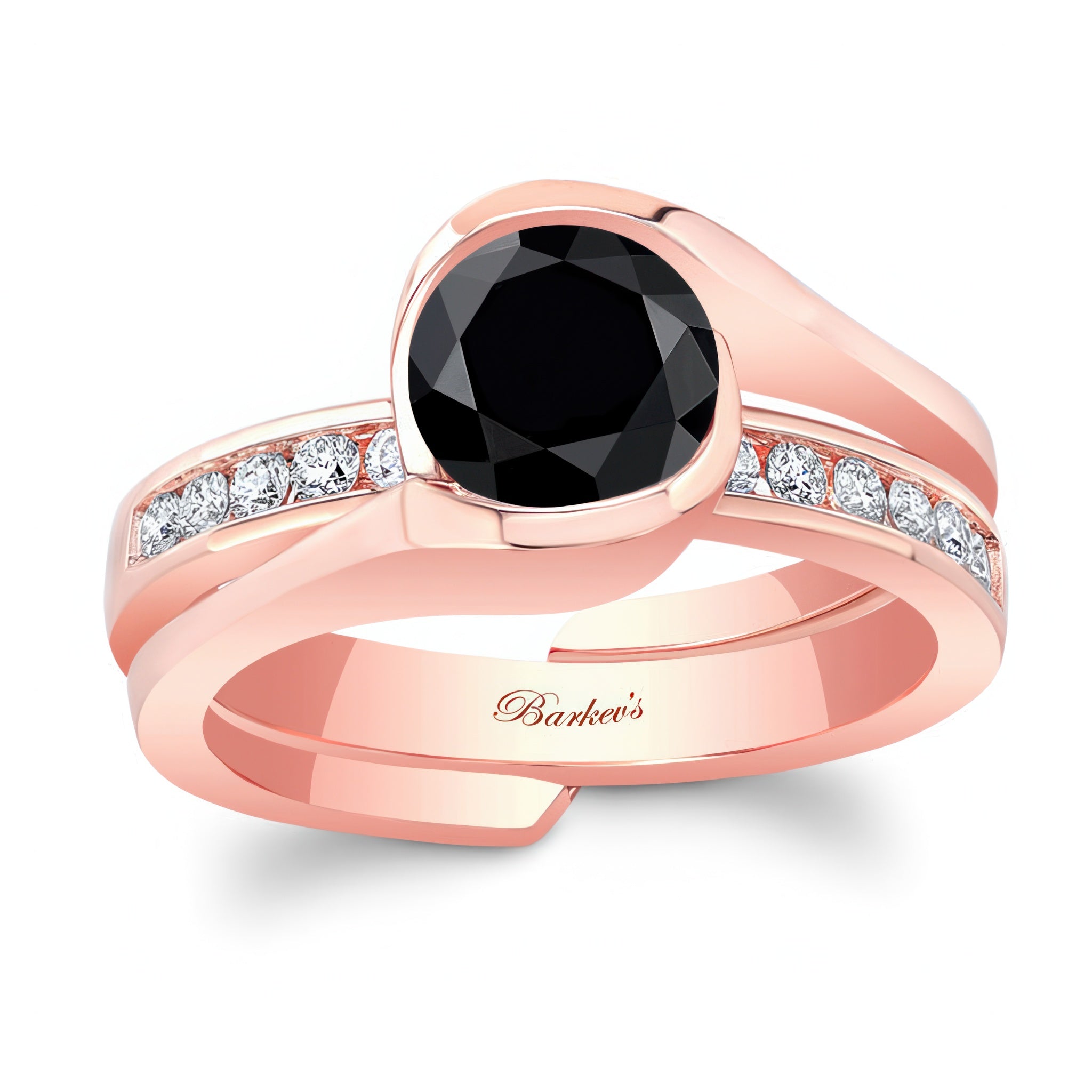 This half bezel black and white diamond interlocking bridal set features a classic round center and a channel set diamond wedding band that slips into the ring for a display of true elegance.