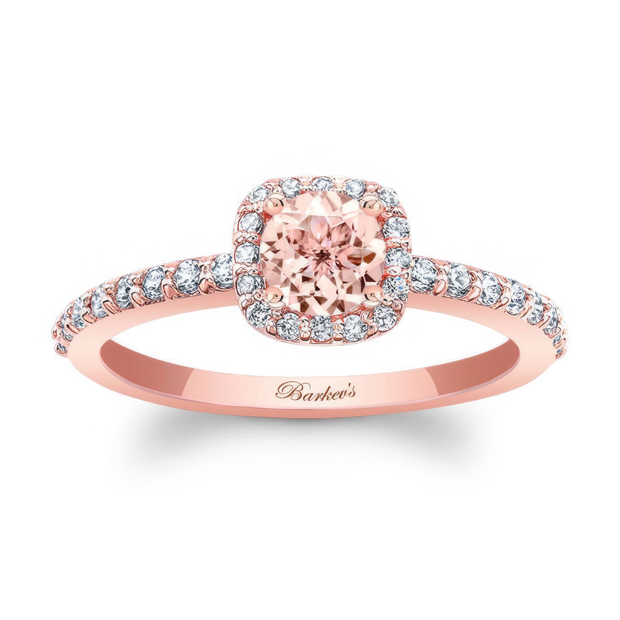 A dazzling half carat morganite halo ring with a cushion halo surrounding the round center with pave set diamonds cascading down the slender band for a finishing touch of glamour.