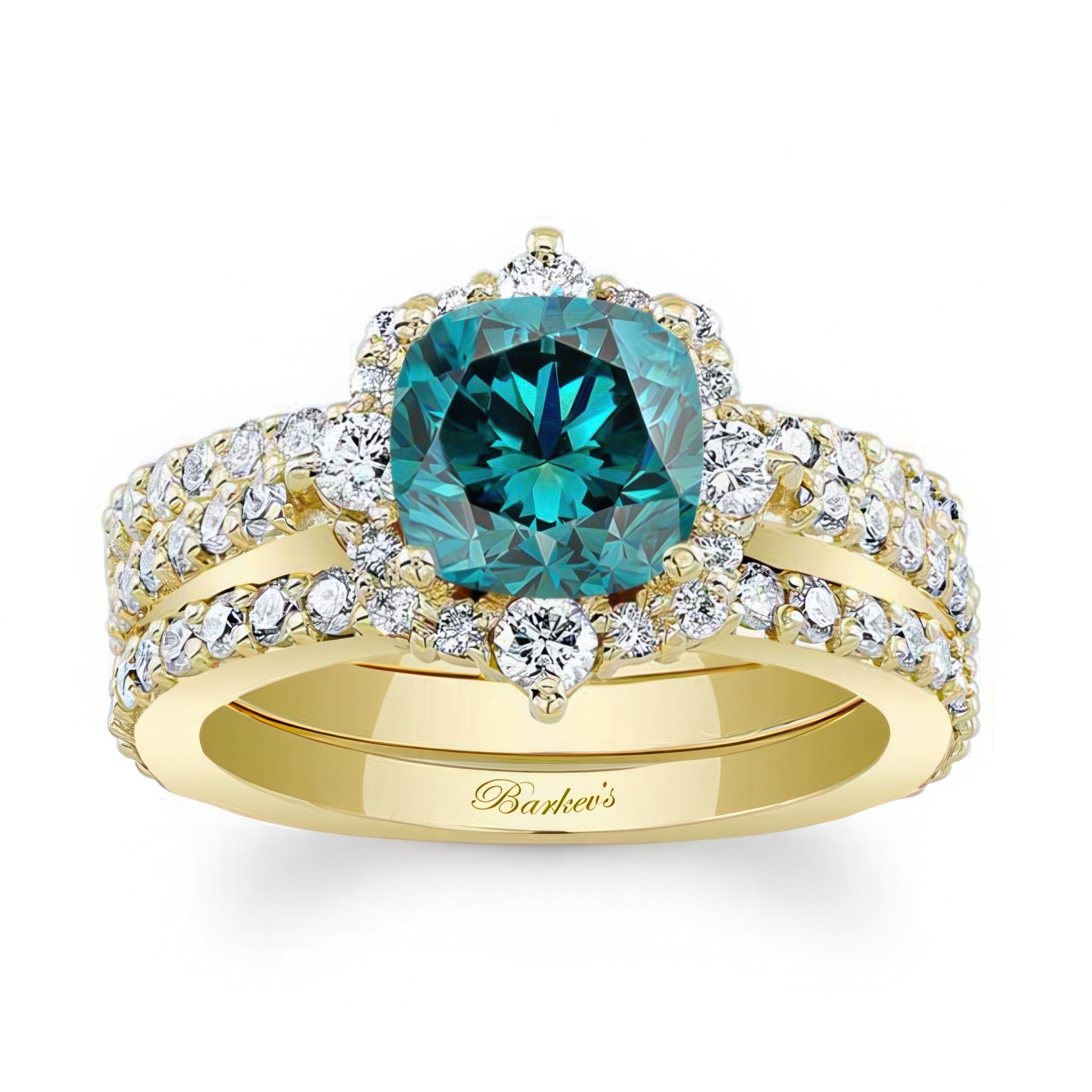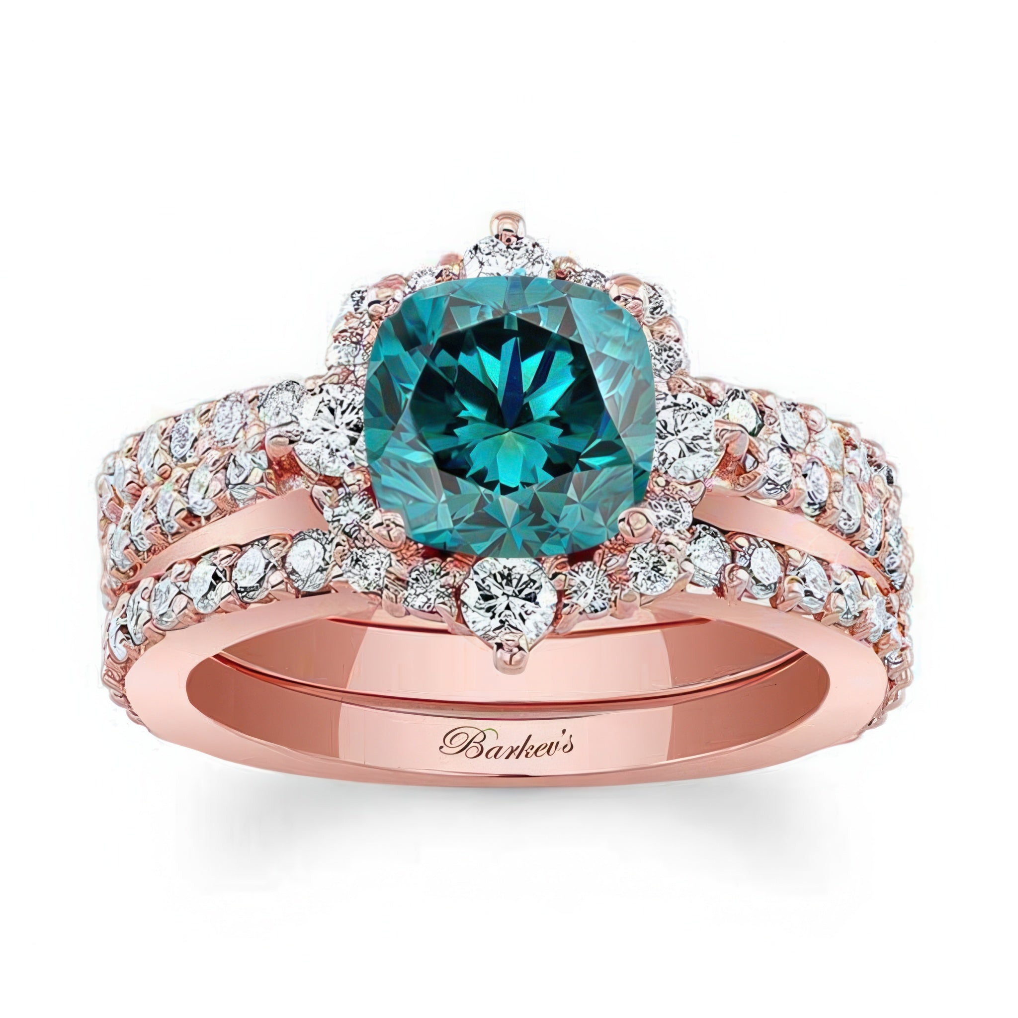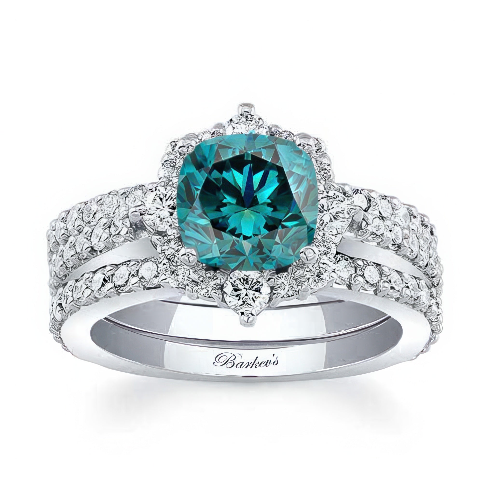 Halo Cushion Cut Blue And White Diamond wedding Ring Set With 2 Bands