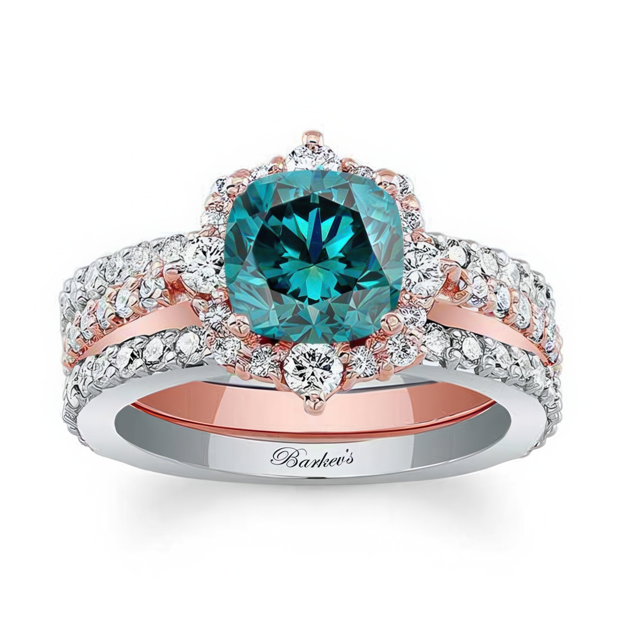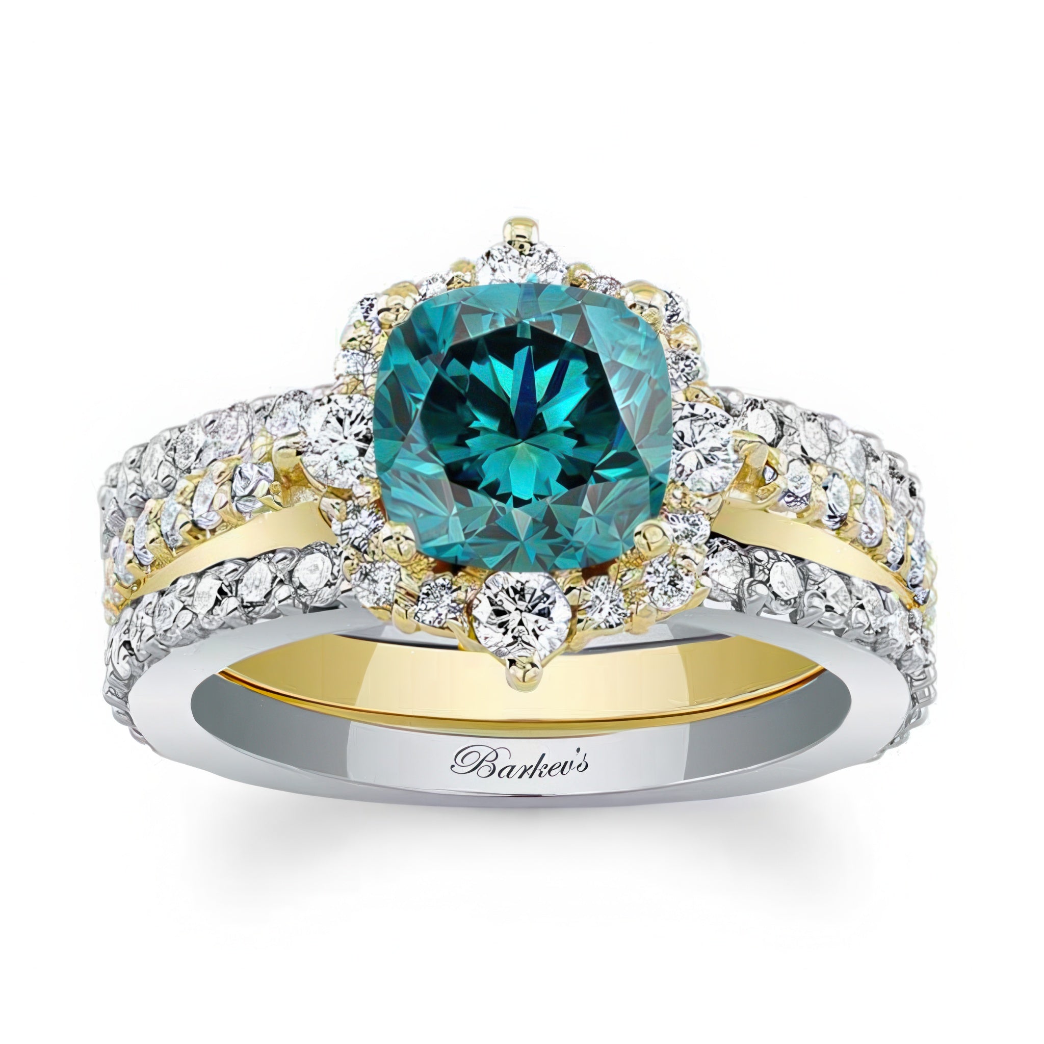 This halo cushion cut blue and white diamond wedding ring set with 2 bands features a prong set cushion center embellished with shared prong set diamonds for a striking look. Comes with a pair of matching diamond wedding bands.