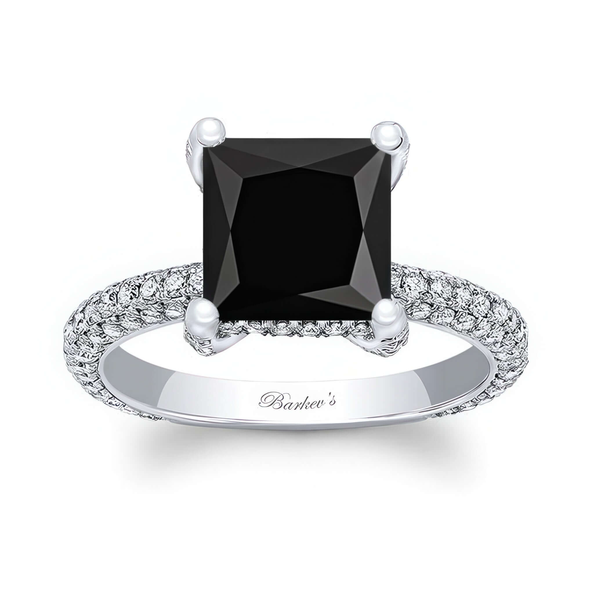 A stunning hidden halo black and white diamond engagement ring with an unexpected twist featuring a gorgeous princess cut center surrounded by hidden accents underneath. To add even more sparkle, both sides of the shank are encrusted with three rows of French pave diamonds for a true conversation starter to say the least.