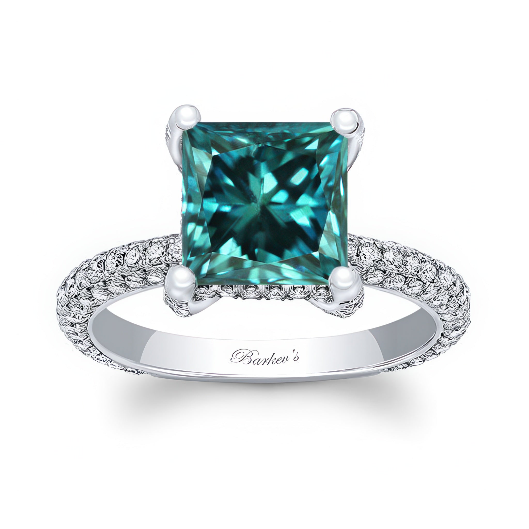 A stunning hidden halo blue and white diamond engagement ring with an unexpected twist featuring a gorgeous princess cut center surrounded by hidden accents underneath. To add even more sparkle, both sides of the shank are encrusted with three rows of French pave diamonds for a true conversation starter to say the least.