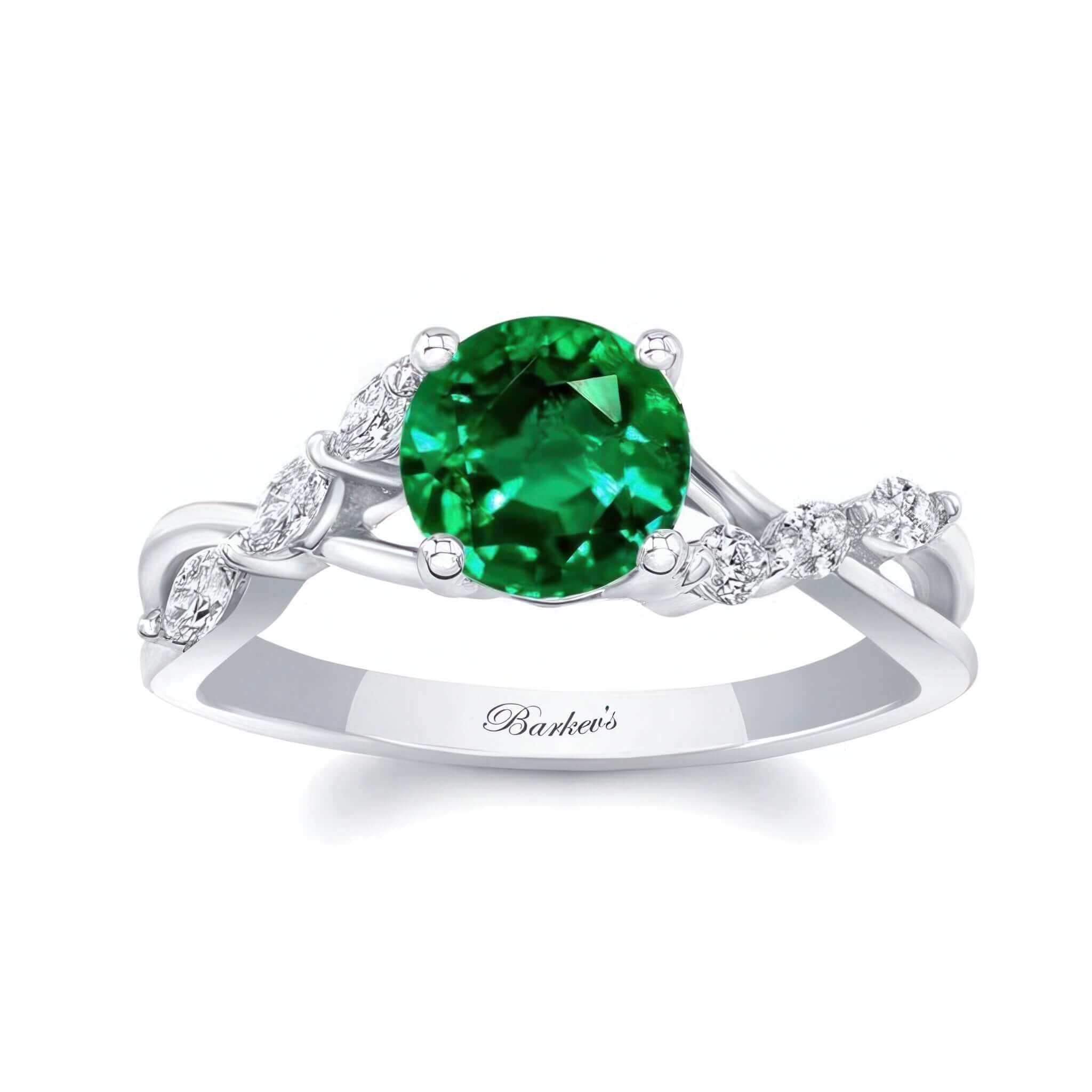 This lab emerald and diamond marquise accent ring gives off a classic vibe. The design is adorned by a round center snugly embraced by an elegant curve with three diamonds on each side.