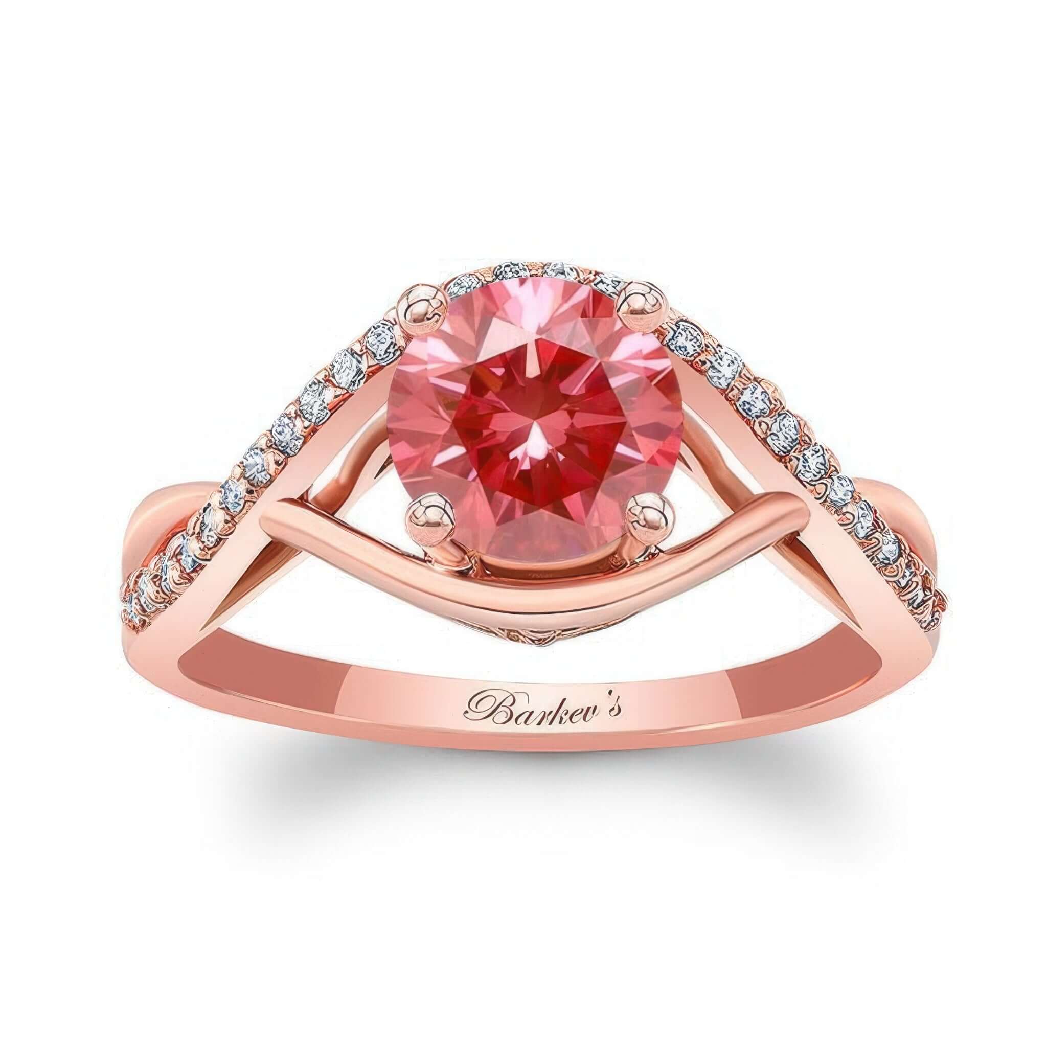 A beautiful lab grown pink diamond criss cross ring featuring a curving shank, shared prong set diamond melees and a round center stone