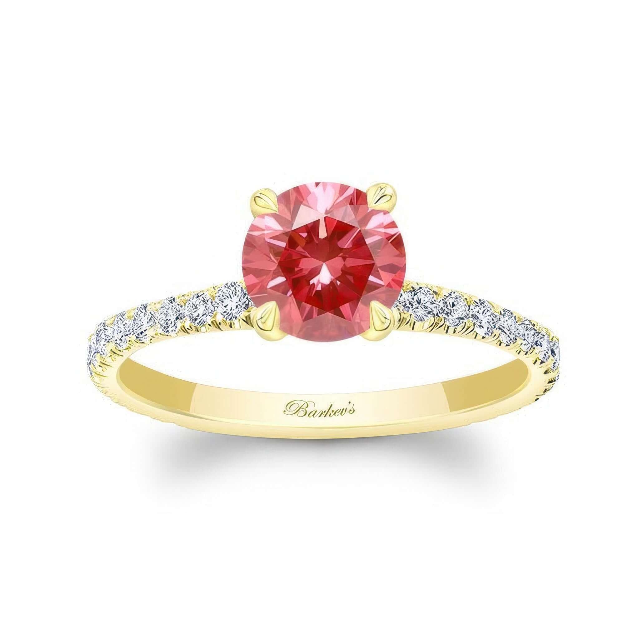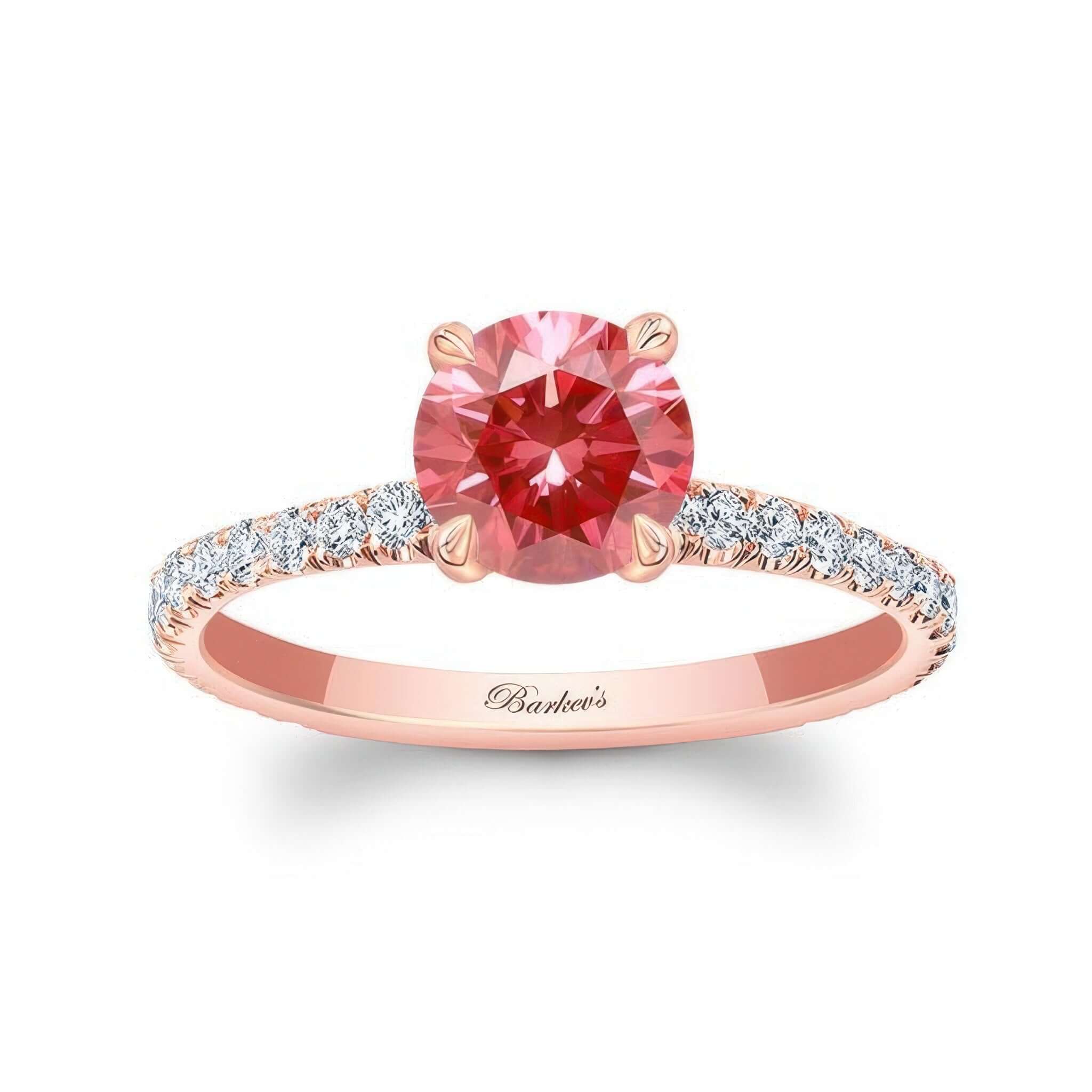 This stunning lab grown pink diamond ring features a prong set round center with a french cut pave set diamond halo underneath it and more brilliant diamonds cascading down the shank for a look that's nothing short of spectacular.