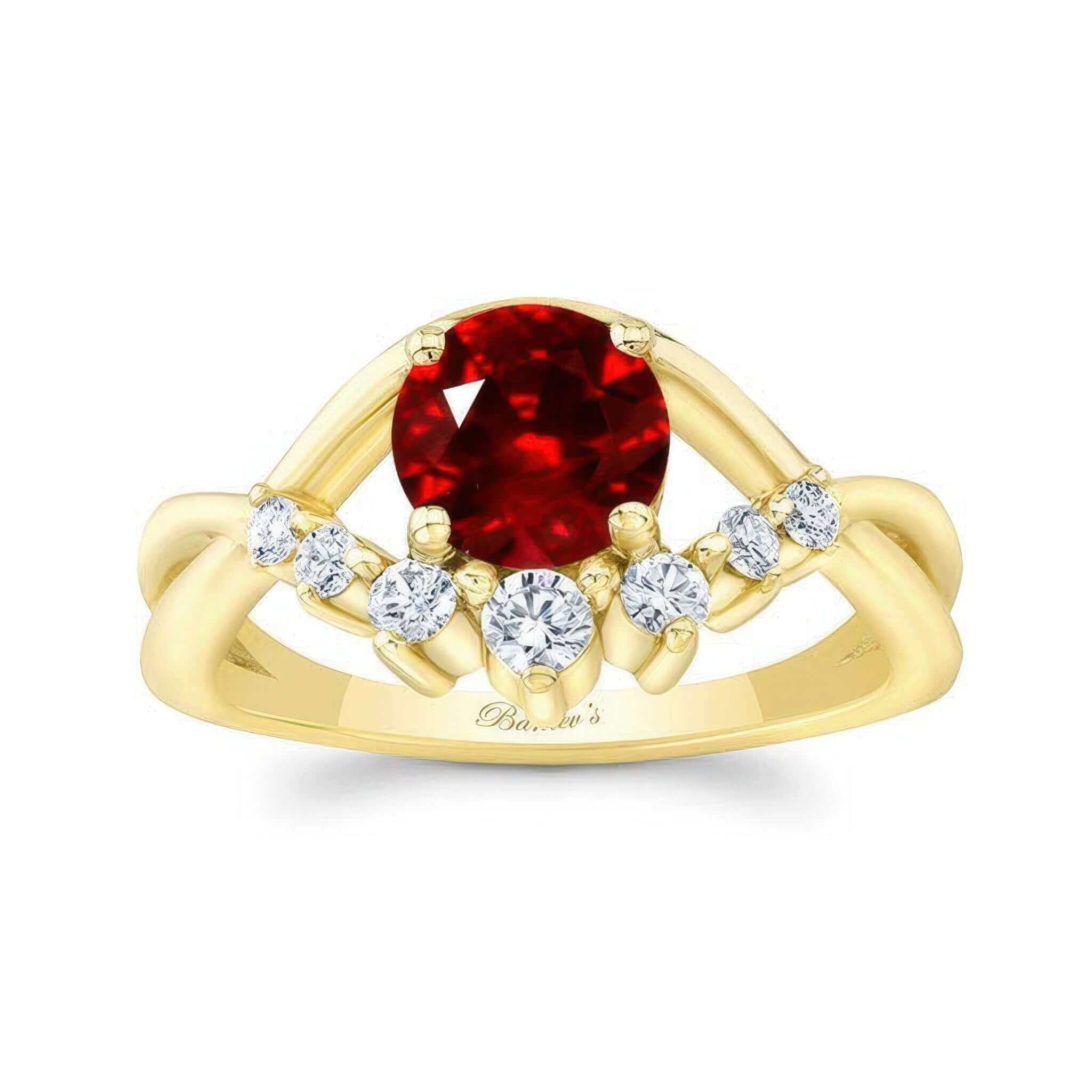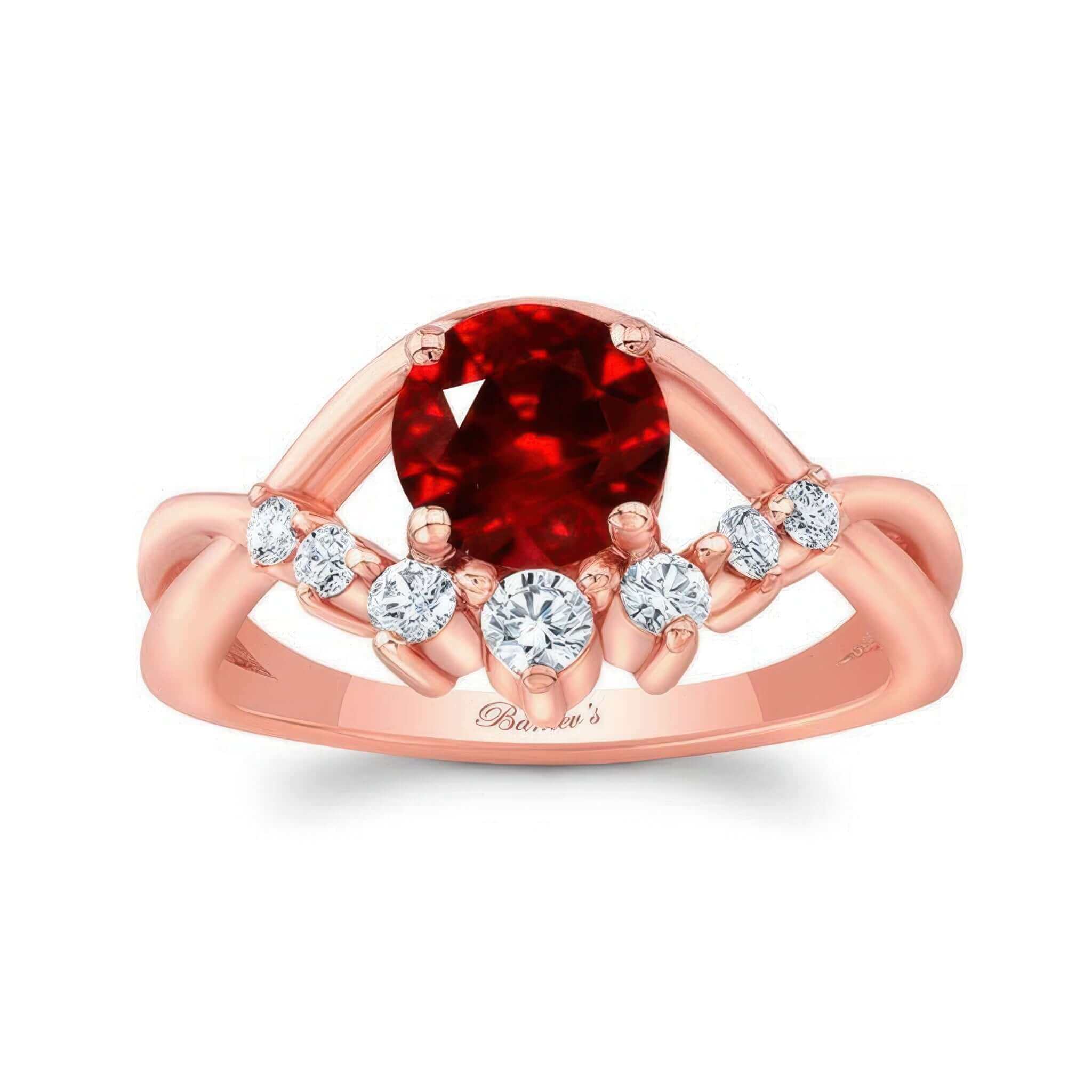 This lab ruby and diamond unique engagement ring grabs attention with a flare swirling on one side adorned with shared prong set diamonds and a round center stone.