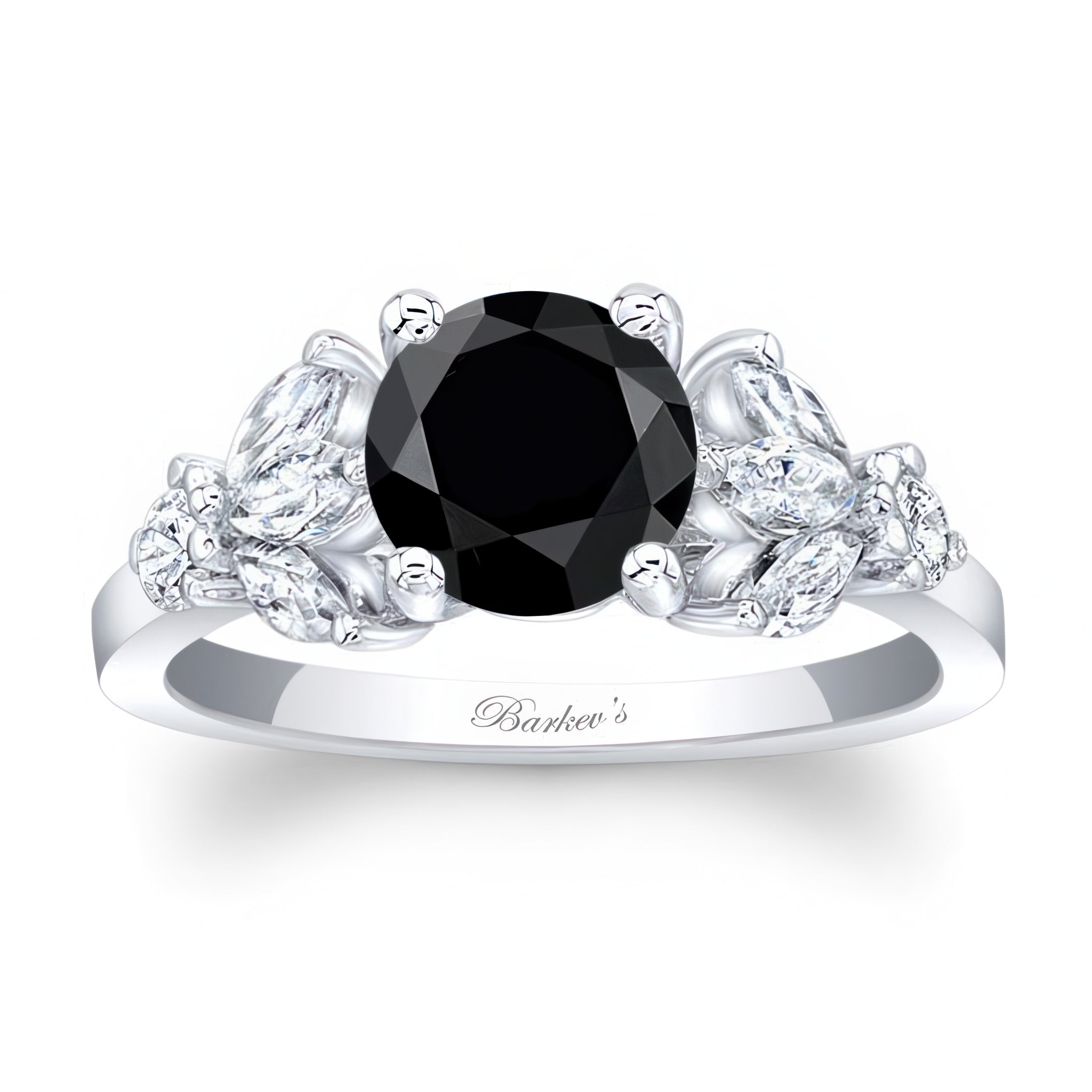 This marquise and round black and white diamond ring features a prong set center stone with fancy cut marquise and round diamonds embellishing the shoulders for an elegant flare.