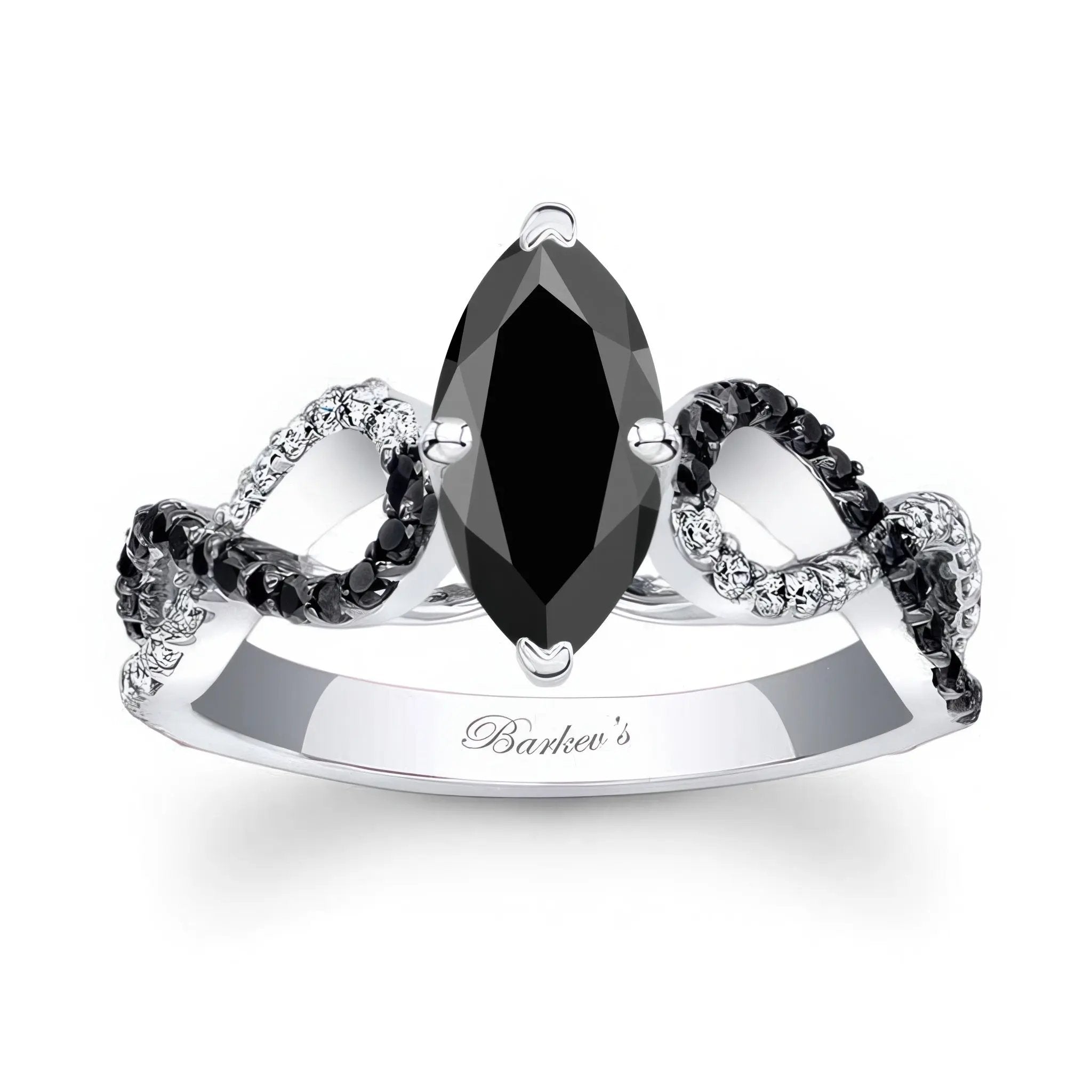 This marquise black diamond infinity ring features a prong set marquise center with an artfully curving cathedral shank that crisscrosses down the shoulders adorned with shared prong set black and white diamonds for a glamorous look sure to be treasured.