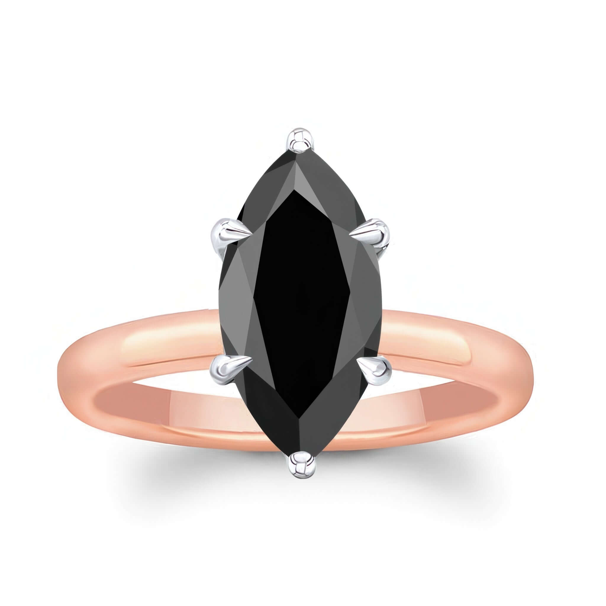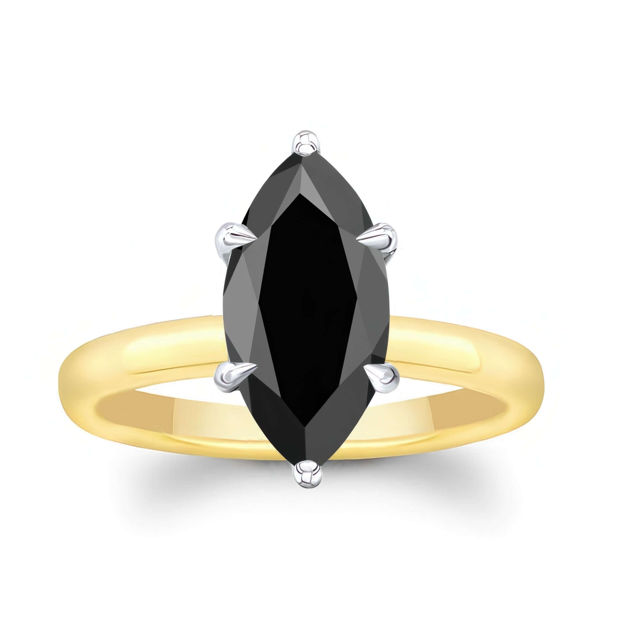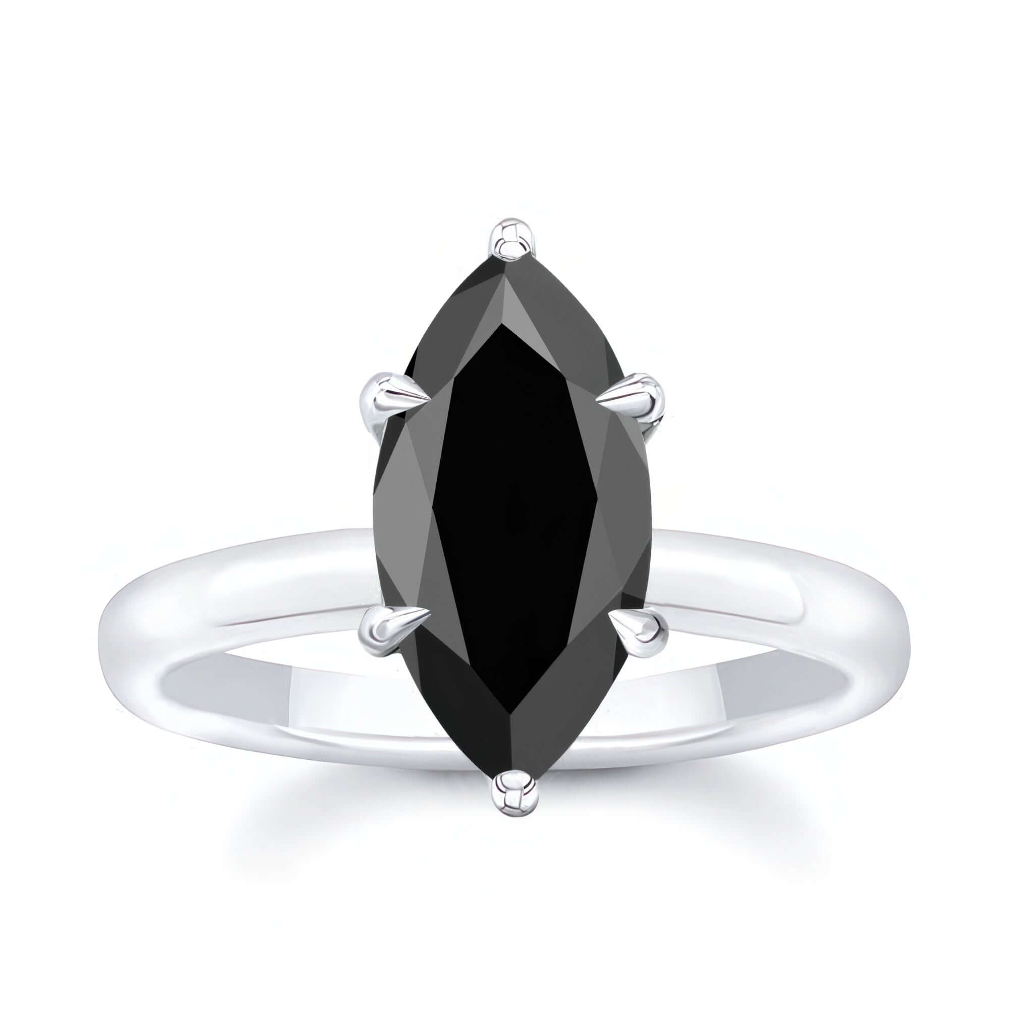 A simple marquise black diamond solitaire engagement ring featuring a six prong set marquise center for a stunning look of minimalist glamour.