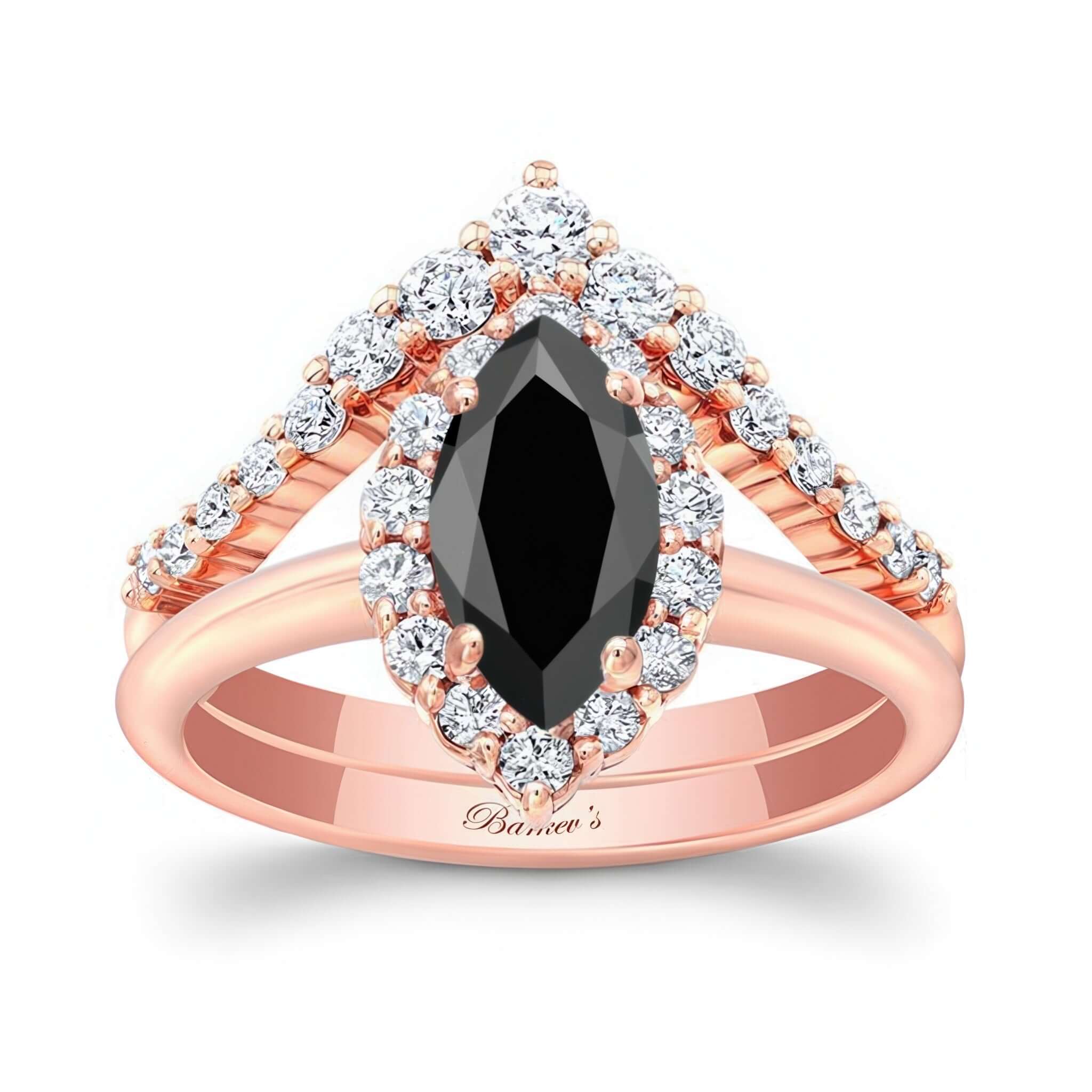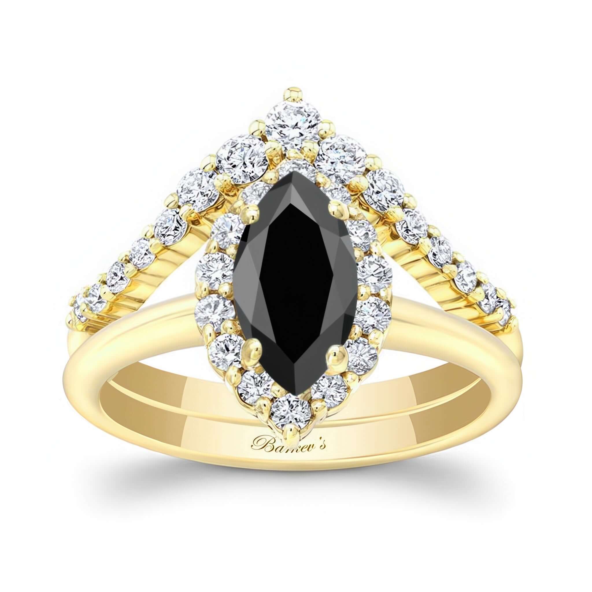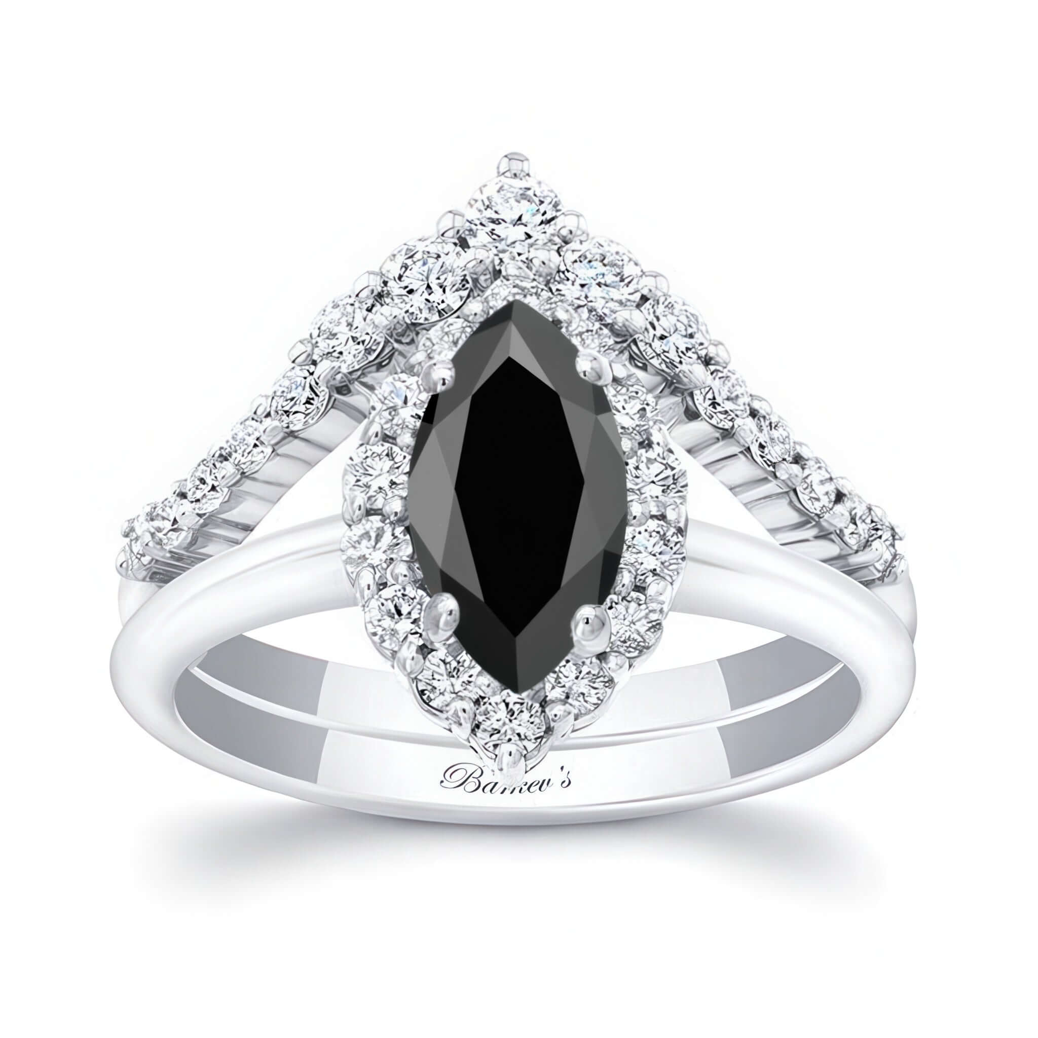 An elegant marquise cut black and white diamond wedding set featuring a diamond halo around the center and a simple comfortable shank. Comes with a matching diamond wedding band.