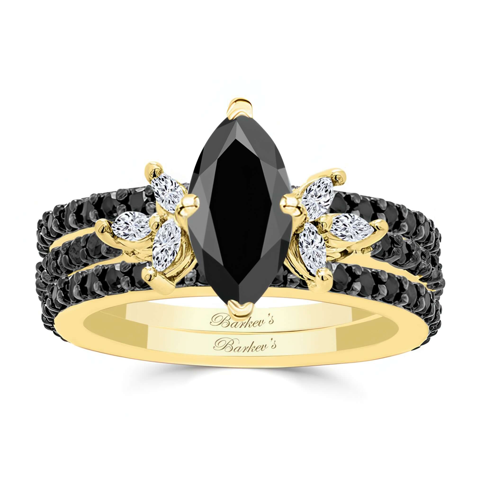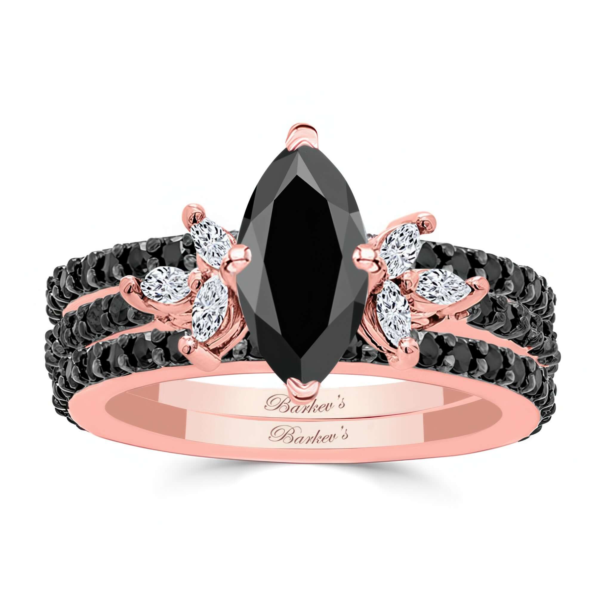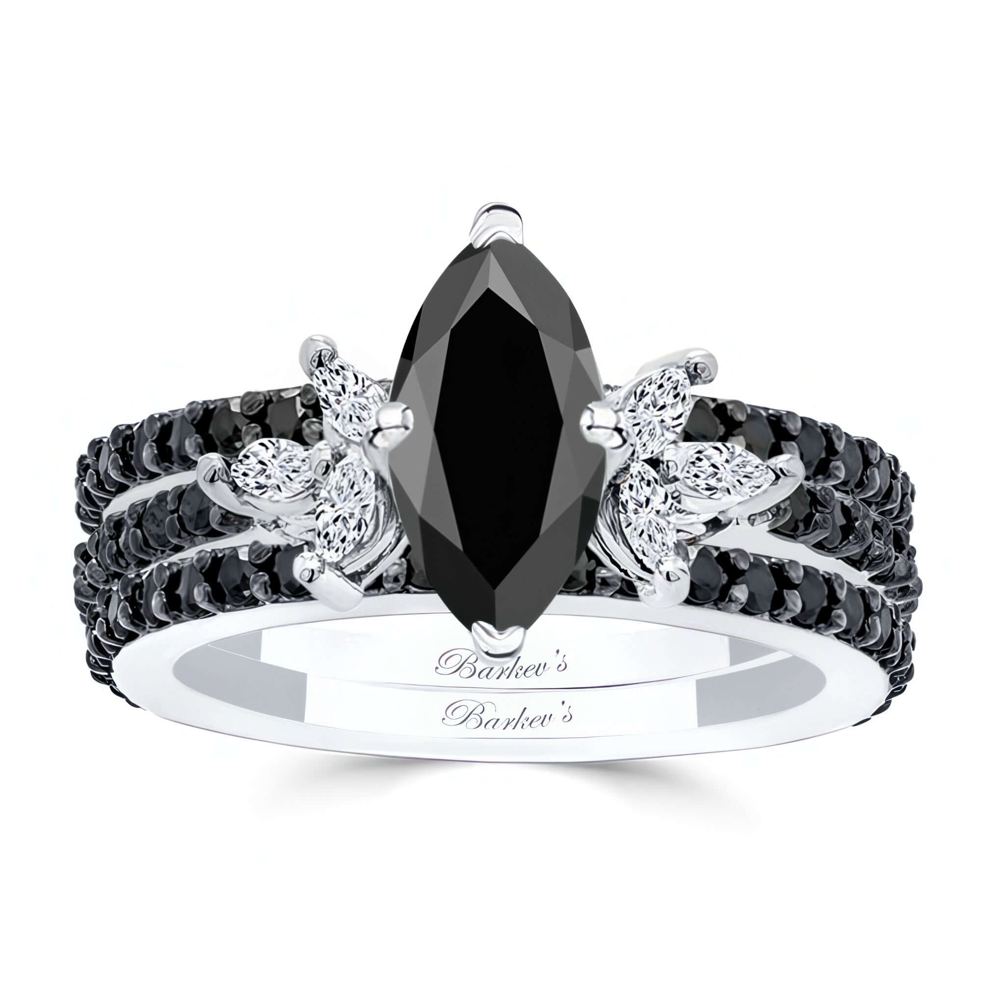 Discover timeless elegance with this stunning marquise cut black diamond bridal set with 2 bands. The centerpiece is a dazzling marquise black diamond, accentuated by six additional marquise diamonds arranged in a floral-inspired design. Completing the look, 18 round black diamonds shimmer along the delicate shank, adding brilliance to every angle. Comes with a pair of matching wedding bands with 25 black diamonds on each. A perfect blend of sophistication and romance, this set is crafted for those who appreciate unique and graceful details.