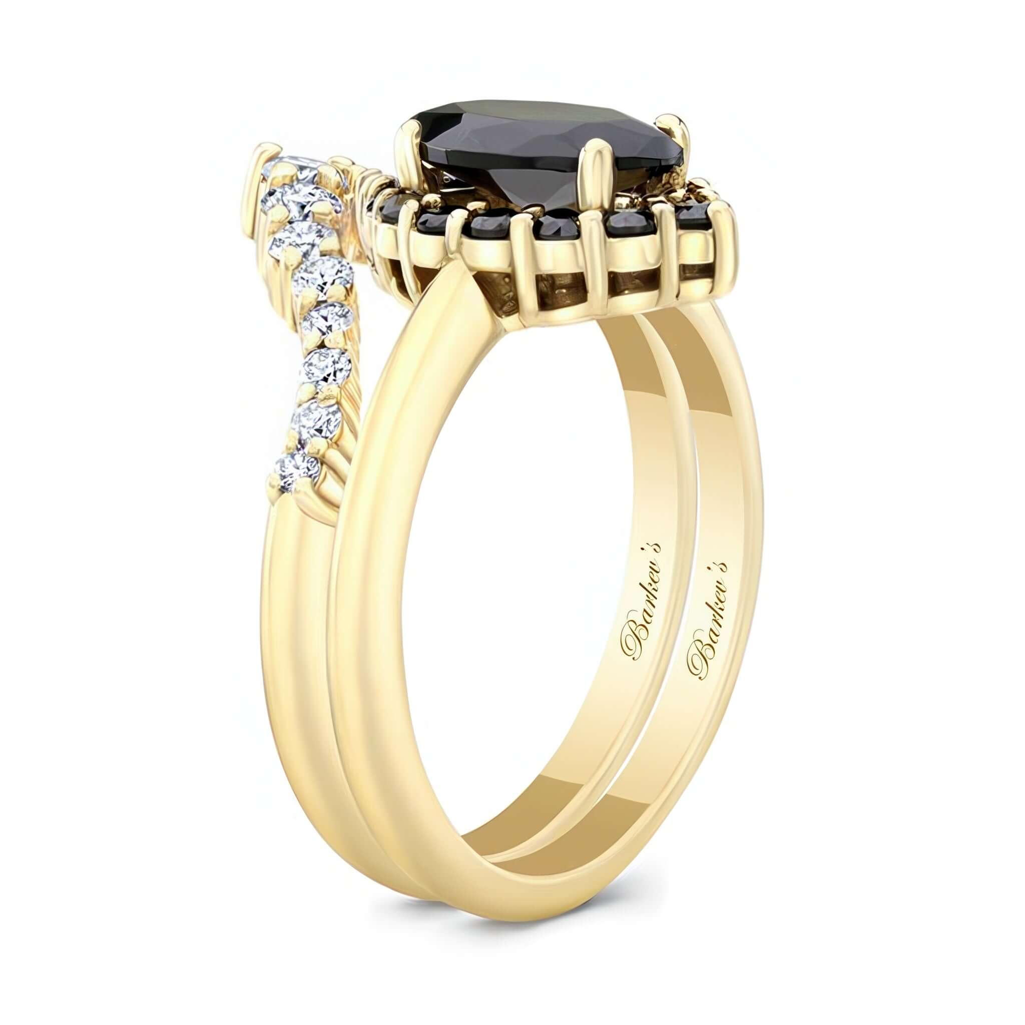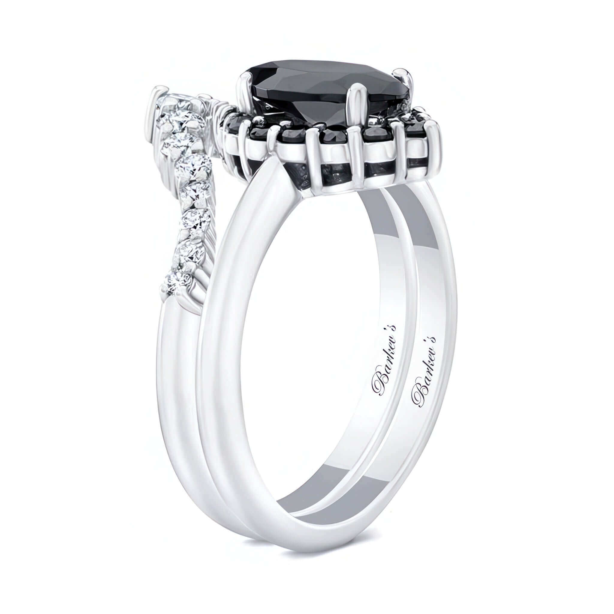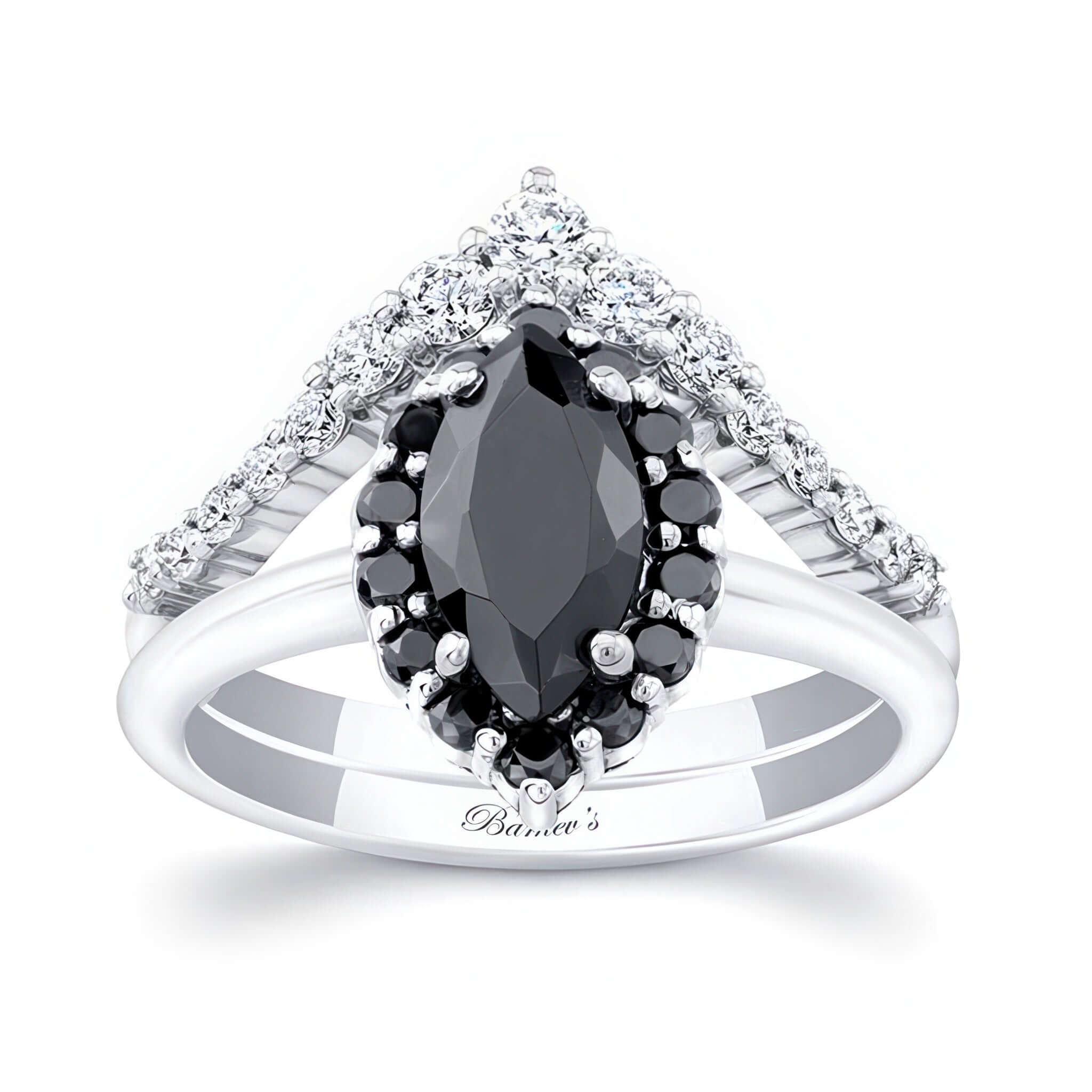 An elegant marquise cut black diamond wedding set with white diamonds featuring a black diamond halo around the center and a simple comfortable shank. Comes with a matching diamond wedding band.
