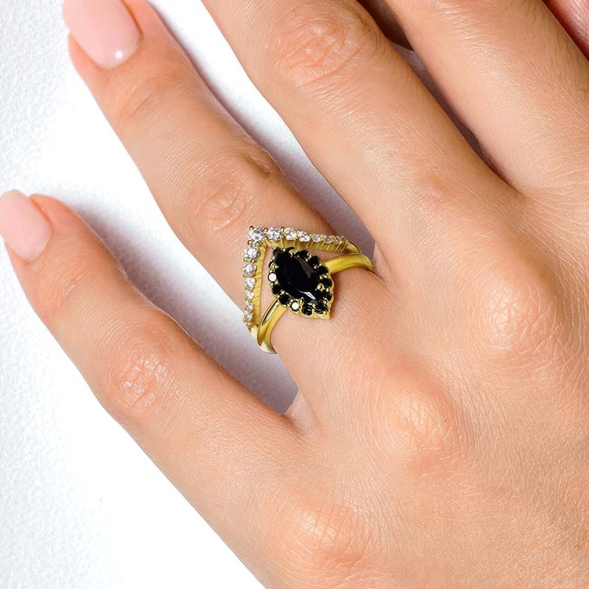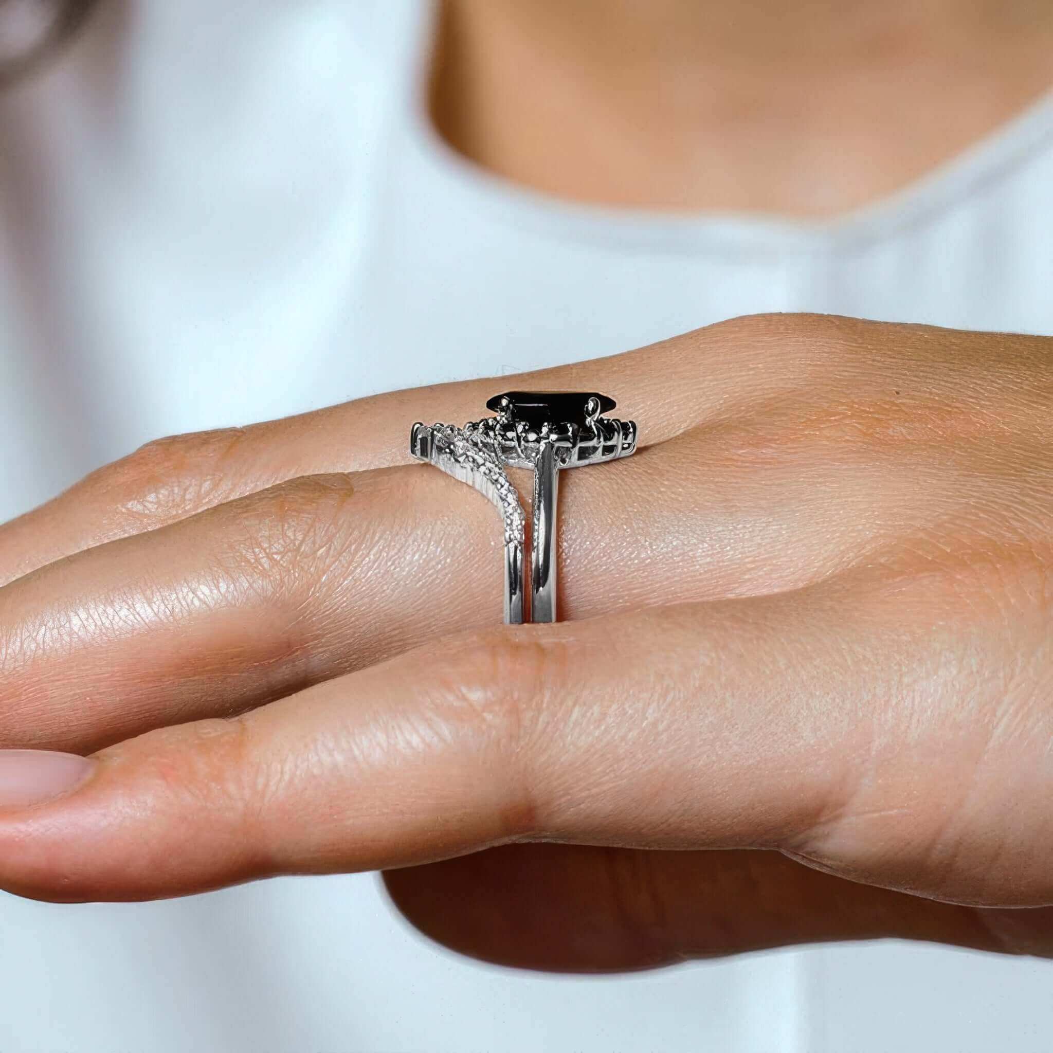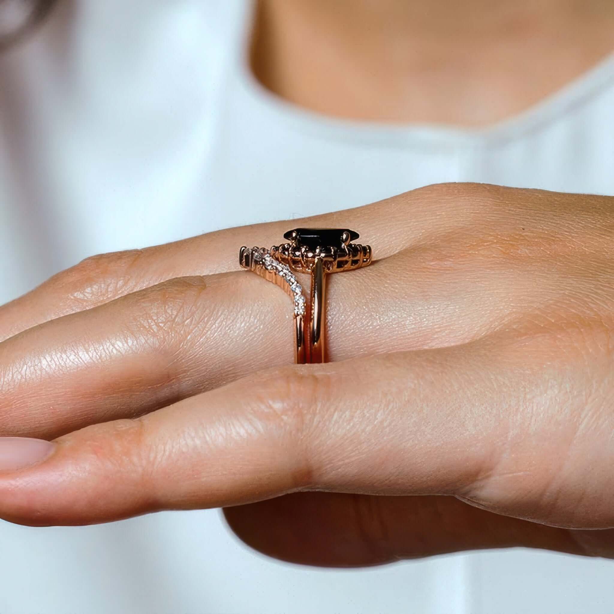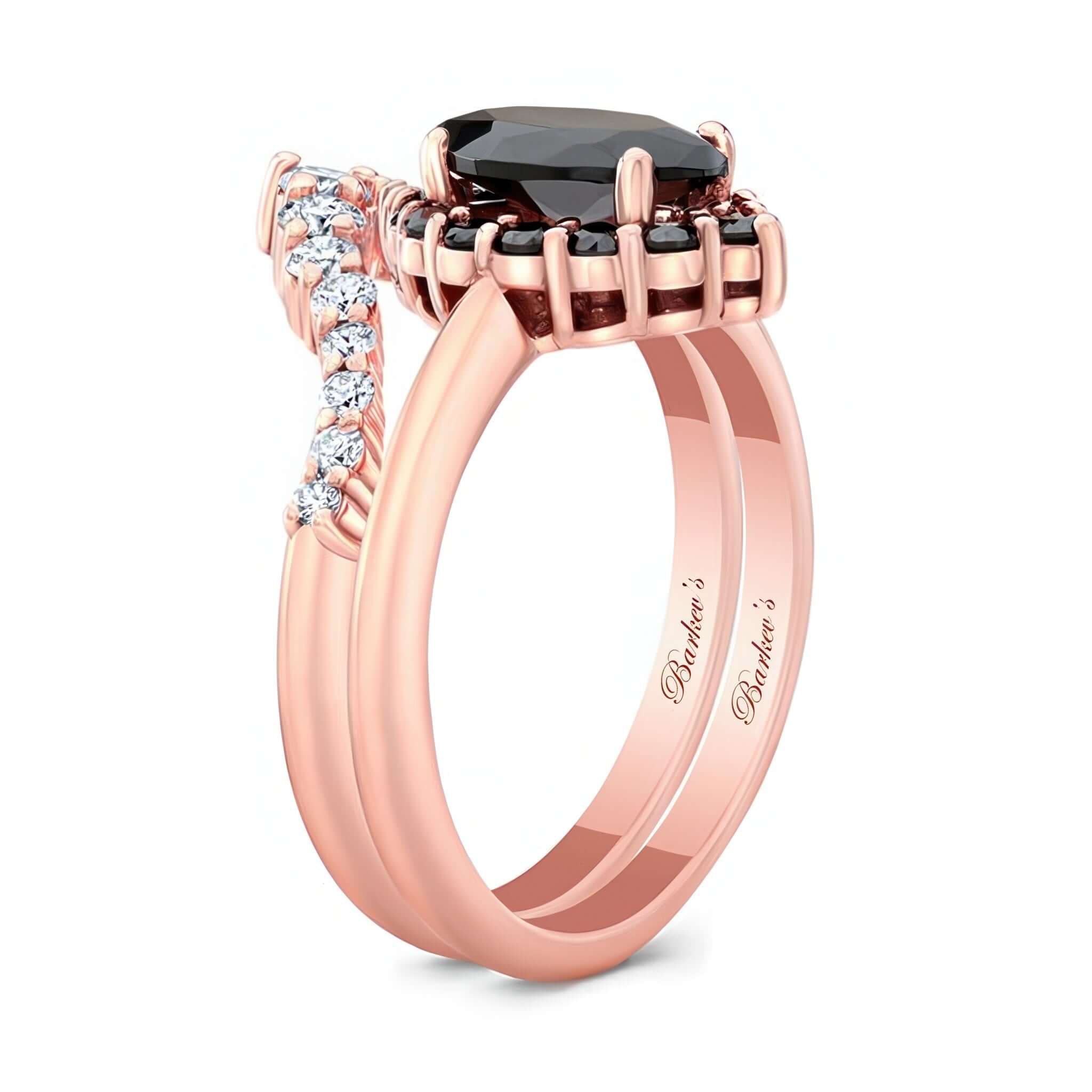 An elegant marquise cut black diamond wedding set with white diamonds featuring a black diamond halo around the center and a simple comfortable shank. Comes with a matching diamond wedding band.