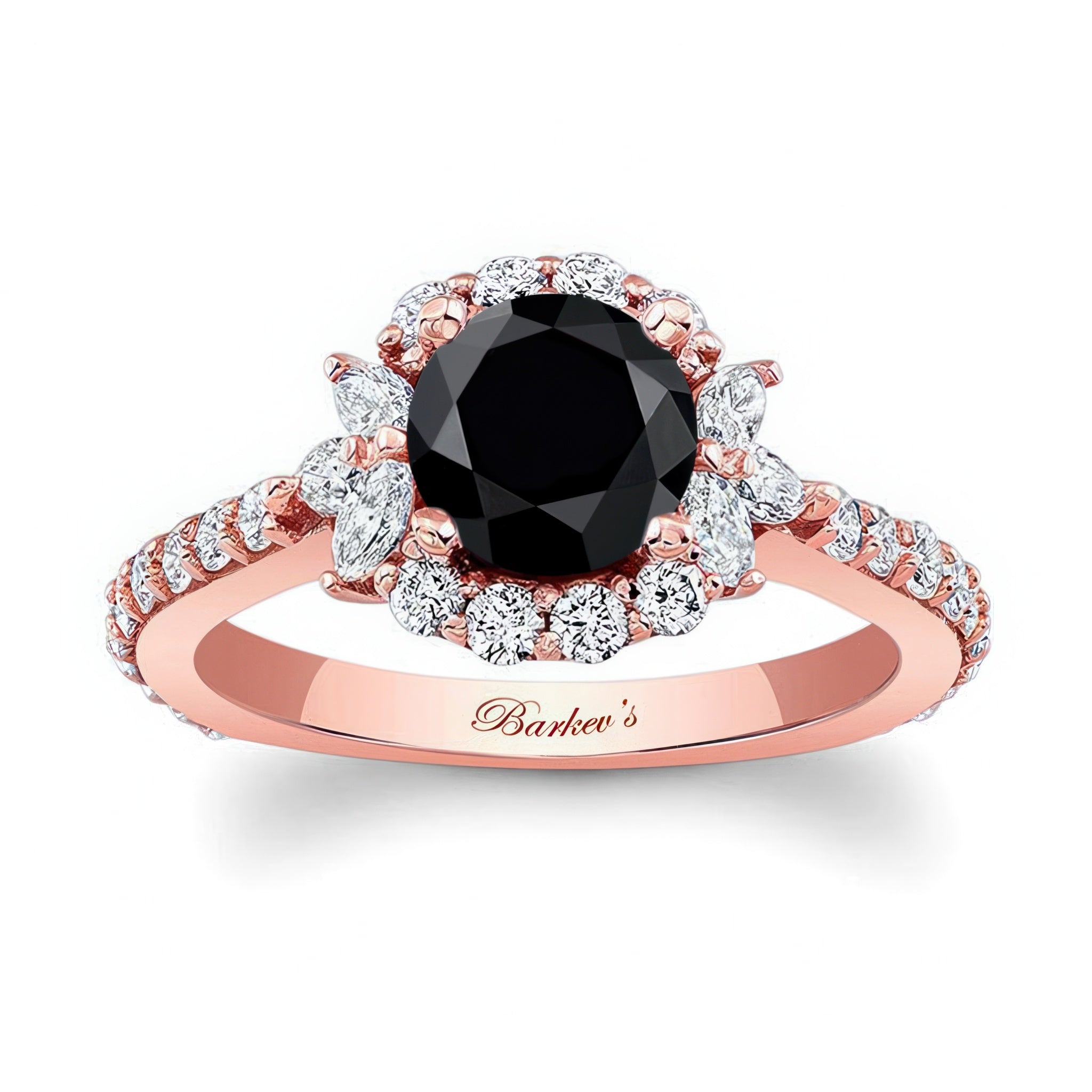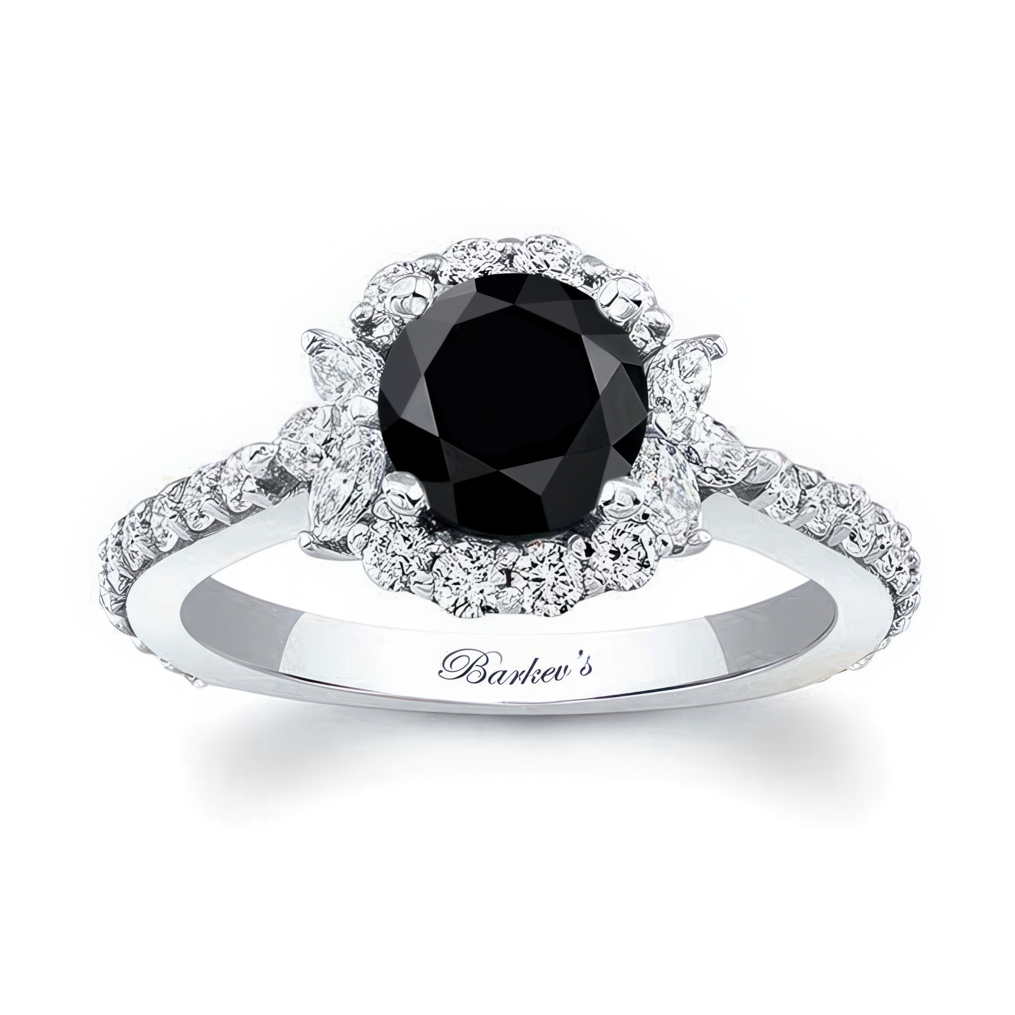 This marquise halo black and white diamond ring features a prong set round center encircled with round and marquise cut diamonds for a stunning alternative to a traditional halo ring.