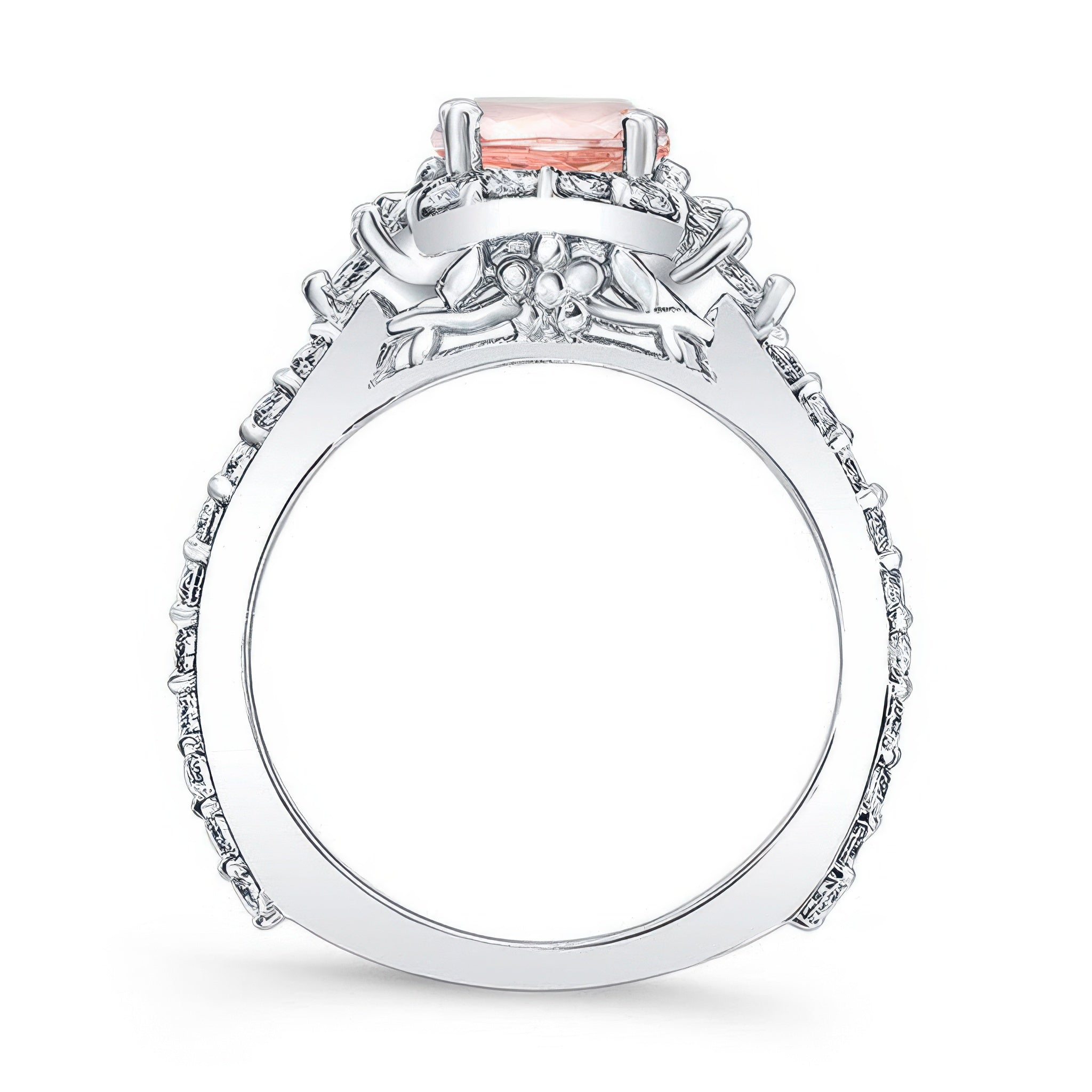 This marquise halo morganite ring features a prong set round center encircled with round and marquise cut diamonds for a stunning alternative to a traditional halo ring.