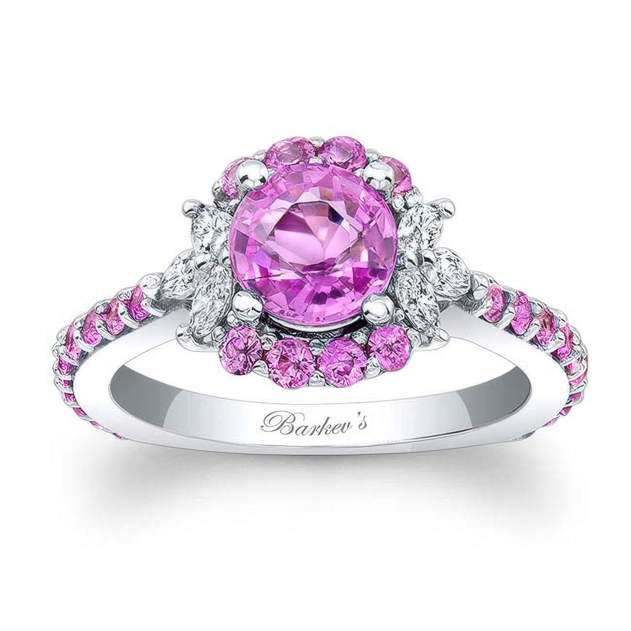 This marquise halo pink sapphire ring features a prong set round center encircled with round and marquise cut diamonds and pink sapphires for a stunning alternative to a traditional halo ring.