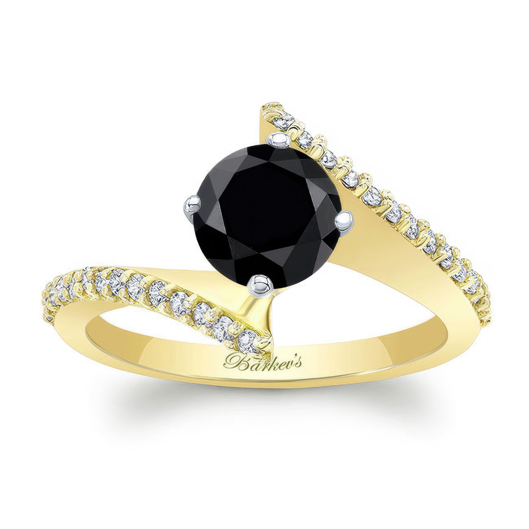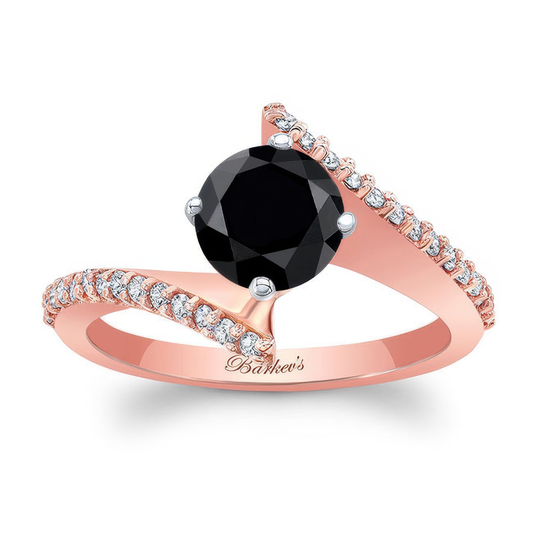A stunning modern bypass black and white diamond engagement ring featuring a prong set round center with sharing prong set diamonds gracing the ridges for a dramatic look sure to catch the eye of many admirers.