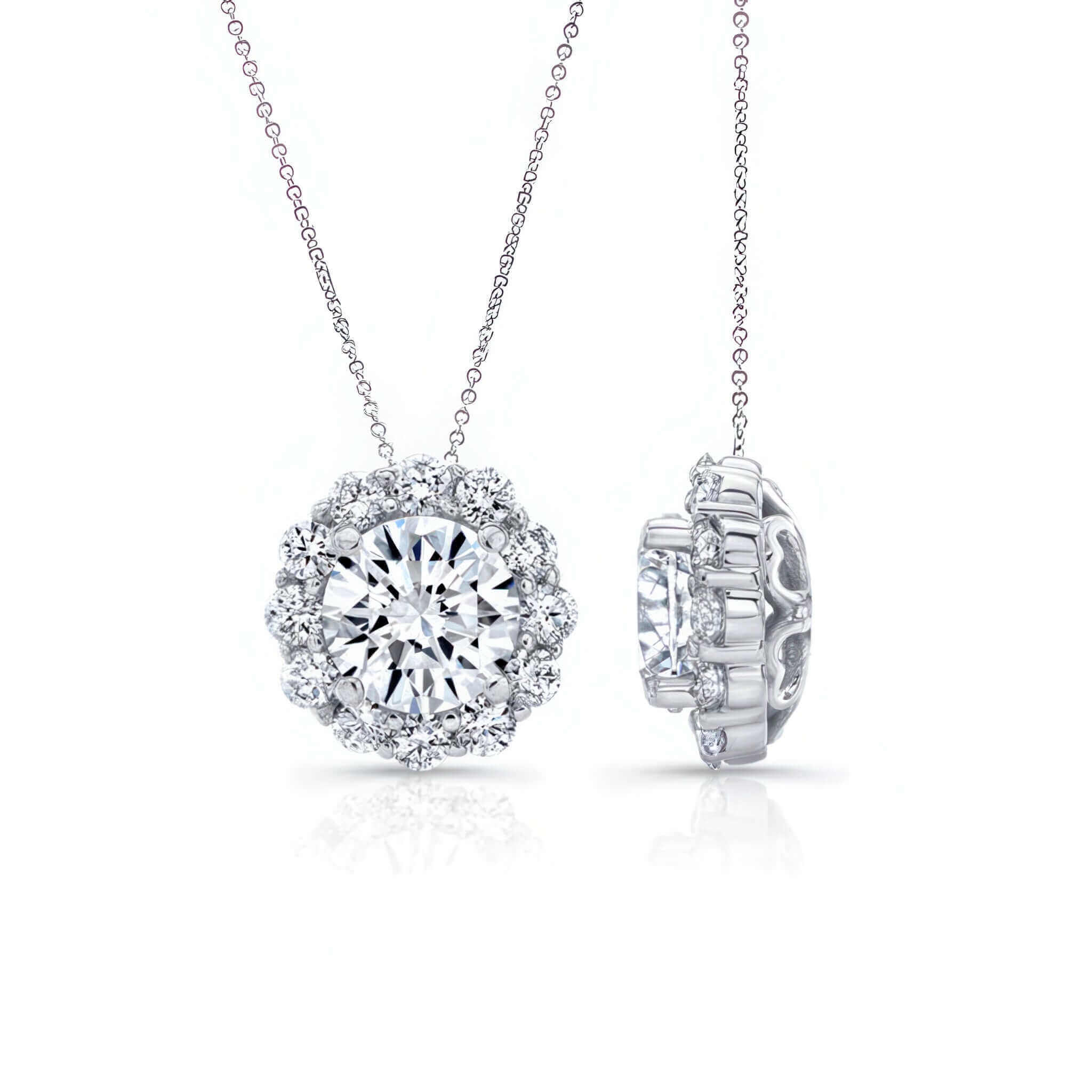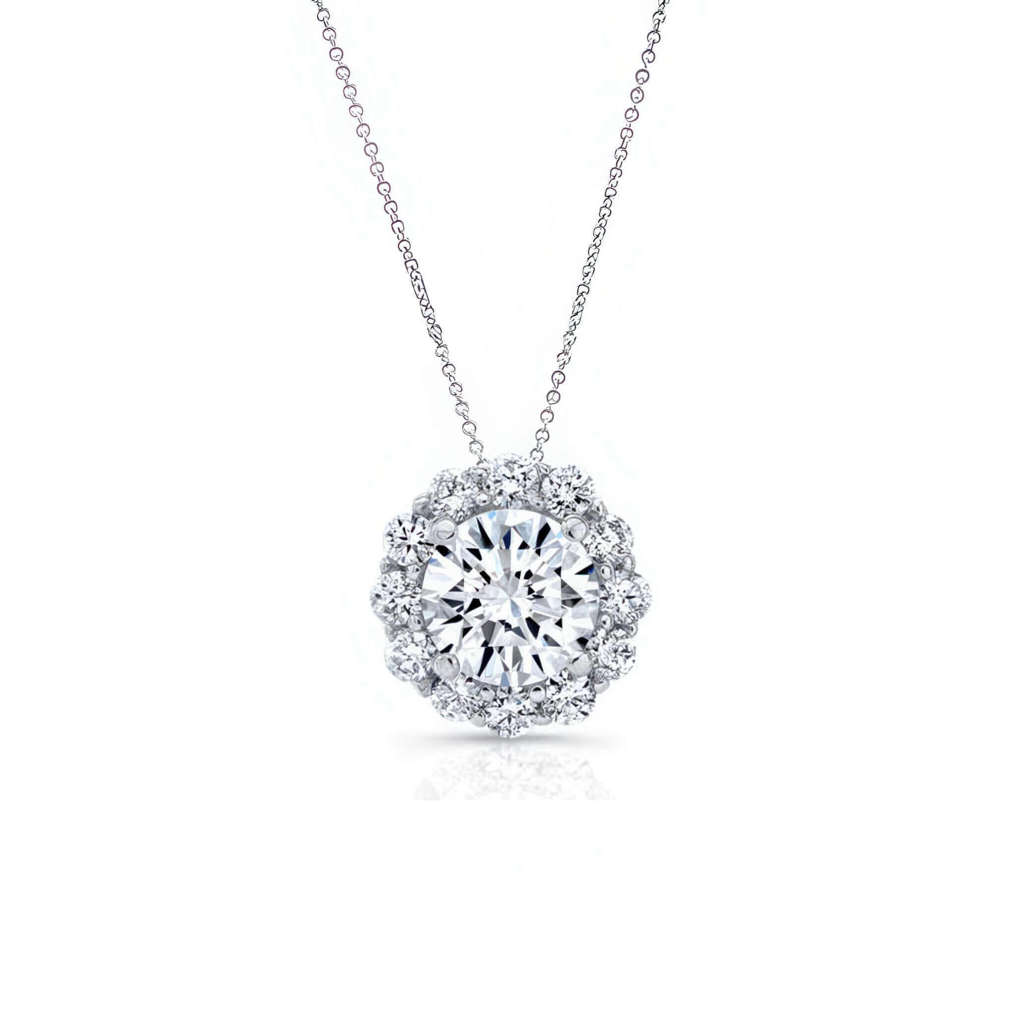A stunning moissanite and diamond halo necklace featuring a prong set half carat round moissanite center adorned with a halo of shared prong set diamonds for a touch of sophistication.