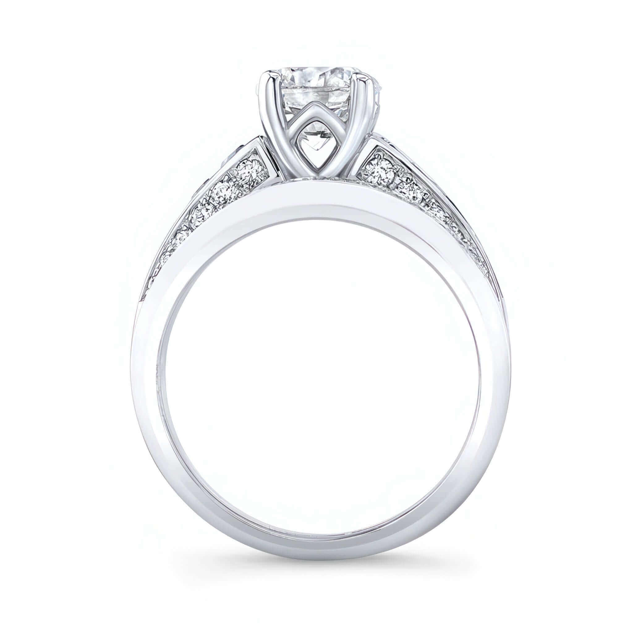 This magnificent moissanite channel set wedding ring set with blue diamonds boasts with sparkle from every angle featuring beveled edges and a round center that is met by a row of channel set blue diamonds and pave white diamonds adorning not only the top, but also each side of the shank. Adding to this brilliance, the diamond wedding band fits snuggly close to the engagement ring for an unparalleled look.