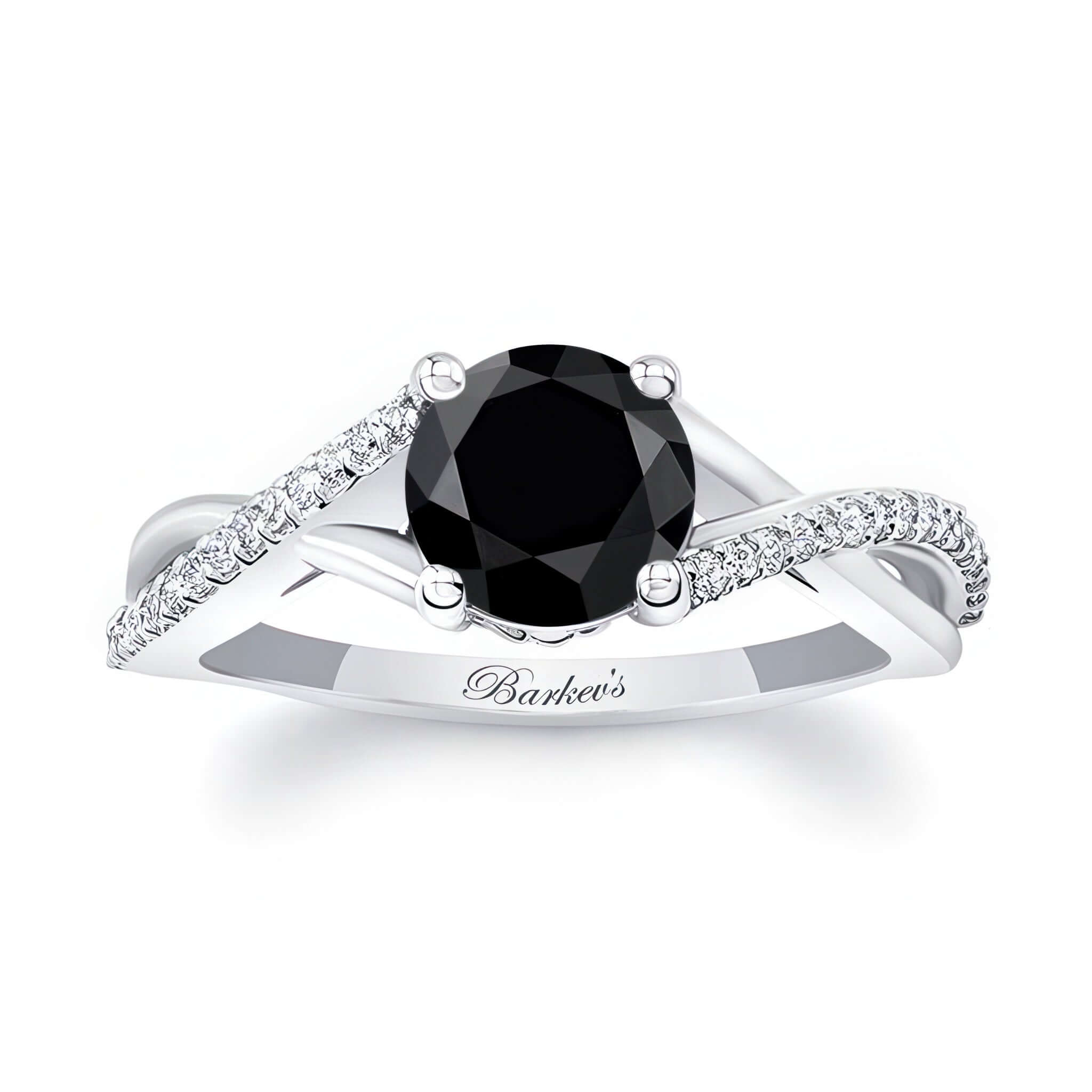 A simple one carat black and white diamond ring featuring a round center, a criss crossing split shank and shared prong diamonds on the sides.