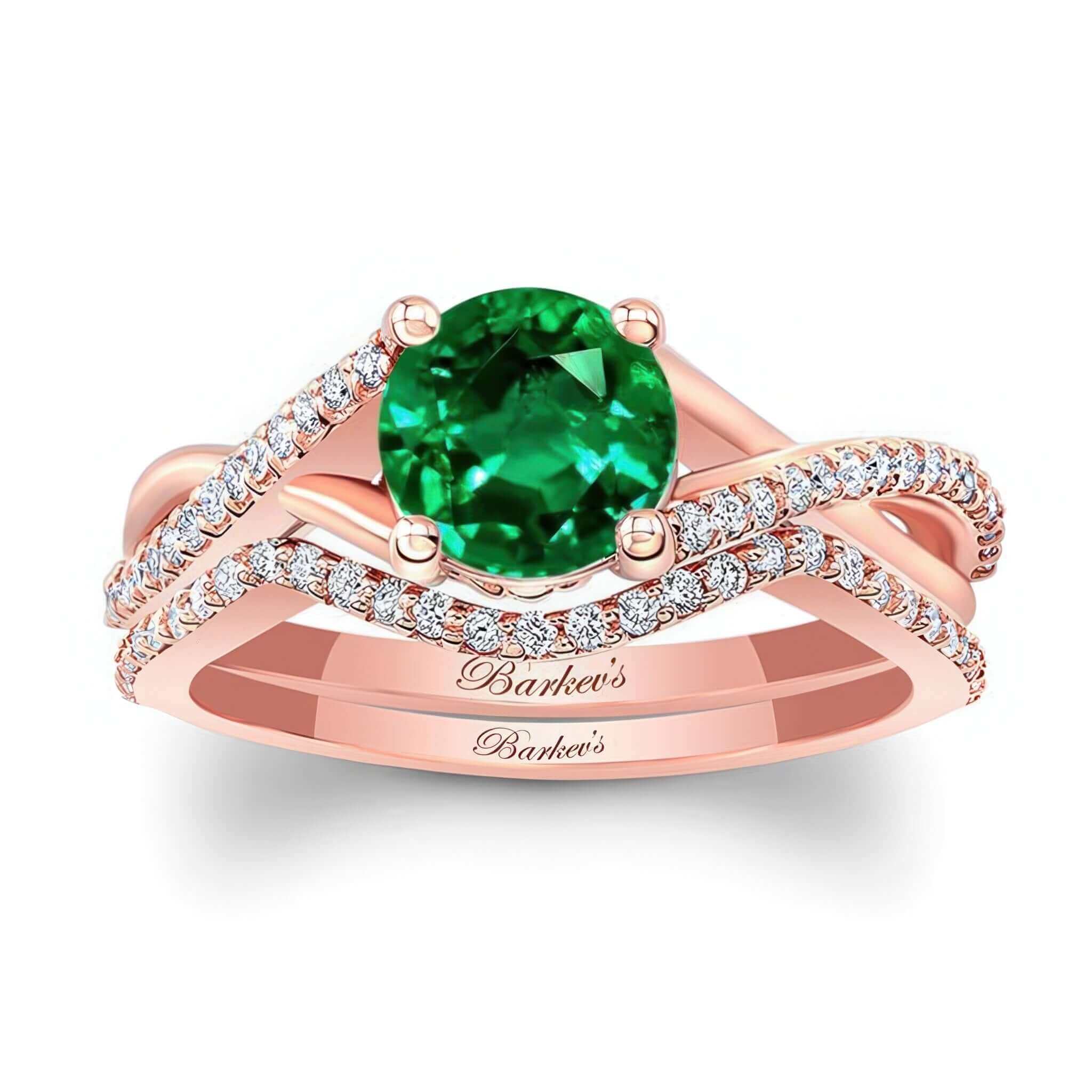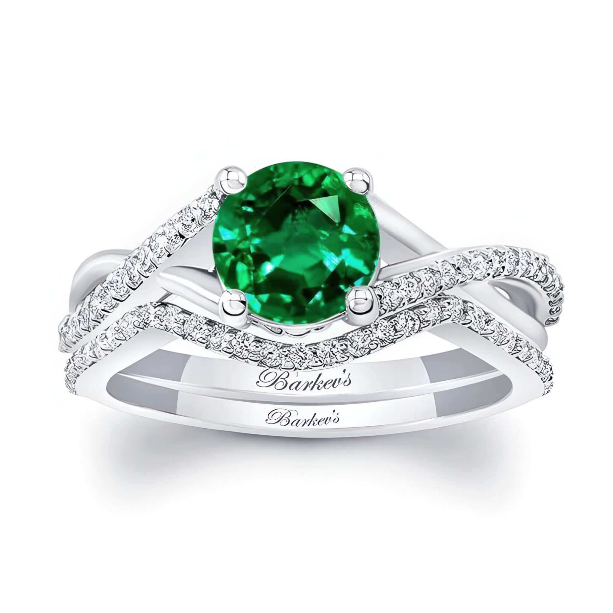 A simple one carat lab grown emerald and diamond bridal set featuring a round center, a criss crossing split shank and shared prong diamonds on the sides. Comes with a matching wedding band.