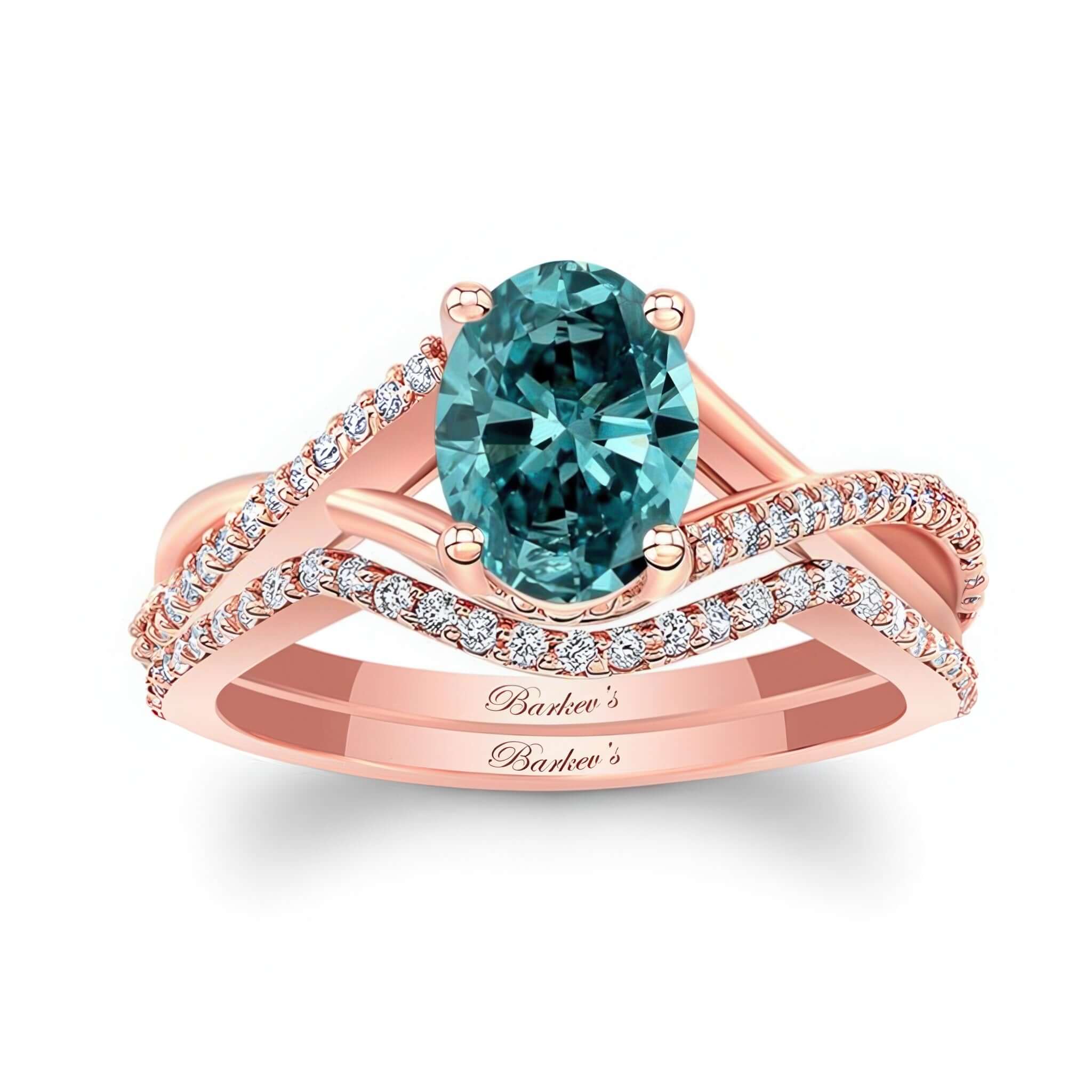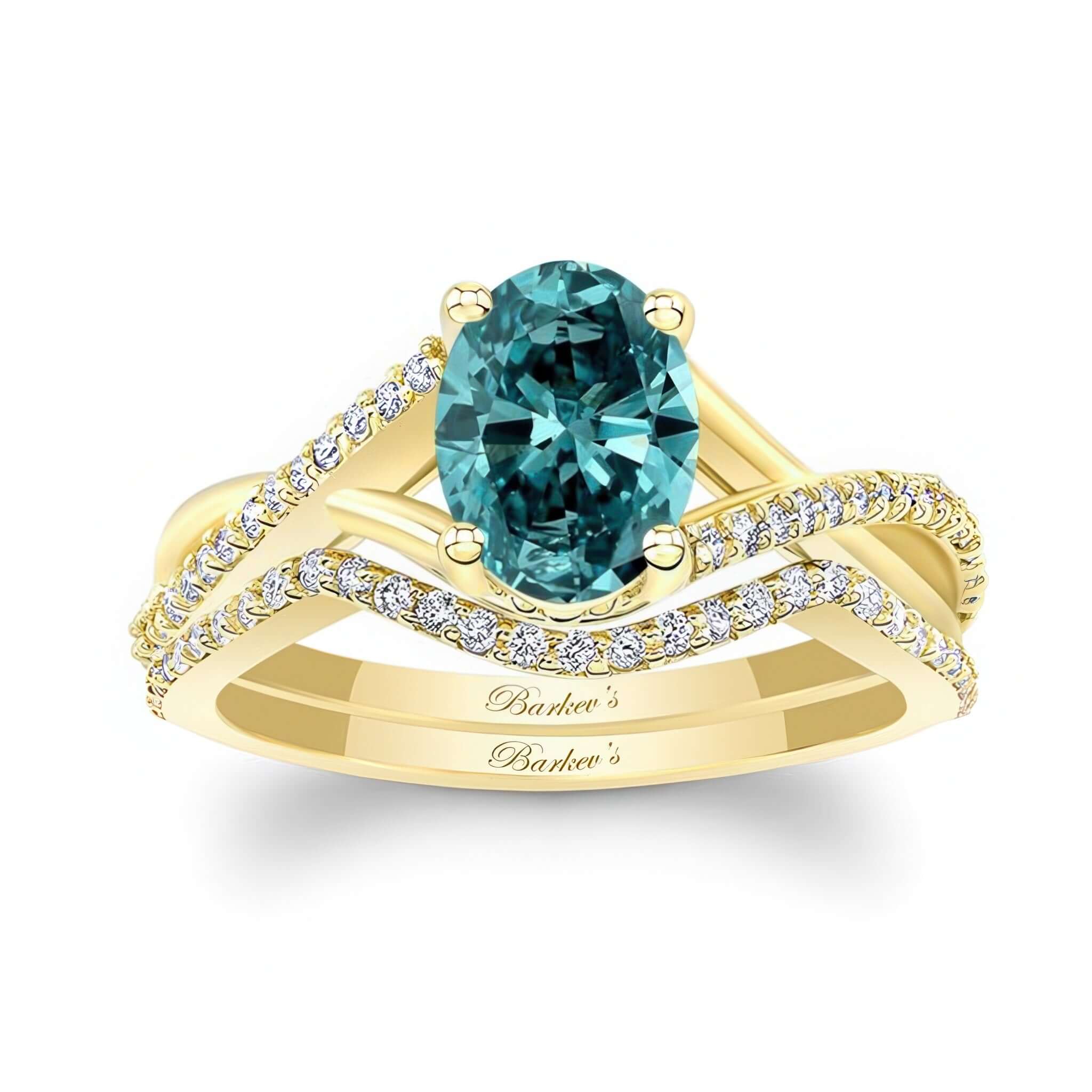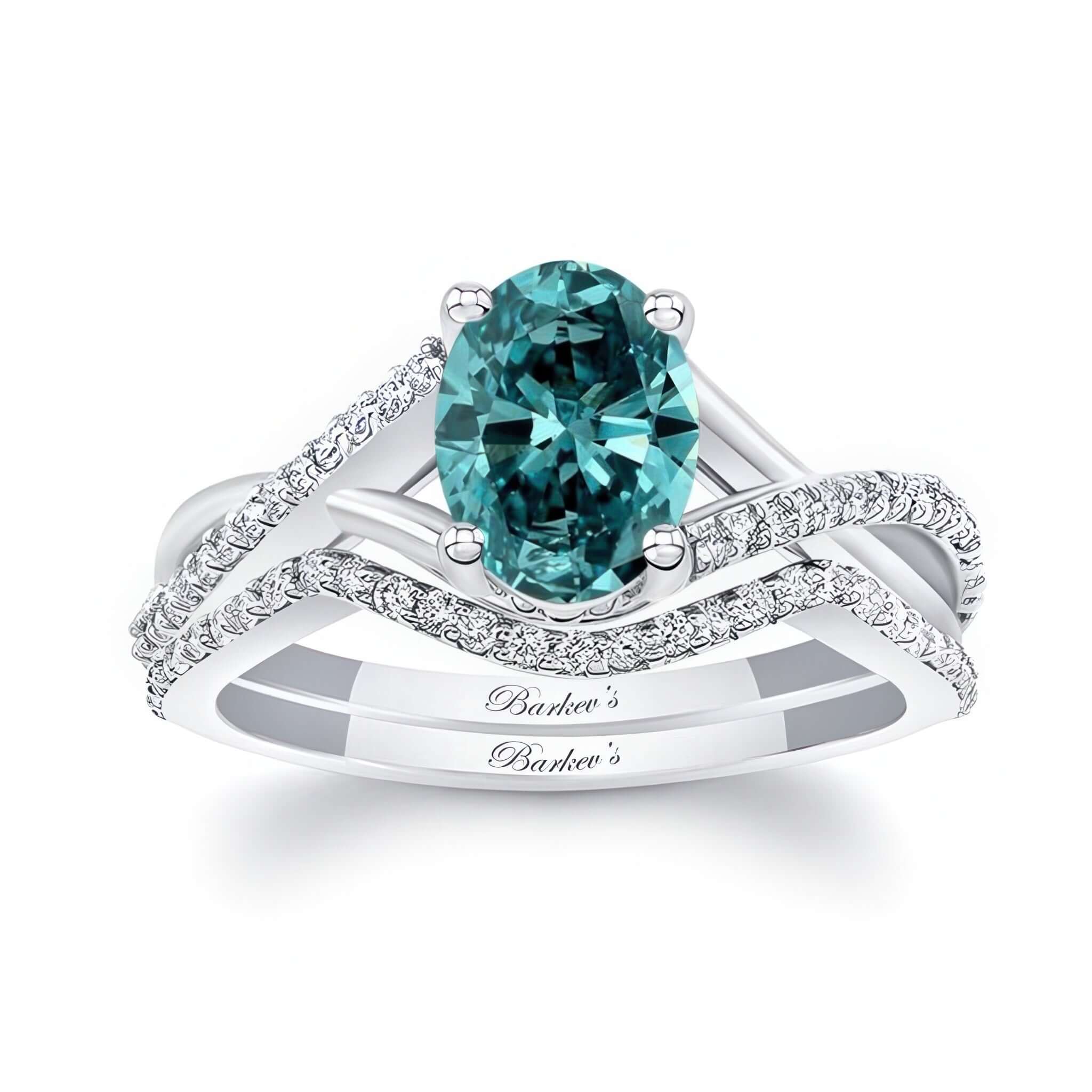 A simple one carat oval blue and white diamond bridal set featuring an oval center, a criss crossing split shank and shared prong diamonds on the sides. Comes with a matching wedding band.