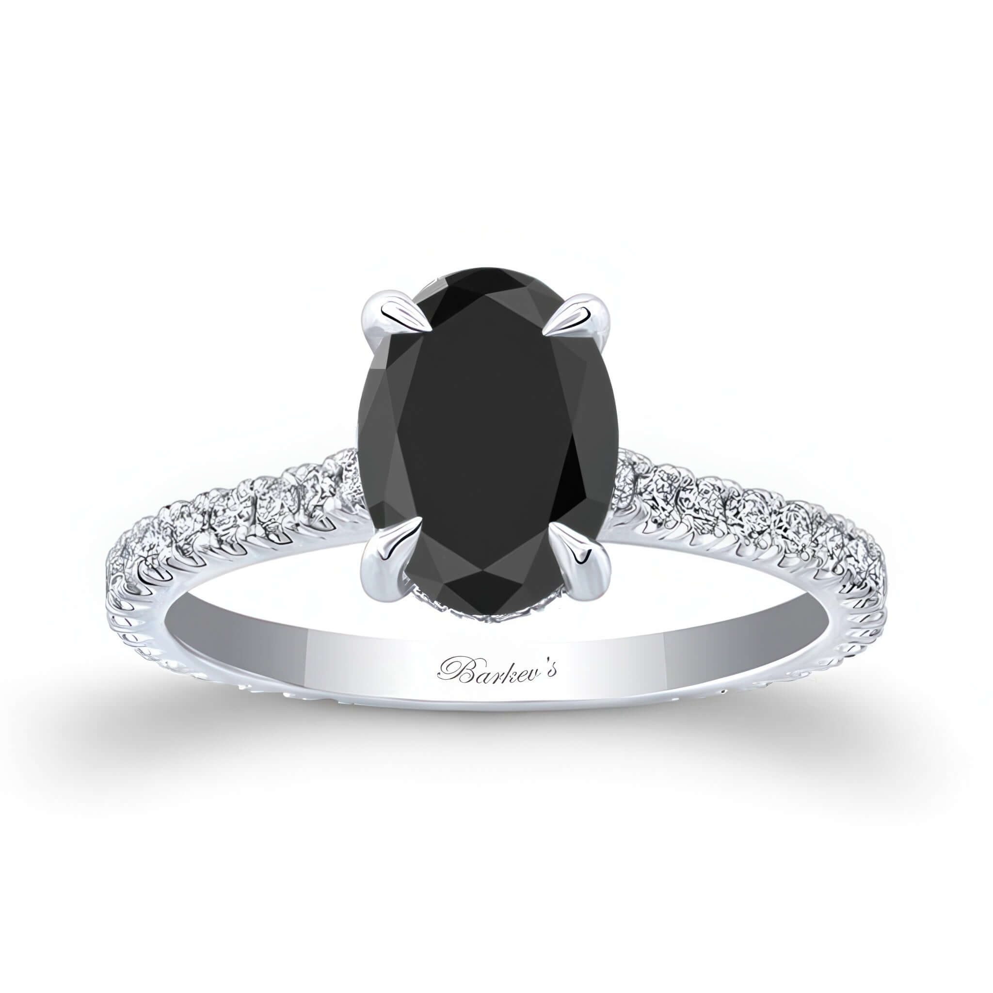 A beautiful oval black and white diamond engagement ring with hidden halo featuring brilliant diamonds that surround the prong set oval center just underneath it and more pave set diamonds flowing down the shank.