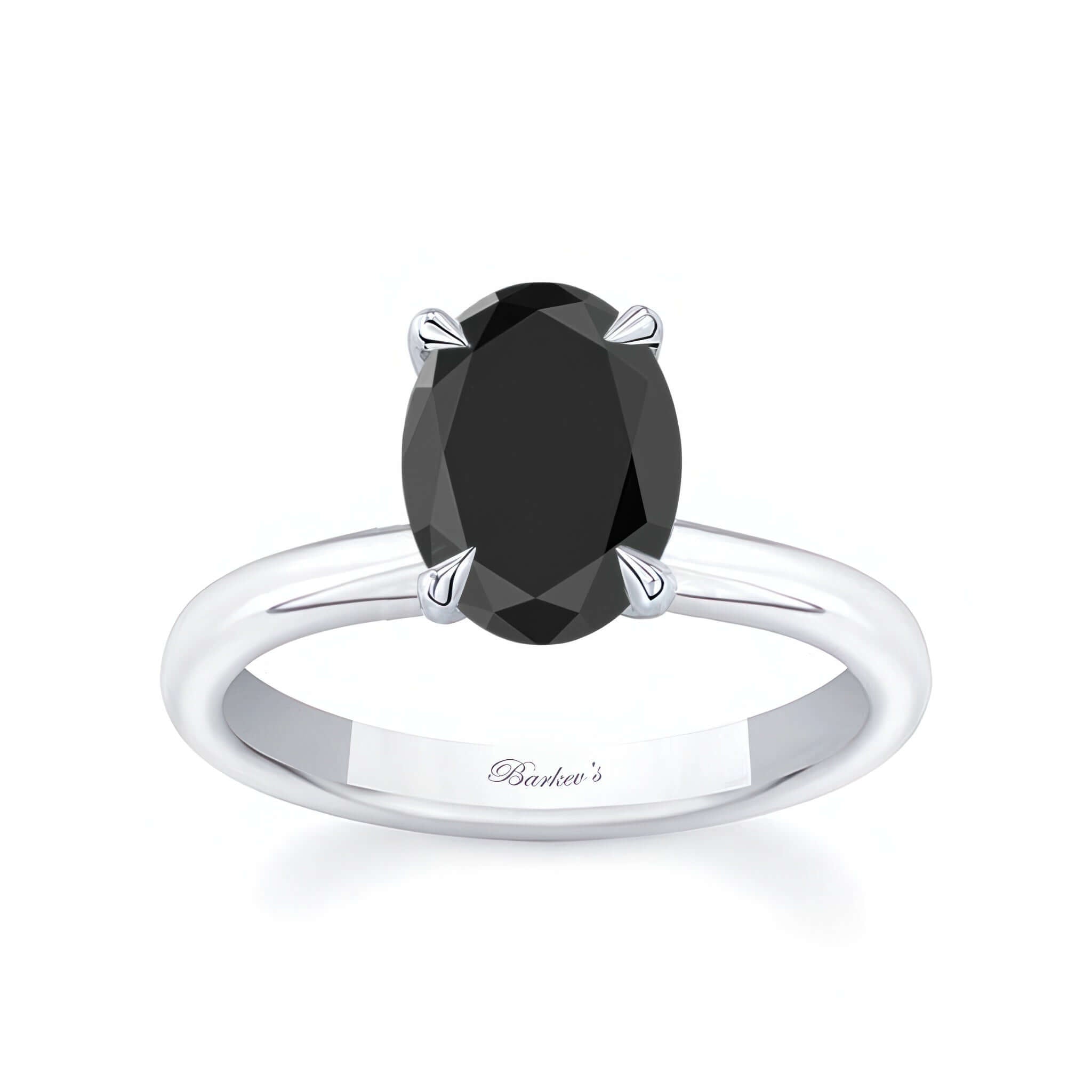 An oval black diamond solitaire engagement ring featuring a prong set oval center with a simple and elegant solitaire design.