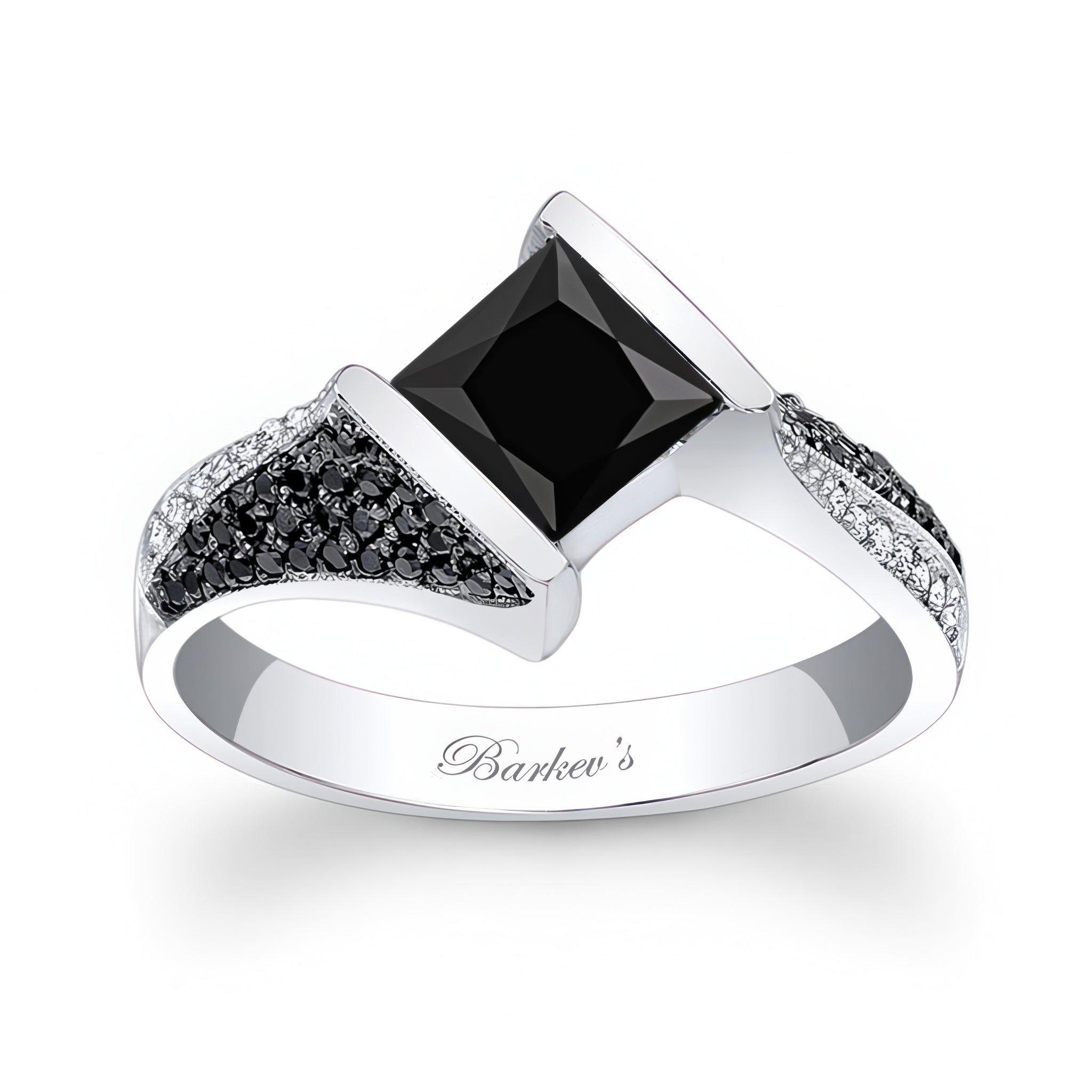 This pave princess cut black diamond ring features a channel set center with pave set black and white diamonds on the shoulders for a dramatic look of vogue.