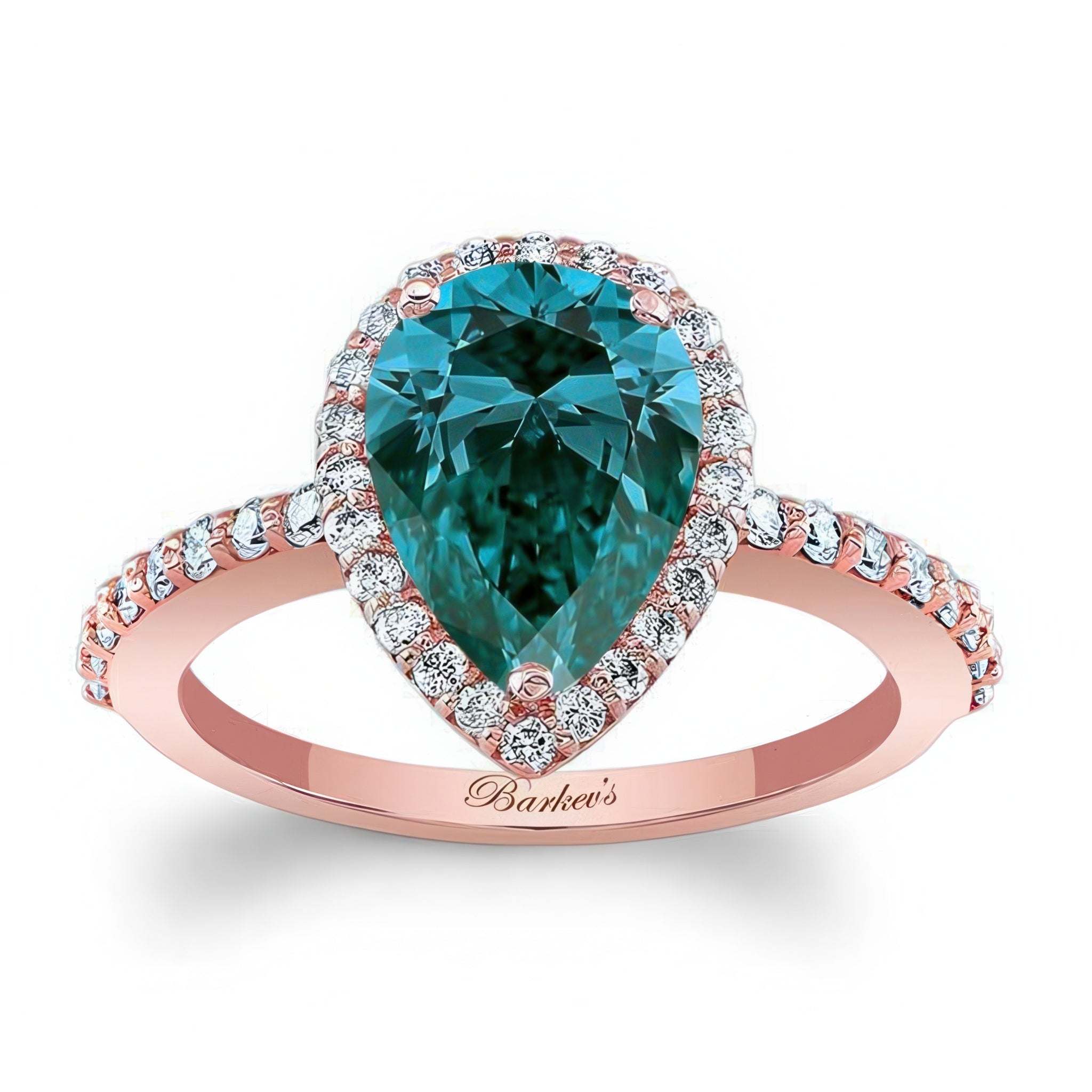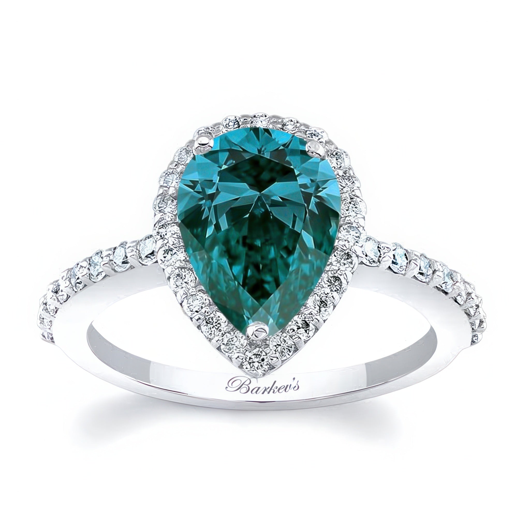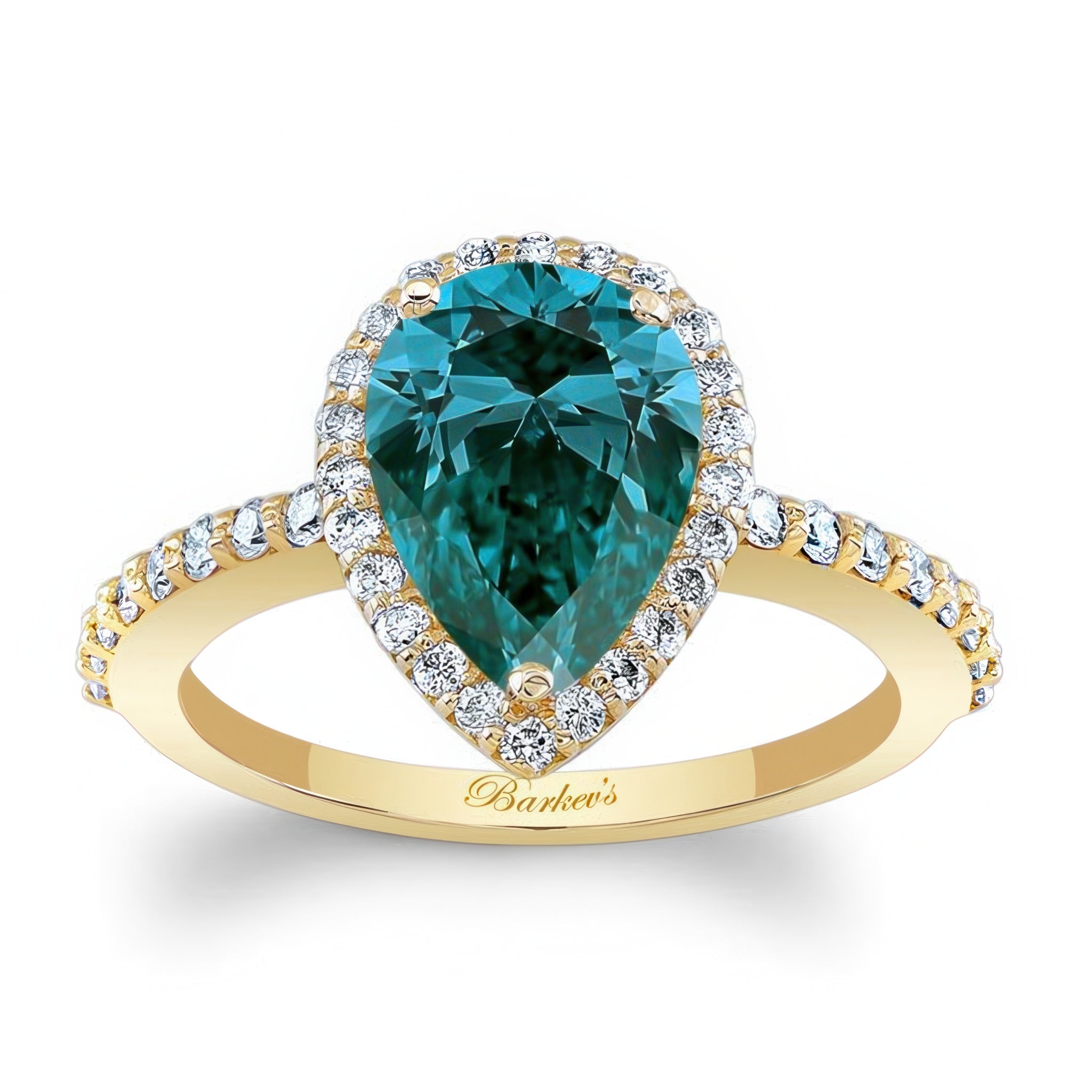 This pear shaped blue and white diamond ring is both stunning and in vogue. Featuring a 2 carat center with a halo of diamonds encircling it and cascading down the dainty shank for a look of sheer elegance.